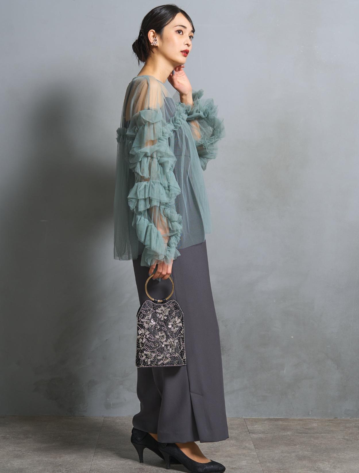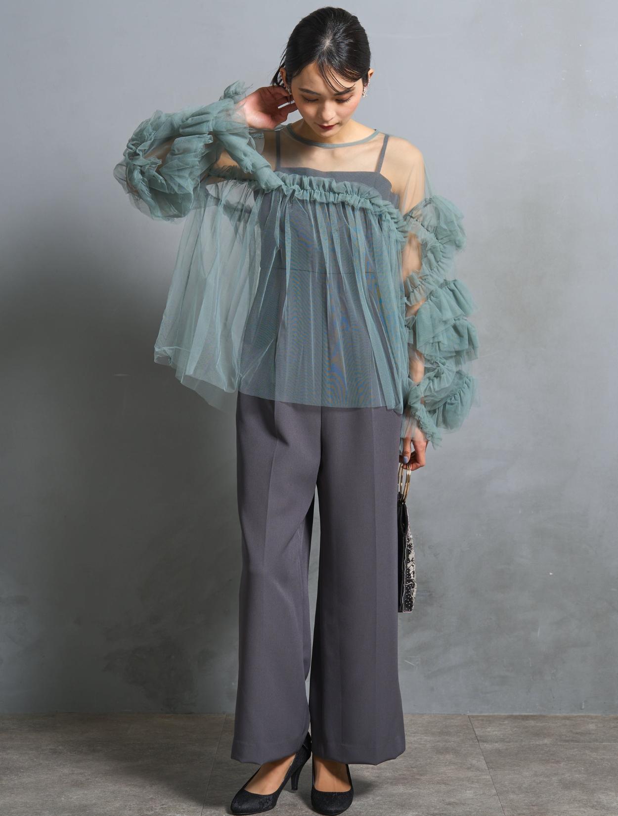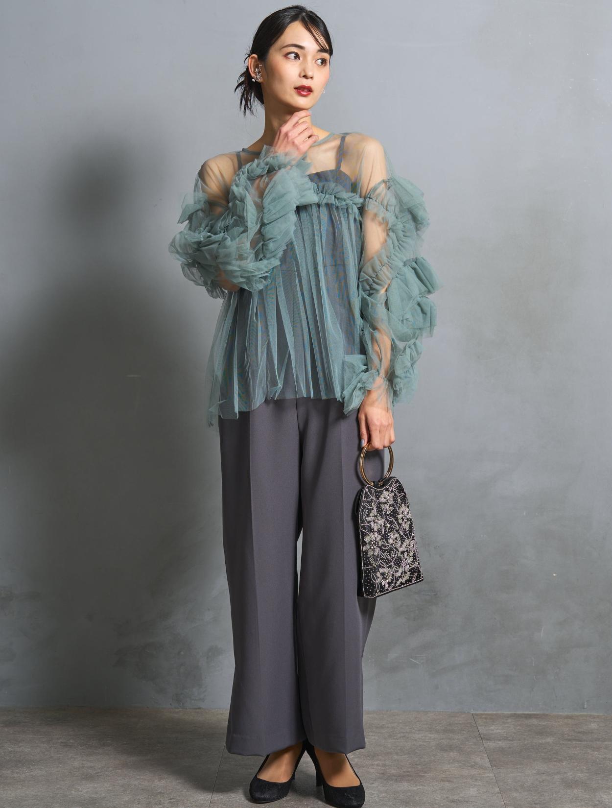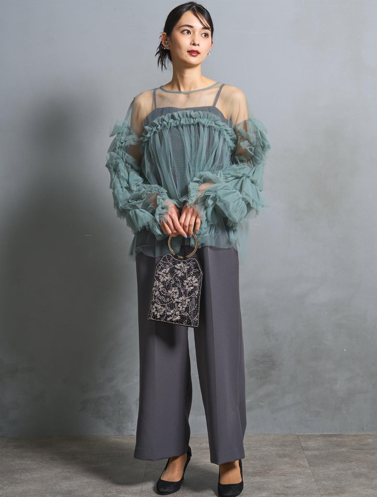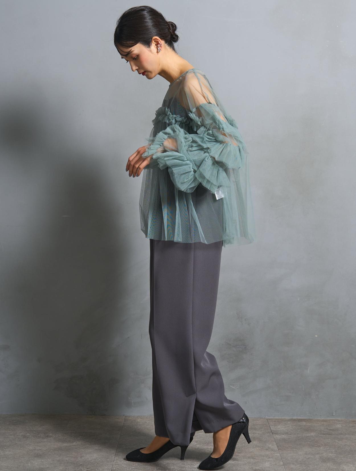 ウェーブ状に配置されたボリュームたっぷりのチュールフリルの袖は、デコラティブでシンプルなパンツドレスとの相性抜群。袖口にゴムが入っているので、お食事の時でも安心です。あえて袖をたくし上げて、さらにボリューミーな袖を楽しむのもおすすめの着こなし。オーバーサイズのデザインですが、軽くて透け感のある素材は着膨れせずに着られます。ブラウスの着丈は前後差があり、後ろ側はふんわりヒップが隠れる丈で安心感もあります。