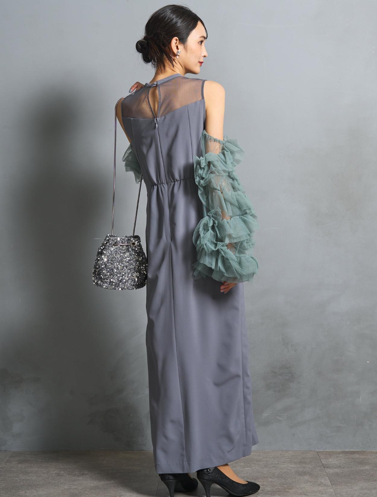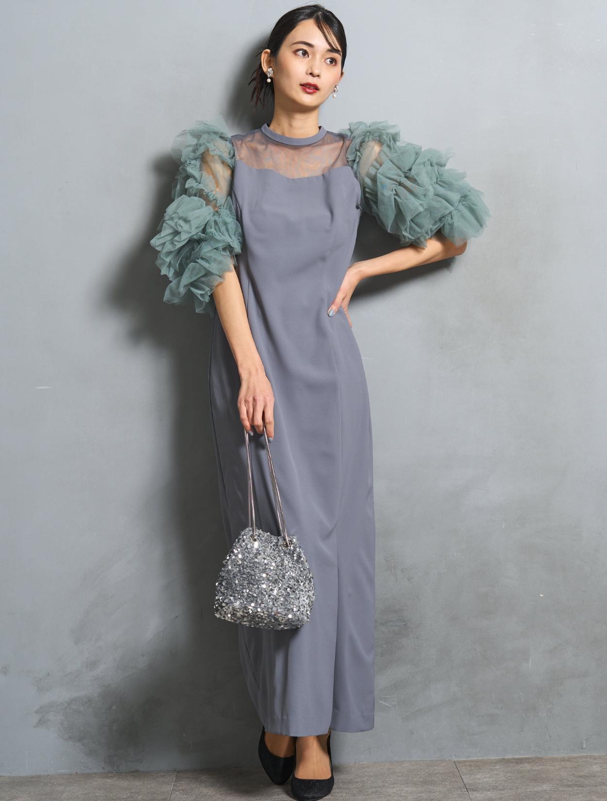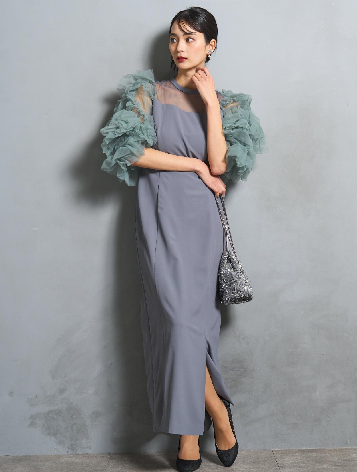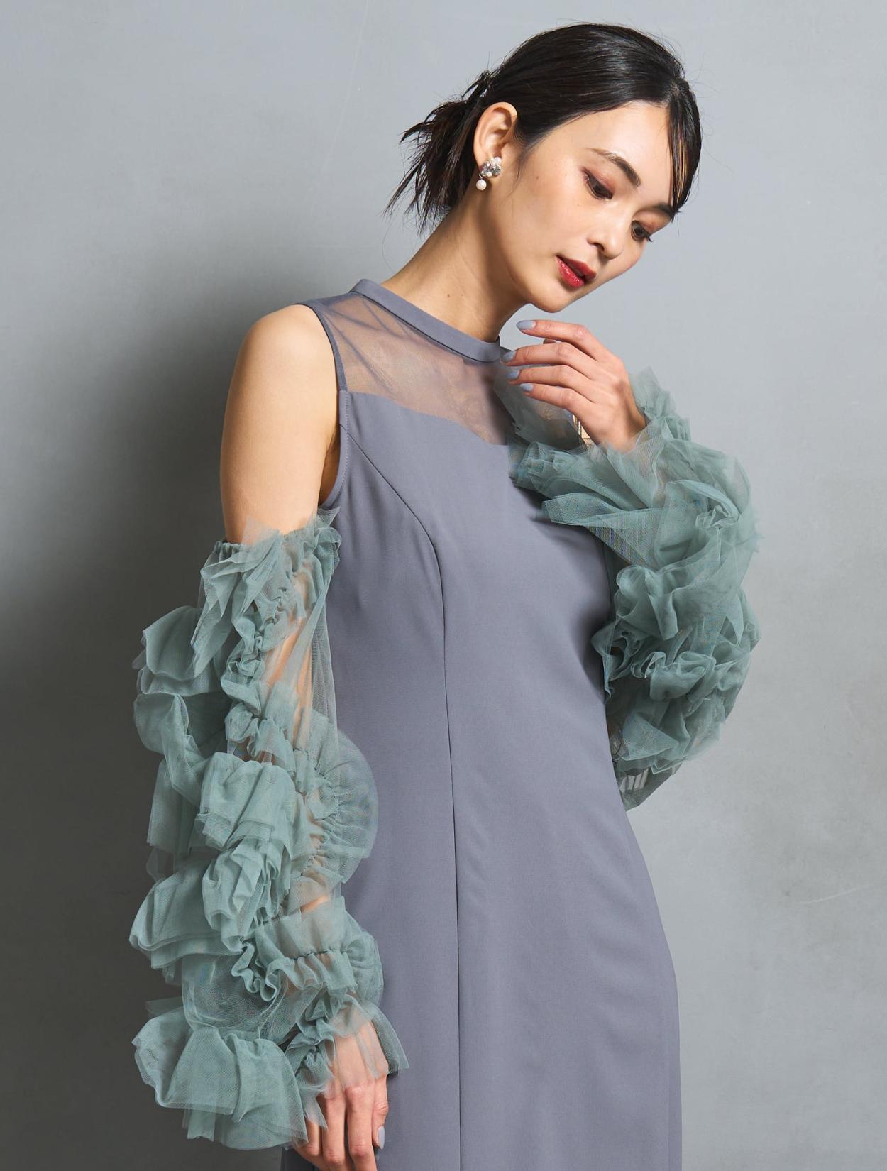 ワンピースは、モーヴブルーを感じる上品なブルーグレーカラー。袖のチュールは、南国の海の様な透明感のあるアクアグリーン。大人っぽさと個性が同居する絶妙なカラーバランスです。遊び心ある大人女子に人気。