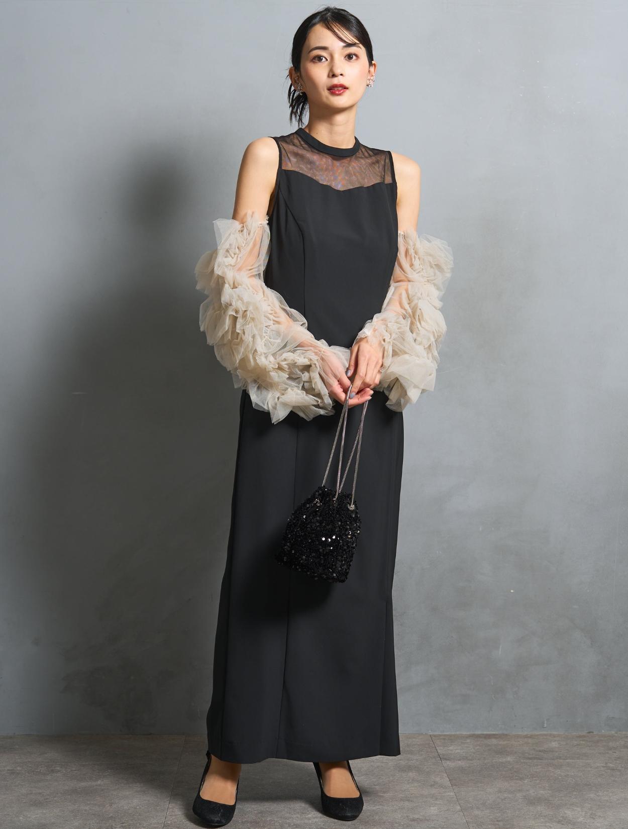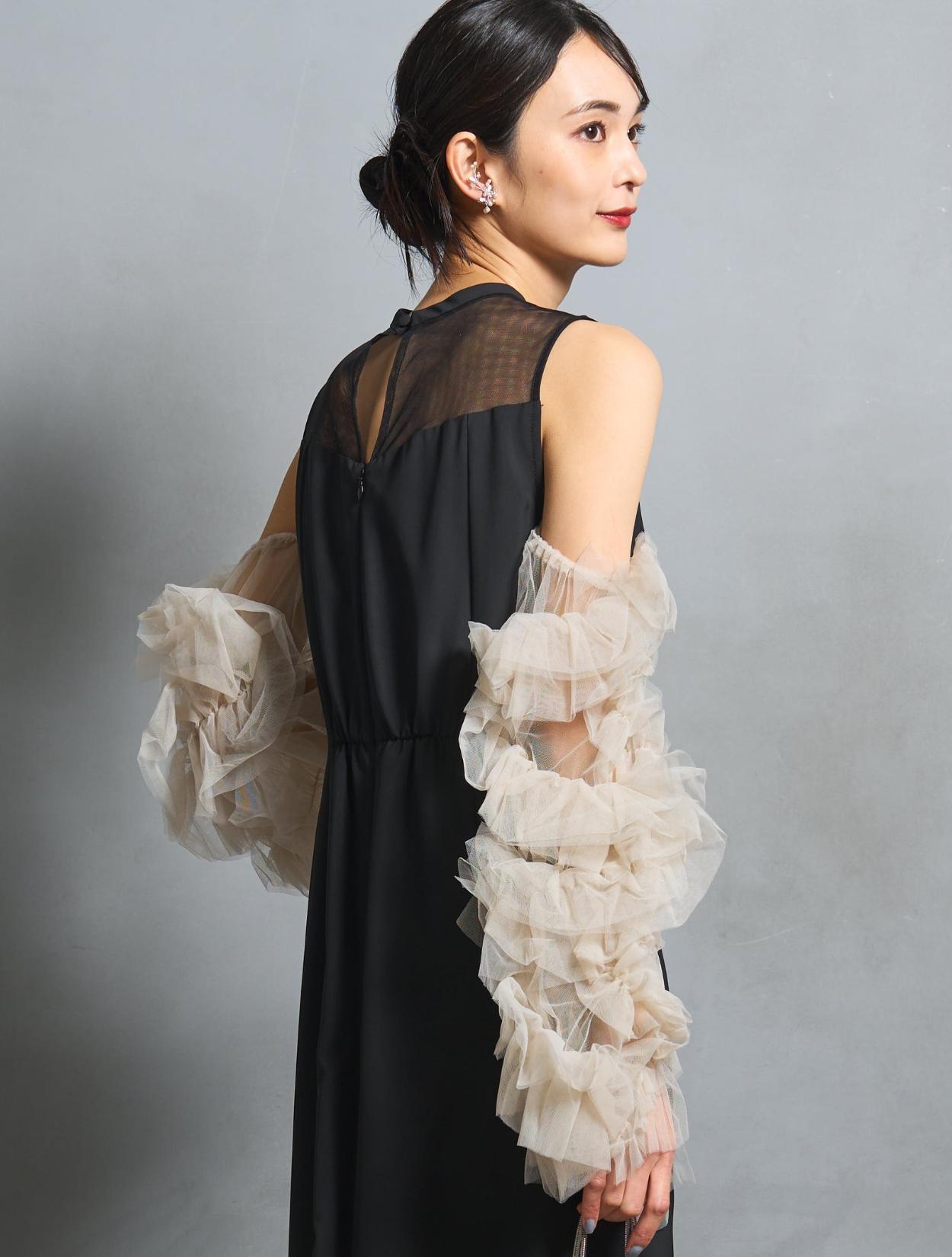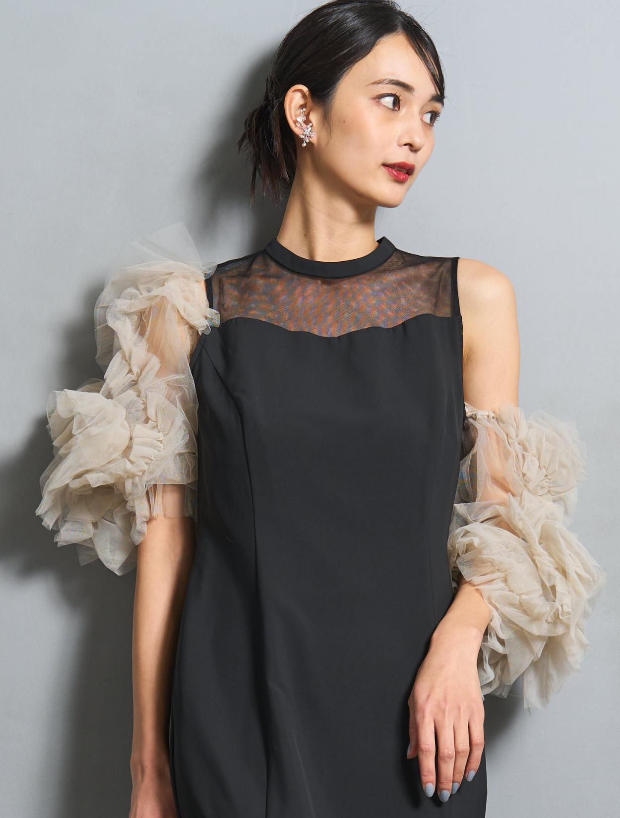 ワンピースは、シックながら艶感のあるブラック。袖のチュールは、黄色味が控えめなミルキーベージュ。シャープなブラックドレスを、ミルクで中和させたようなまろやかなカラーバランスが人気です。