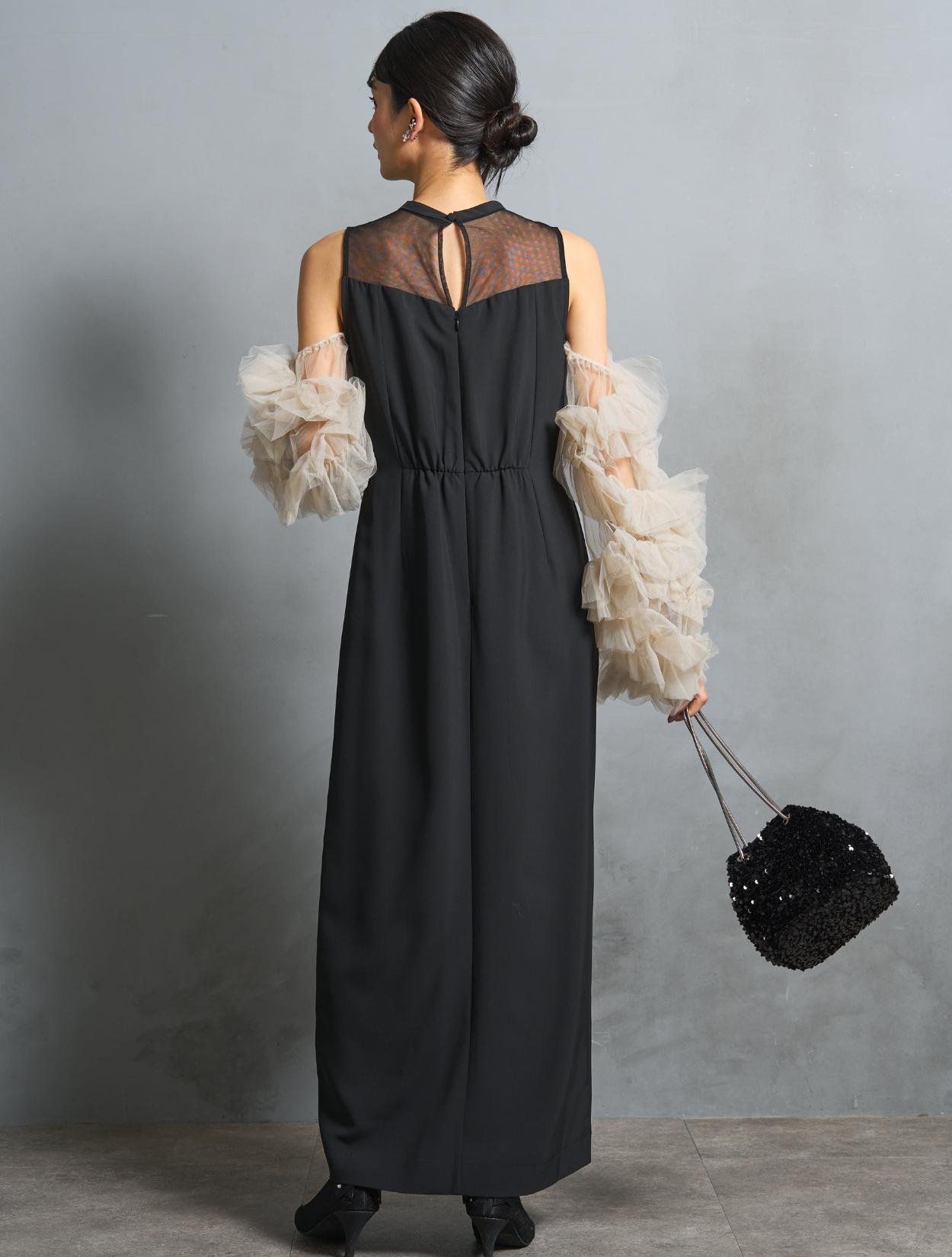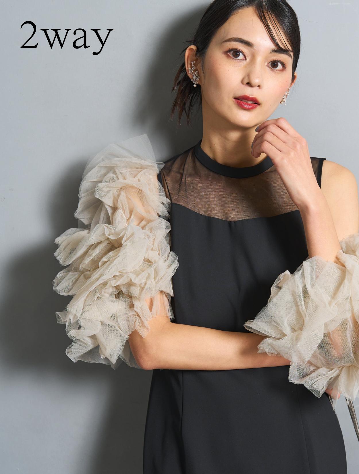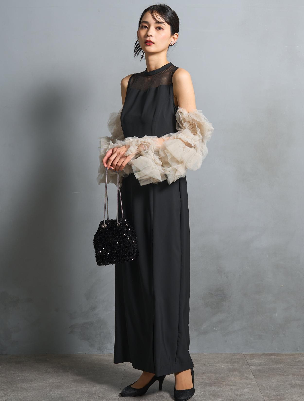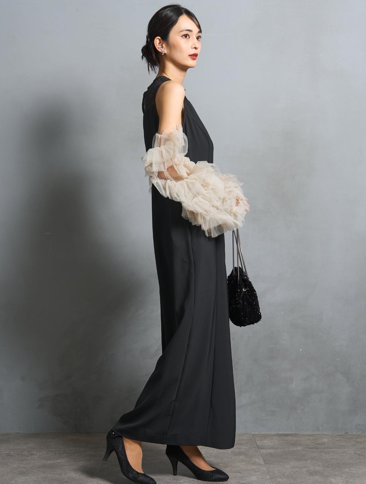 ワンピースは、シックながら艶感のあるブラック。袖のチュールは、黄色味が控えめなミルキーベージュ。シャープなブラックドレスを、ミルクで中和させたようなまろやかなカラーバランスが人気です。