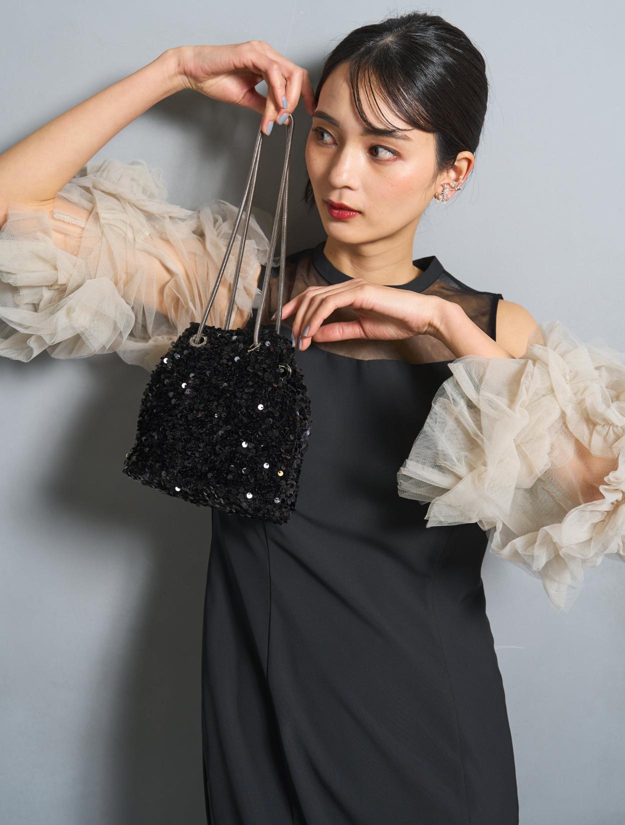 ブラックのスパンコールバッグを合わせた、頑張りすぎないトレンド感のあるコーディネート。シックにブラックでまとめているので、袖のデザインが引き立ちます。主張し過ぎないワイヤーイヤリングもおしゃれです。結婚式はもちろん、デートやお食事、女子会等にもおすすめのコーディネートです。