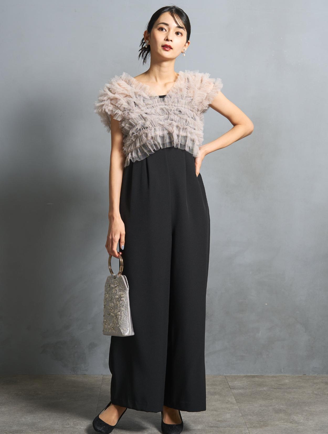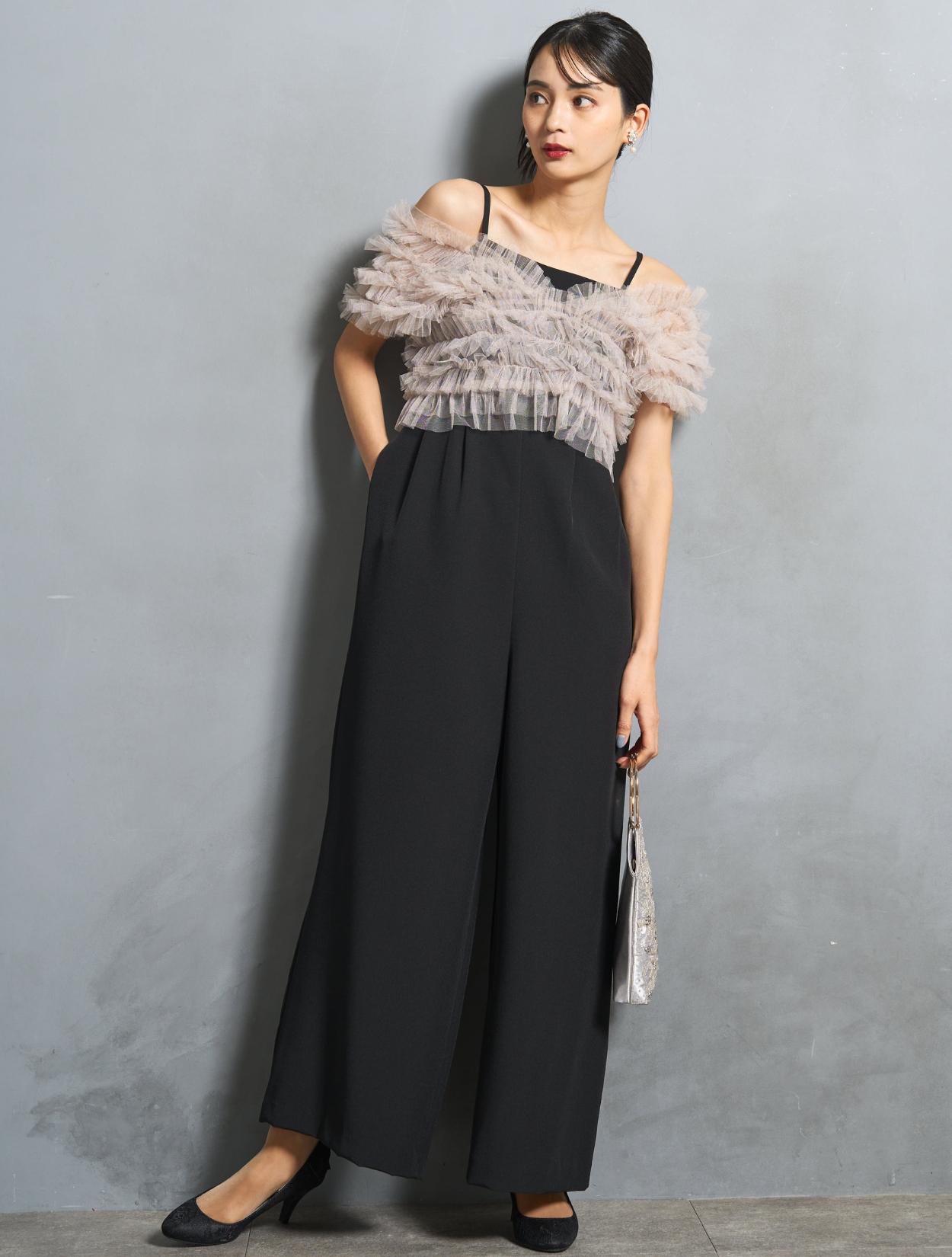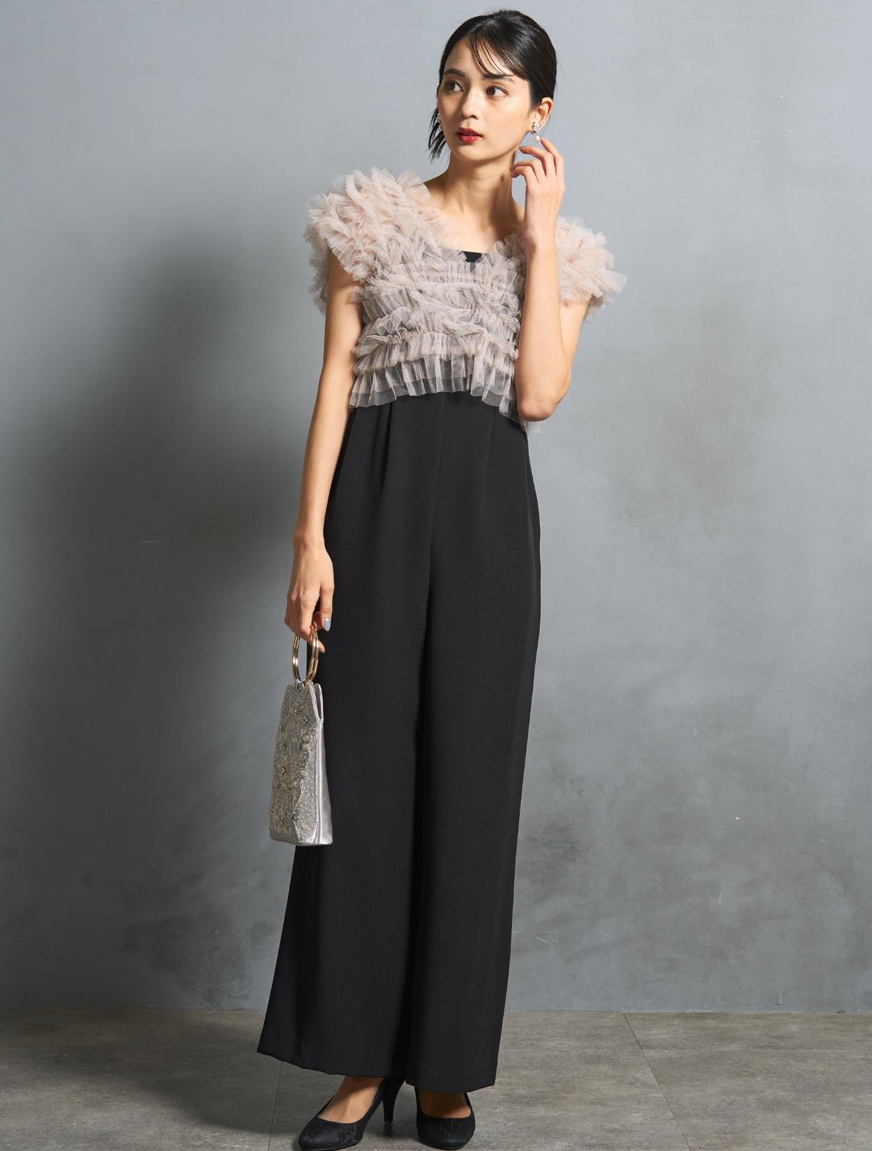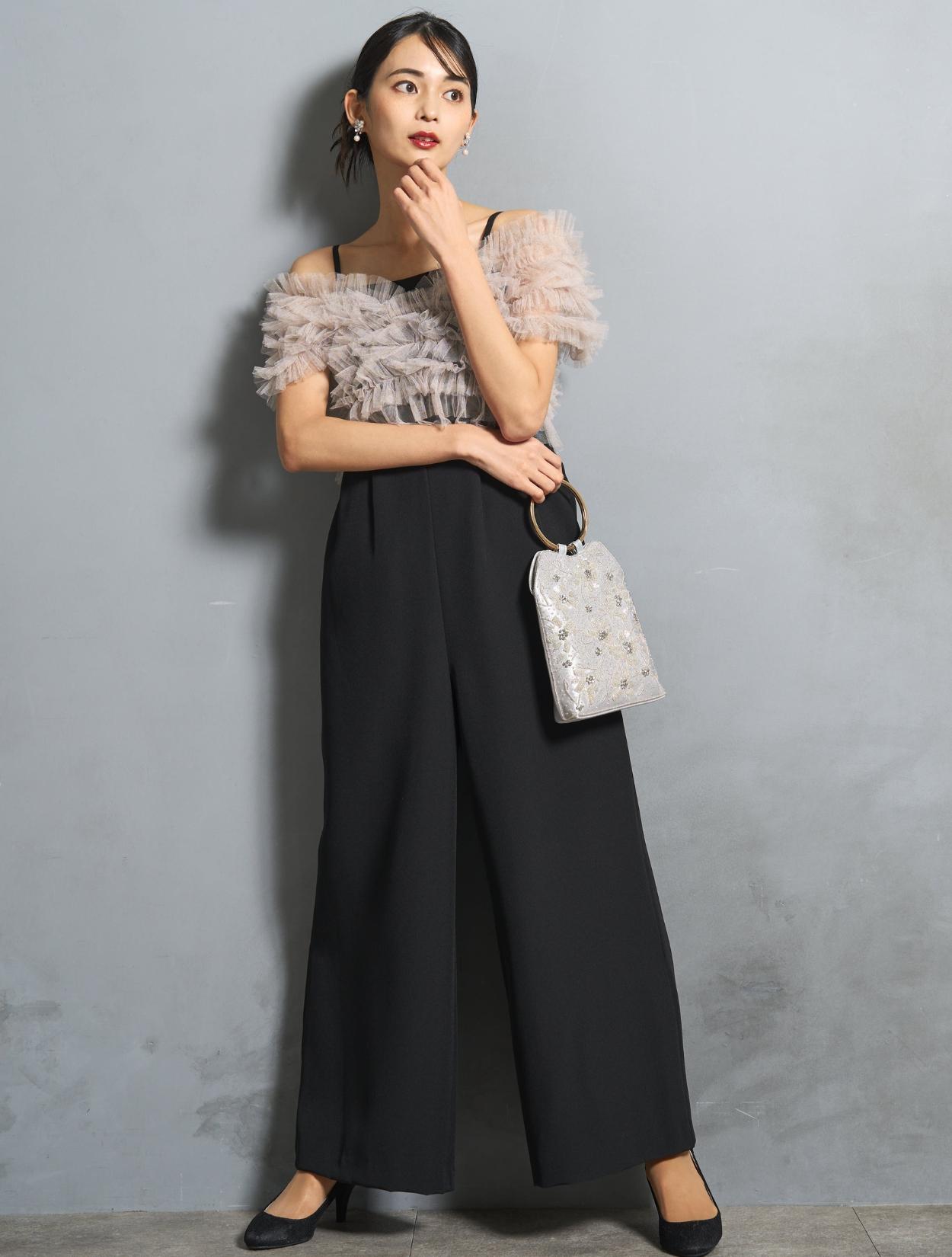 パンツは、キャミソールのオールインワンタイプ。背中部分はゴムになっていて着心地も◎。肩紐で着丈の調節が可能です。オールインワンの高い位置に切り替えが入っていて、スタイルアップ効果あり。切り替えからさりげなく入ったタックは、腰回りをカバーしつつ、たっぷりしたラインが高級感を演出。カジュアルに見えない、結婚式やパーティーにぴったりなパンツスタイルです。