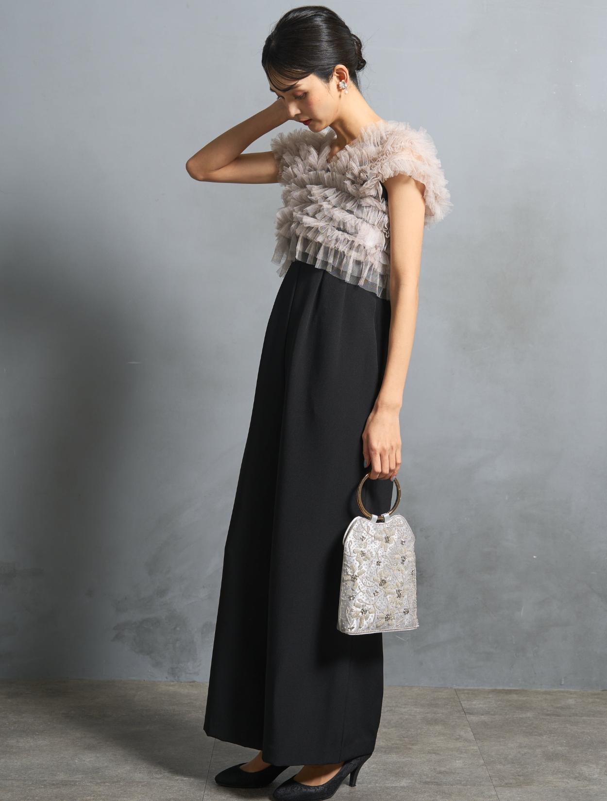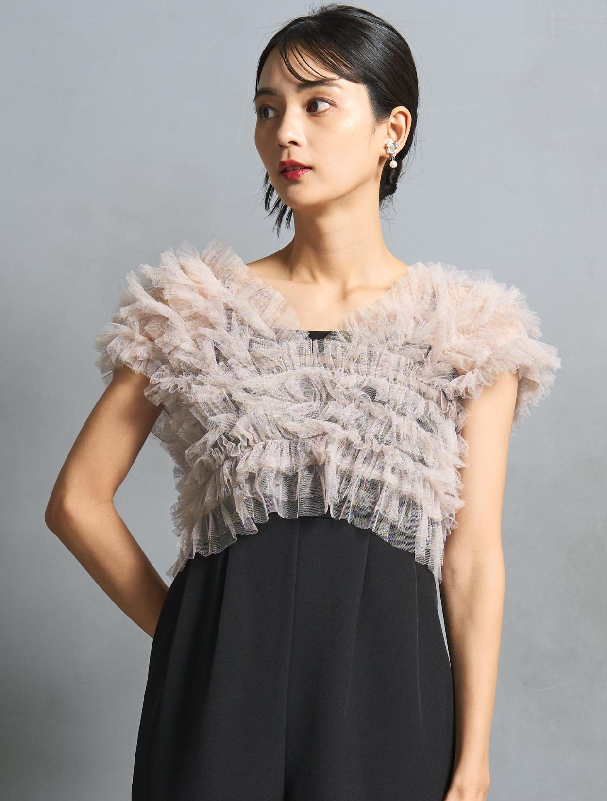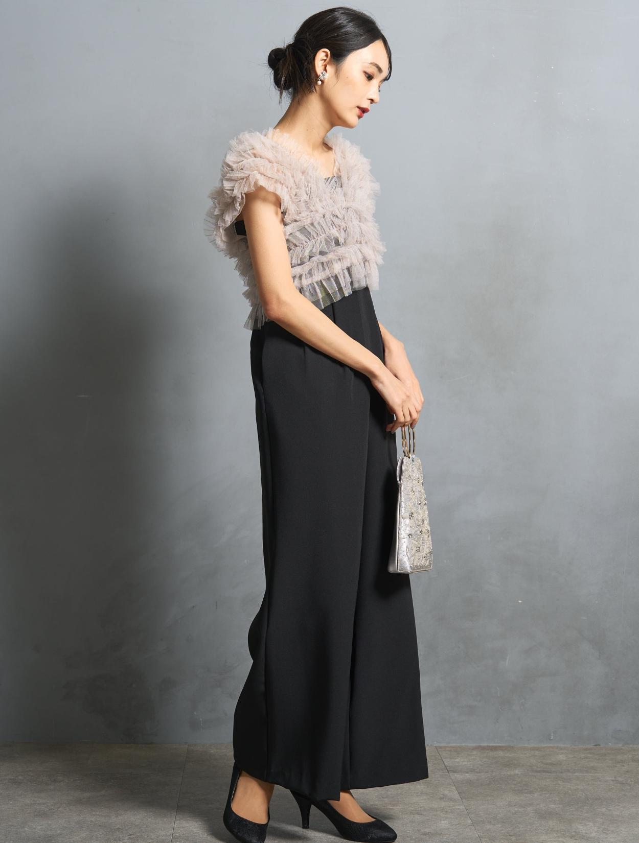 チュールトップスとオールイワンがセットになったパンツドレス。(「ドレスのみ」のご注文で、チュールトップスとオールインワンがレンタルできます。)チュールトップスは、トレンドっぽい軽さがありながらも程よいボリューム感がポイント。柔らかいチュールで、着用時の肌触りも痛くありません。3wayで着こなしを楽しめるのもおすすめポイントです。ベストの様に着たり、オフショルスタイル、前開きにしてショートジレの様な着こなしもできます。フレンチスリーブ仕様なので、オフショル以外では肩が隠れるデザインです。結婚式で一枚で着てもマナー違反ではないので安心してくださいね。腕を露出したくない方には、インナーブラウス付きのセットもあります。(インナーブラウス型番「LDP000205」)