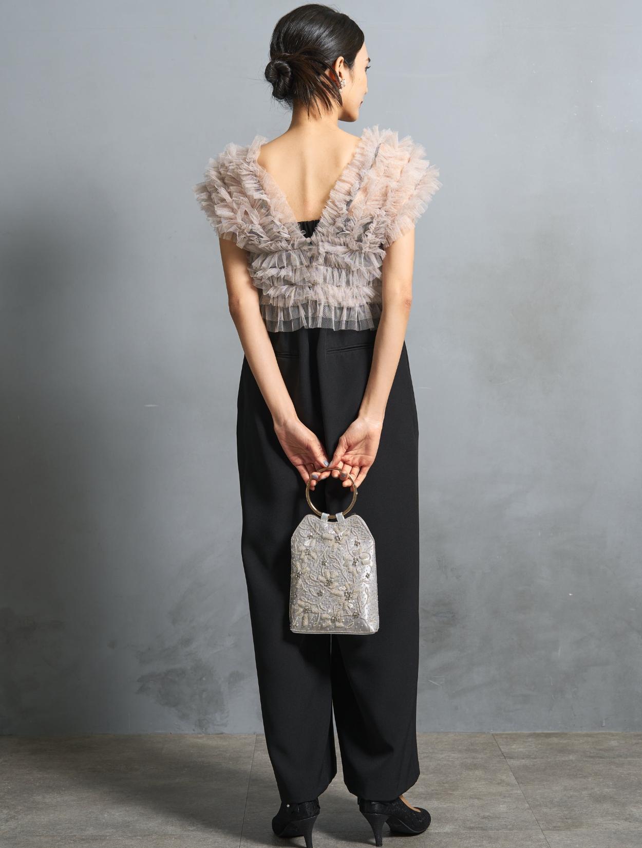 チュールトップスのグレーに合わせたシルバーの刺繍バッグで、すっきり清涼感のある上品な着こなしになります。友人の結婚式におすすめのコーディネートです。パールビジューのイヤリングもフォーマル感がアップするアイテム。トレンドのパンツスタイルは、結婚式はもちろん、デートやお食事会・女子会等のご利用もおすすめです。