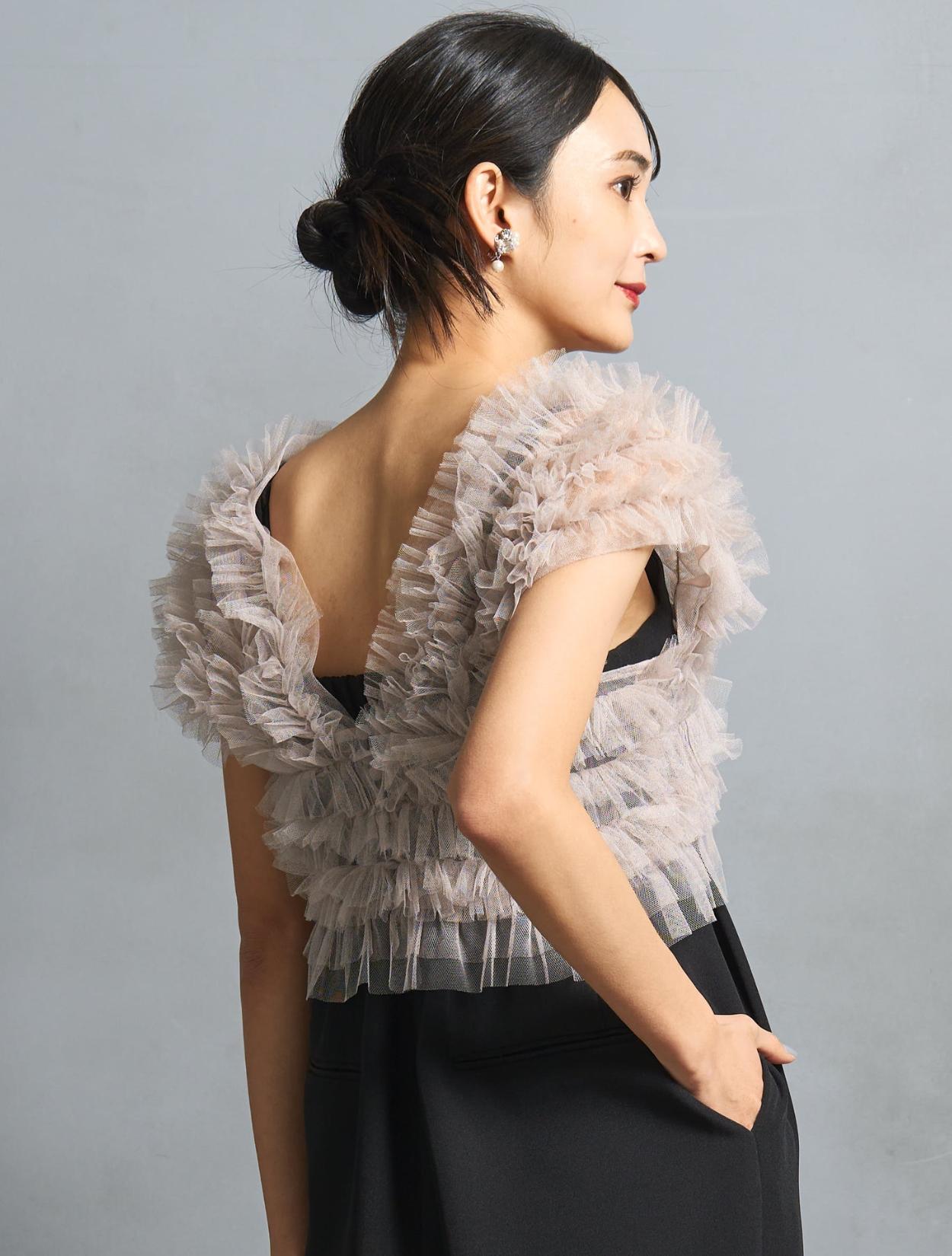 チュールトップスが主役のドレス。ヘアスタイルはタイトにまとめると、チュールのボリュームとバランスが取りやすいです。タイトローシニヨンもおすすめですし、背中の開きがちょっと気になる…という方には、編み下ろしスタイルやローポニーがカバーできておすすめです。チュールトップスは前開きタイプですので、ヘアセットを崩さずにドレスの着脱ができます。※セットのインナーブラウスは被りです。インナーブラスを着る場合は、着た状態でのヘアセットがおすすめです。