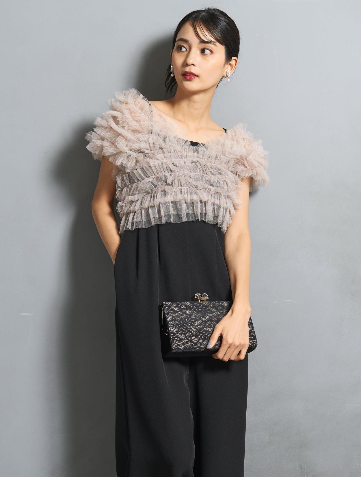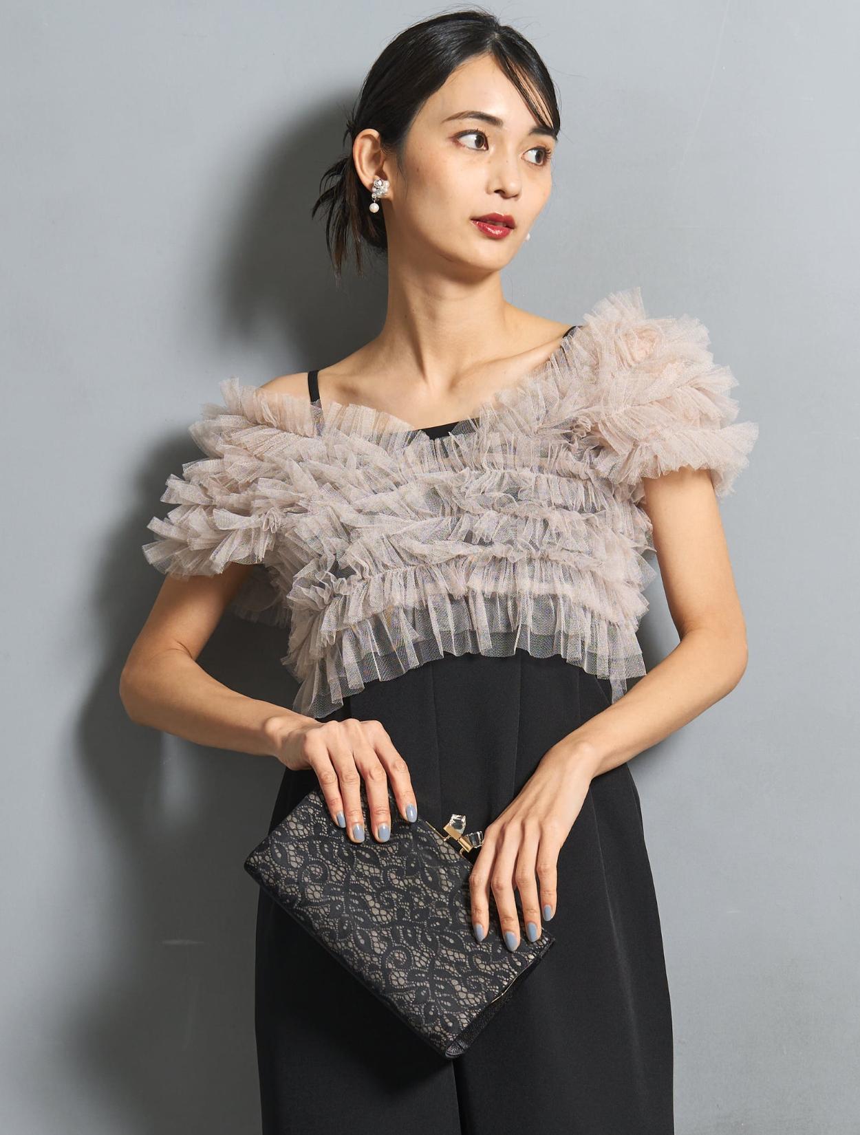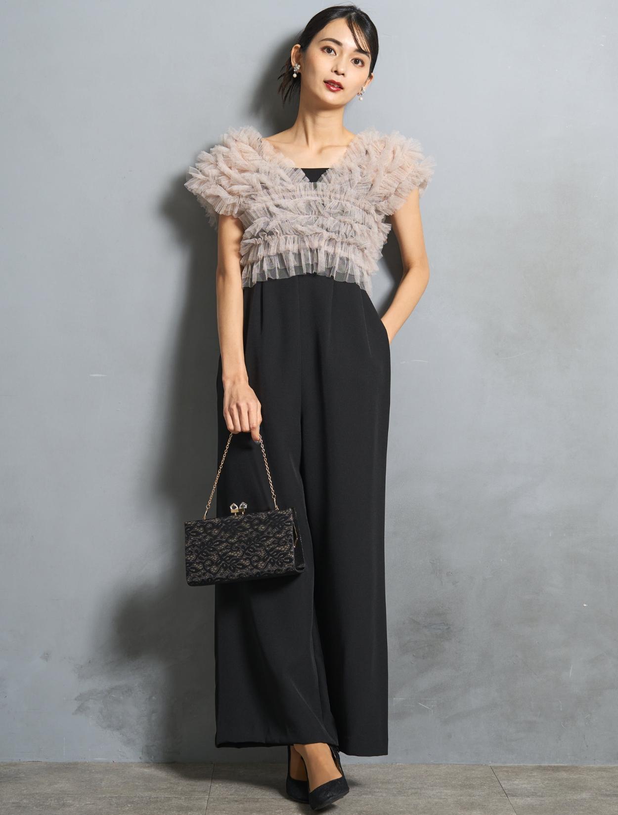 オールインワンと同色のブラックバッグを合わせてシックで大人っぽい印象に。レースのバッグは、トレンド感のあるパンツスタイルをクラシカルな雰囲気にしてくれるので、結婚式お呼ばれのパンツスタイルにおすすめのアイテムです。パールのビジューイヤリングでお顔回りは華やかなパーティー仕様になるので写真写りも◎。