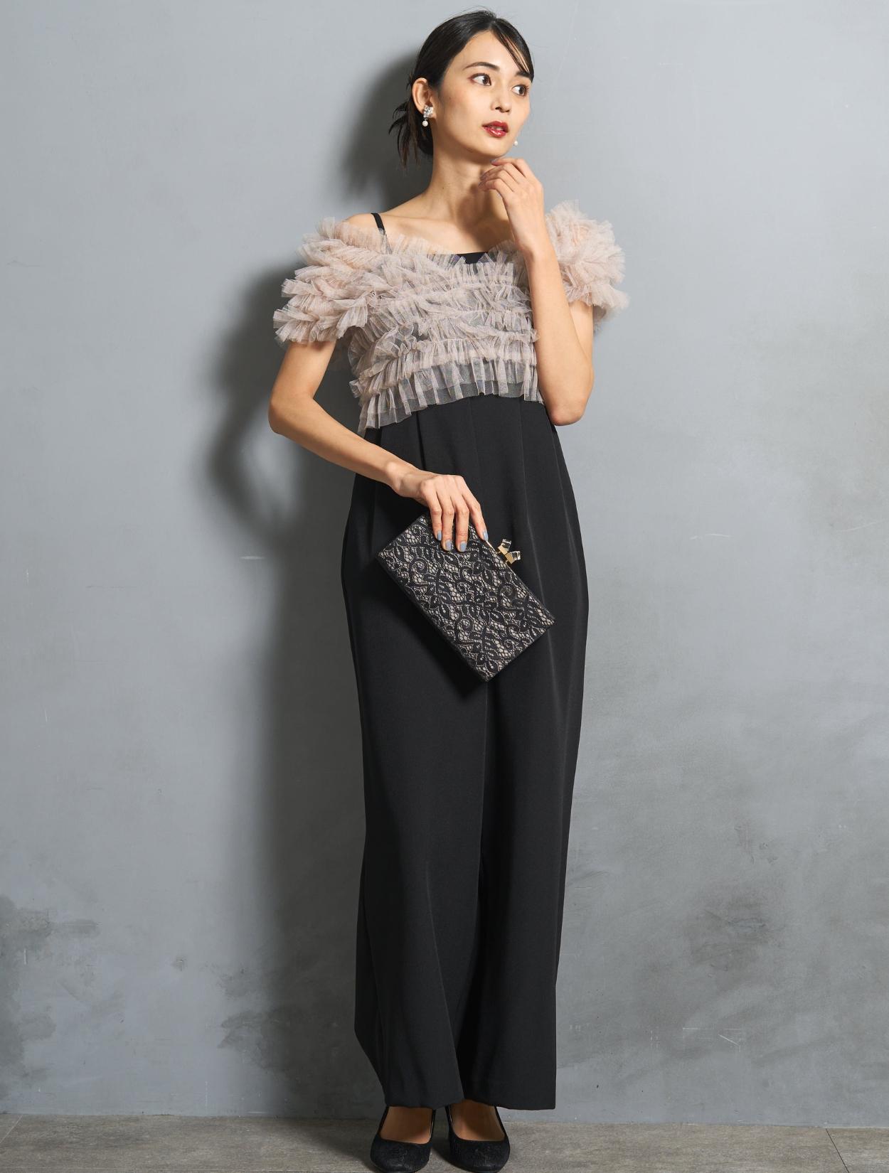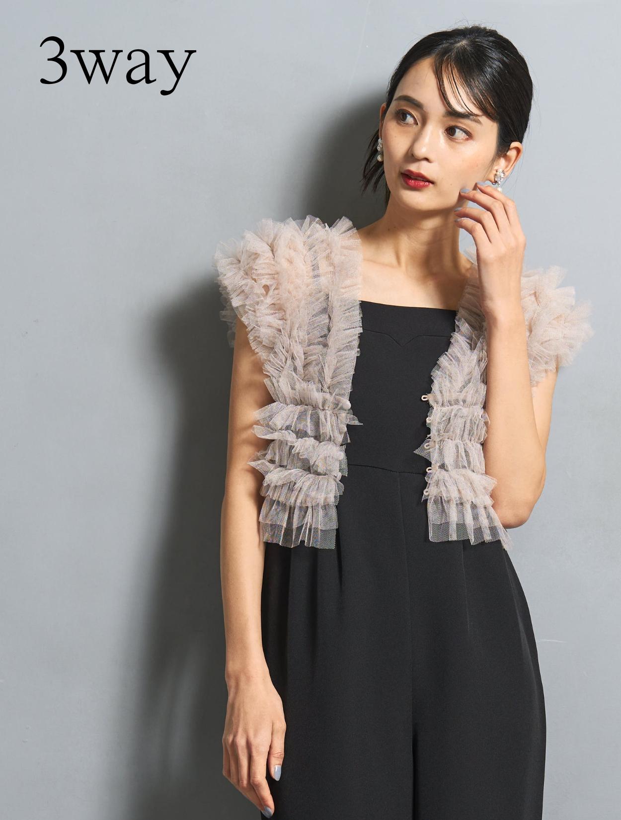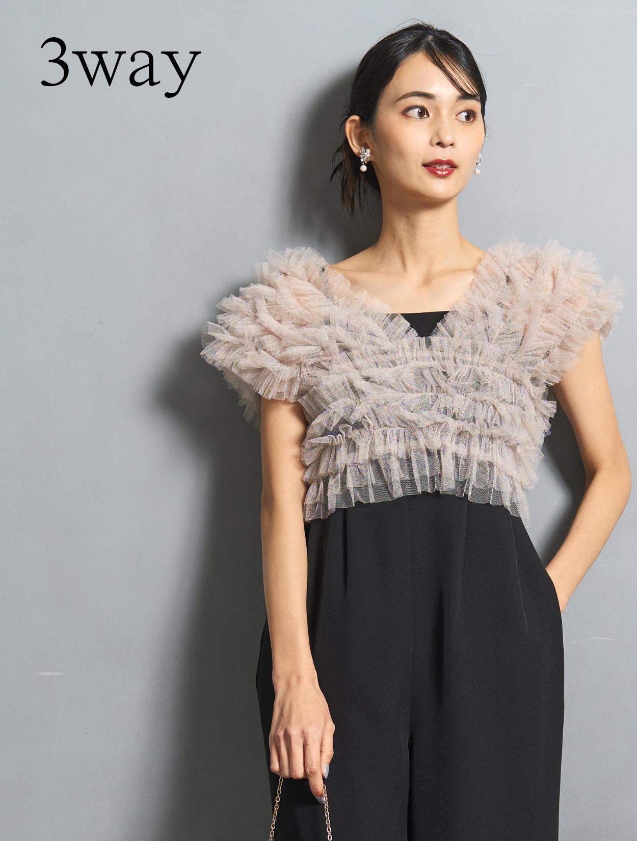 チュールトップスとオールイワンがセットになったパンツドレス。(「ドレスのみ」のご注文で、チュールトップスとオールインワンがレンタルできます。)チュールトップスは、トレンドっぽい軽さがありながらも程よいボリューム感がポイント。柔らかいチュールで、着用時の肌触りも痛くありません。3wayで着こなしを楽しめるのもおすすめポイントです。ベストの様に着たり、オフショルスタイル、前開きにしてショートジレの様な着こなしもできます。フレンチスリーブ仕様なので、オフショル以外では肩が隠れるデザインです。結婚式で一枚で着てもマナー違反ではないので安心してくださいね。腕を露出したくない方には、インナーブラウス付きのセットもあります。(インナーブラウス型番「LDP000205」)