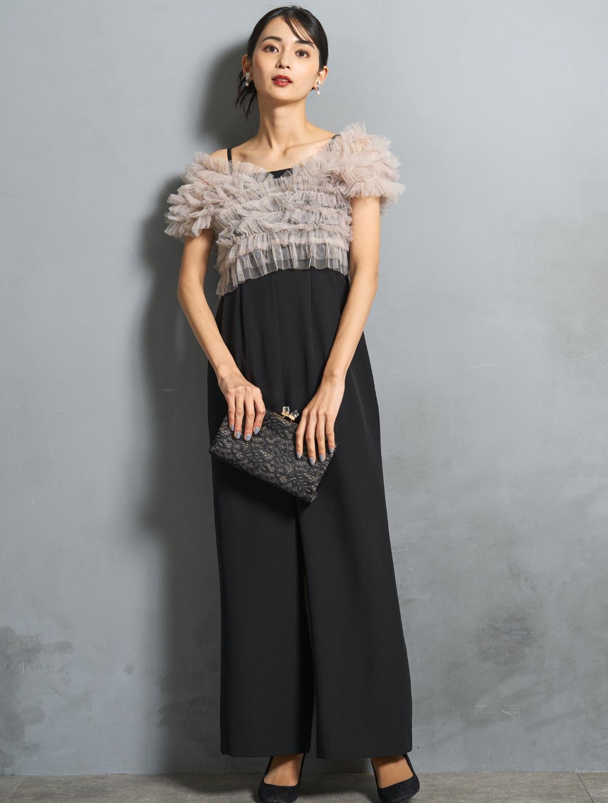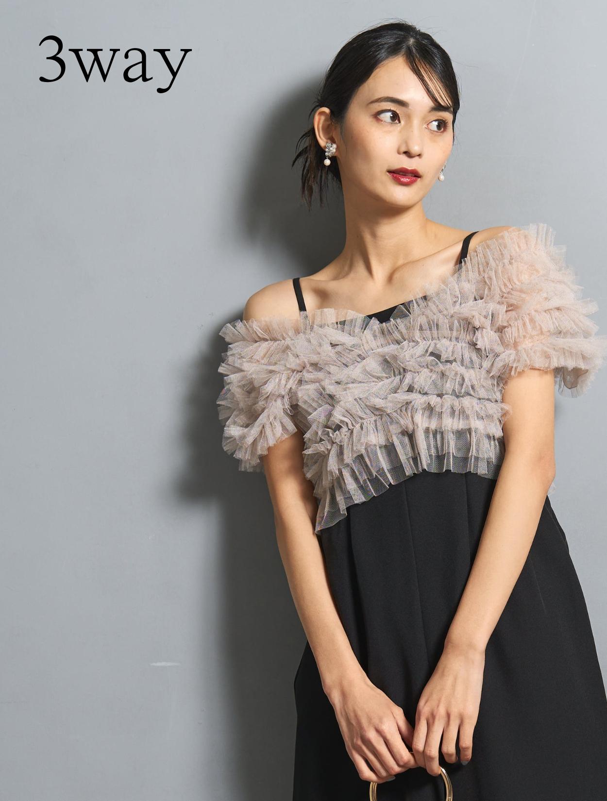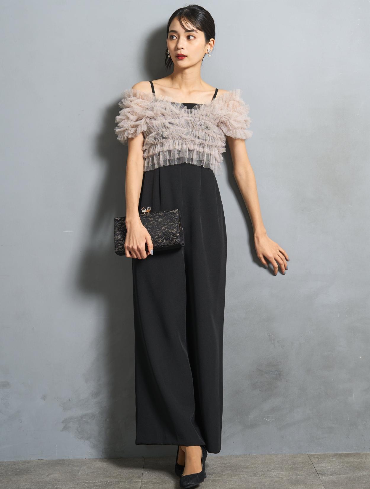 チュールトップスとオールイワンがセットになったパンツドレス。(「ドレスのみ」のご注文で、チュールトップスとオールインワンがレンタルできます。)チュールトップスは、トレンドっぽい軽さがありながらも程よいボリューム感がポイント。柔らかいチュールで、着用時の肌触りも痛くありません。3wayで着こなしを楽しめるのもおすすめポイントです。ベストの様に着たり、オフショルスタイル、前開きにしてショートジレの様な着こなしもできます。フレンチスリーブ仕様なので、オフショル以外では肩が隠れるデザインです。結婚式で一枚で着てもマナー違反ではないので安心してくださいね。腕を露出したくない方には、インナーブラウス付きのセットもあります。(インナーブラウス型番「LDP000205」)