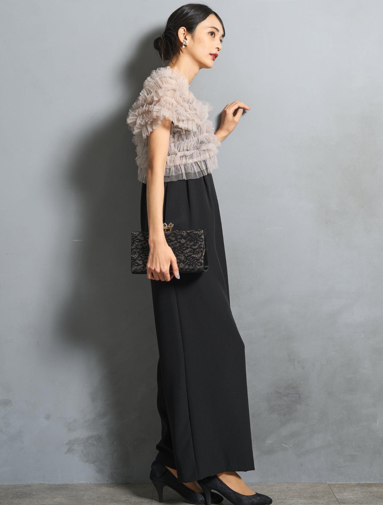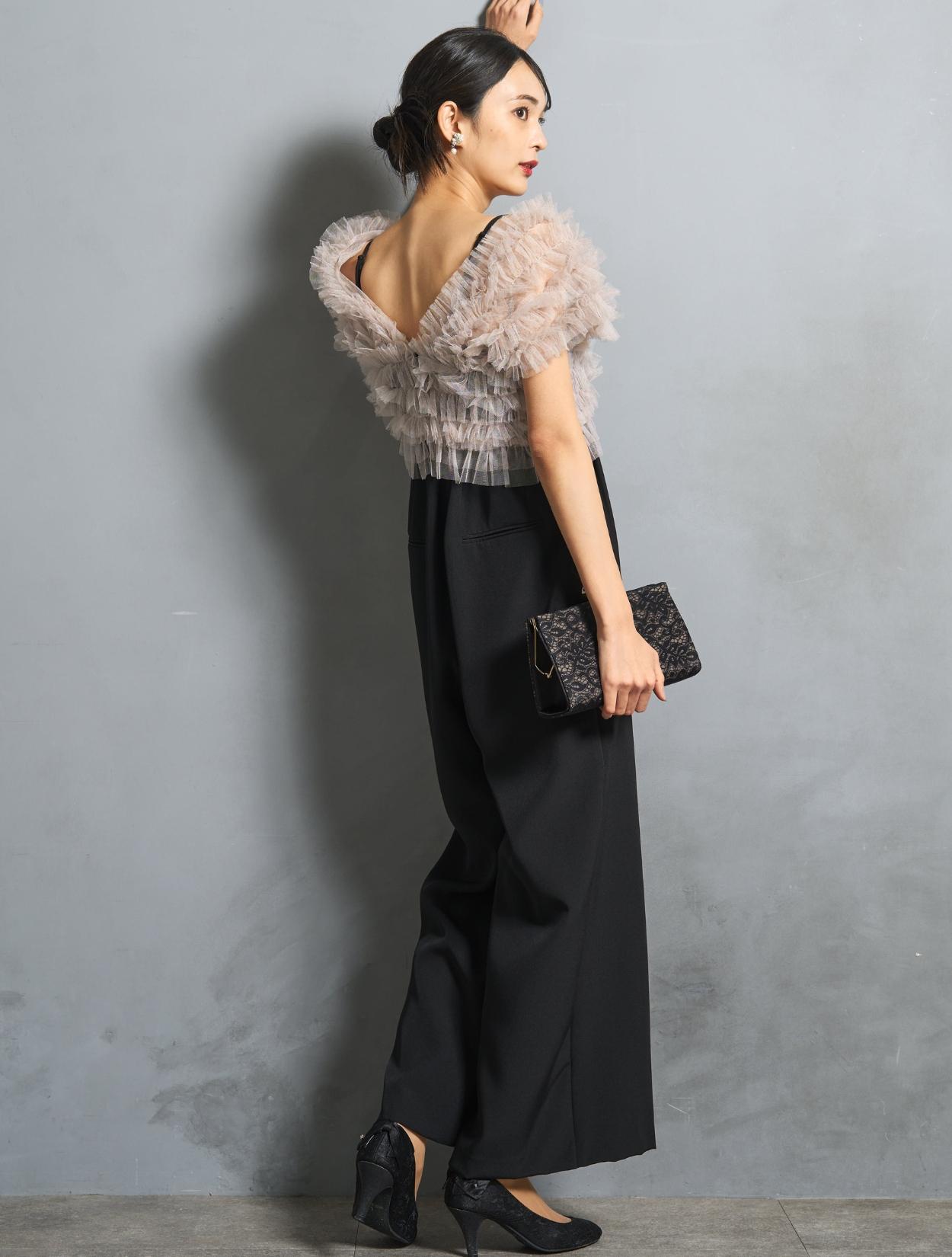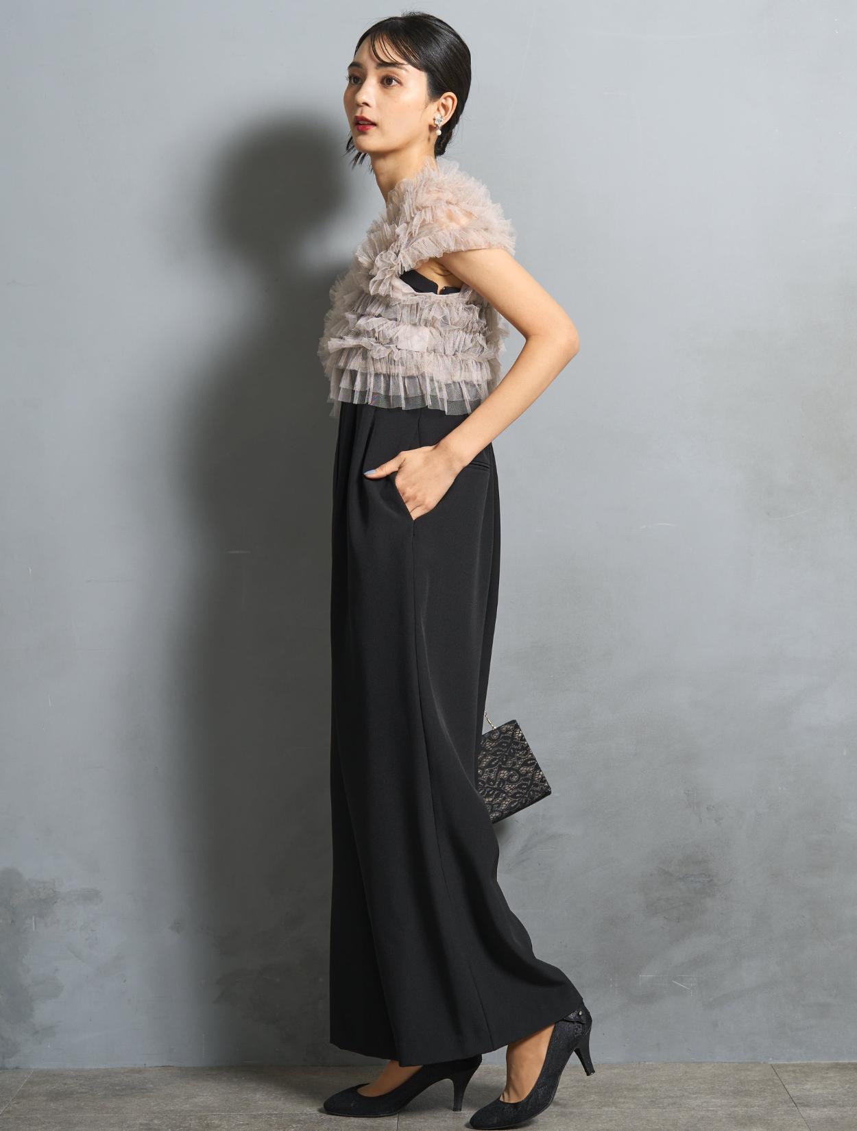 パンツは、キャミソールのオールインワンタイプ。背中部分はゴムになっていて着心地も◎。肩紐で着丈の調節が可能です。オールインワンの高い位置に切り替えが入っていて、スタイルアップ効果あり。切り替えからさりげなく入ったタックは、腰回りをカバーしつつ、たっぷりしたラインが高級感を演出。カジュアルに見えない、結婚式やパーティーにぴったりなパンツスタイルです。