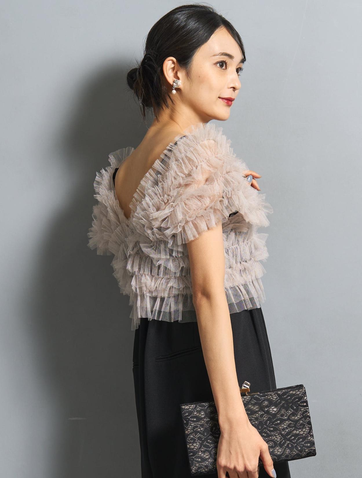 チュールトップスが主役のドレス。ヘアスタイルはタイトにまとめると、チュールのボリュームとバランスが取りやすいです。タイトローシニヨンもおすすめですし、背中の開きがちょっと気になる…という方には、編み下ろしスタイルやローポニーがカバーできておすすめです。チュールトップスは前開きタイプですので、ヘアセットを崩さずにドレスの着脱ができます。※セットのインナーブラウスは被りです。インナーブラスを着る場合は、着た状態でのヘアセットがおすすめです。
