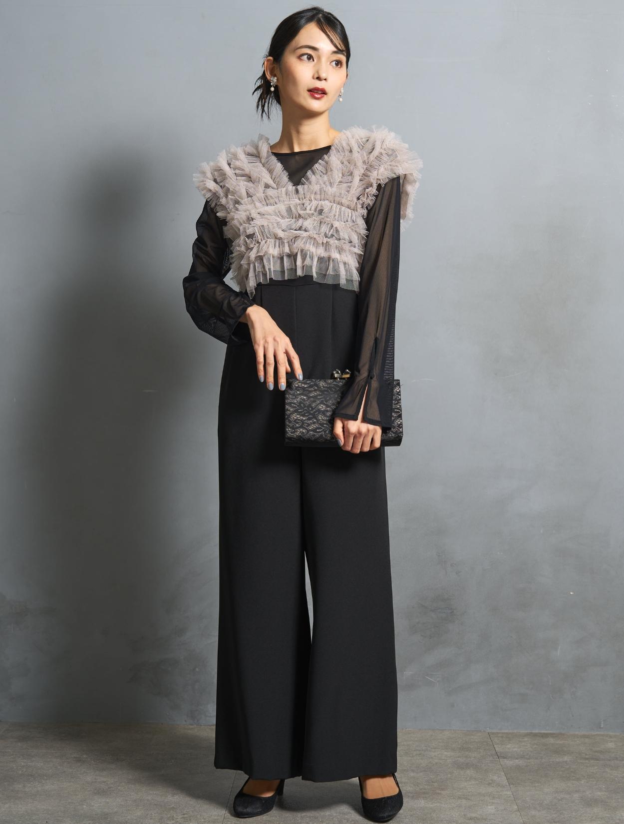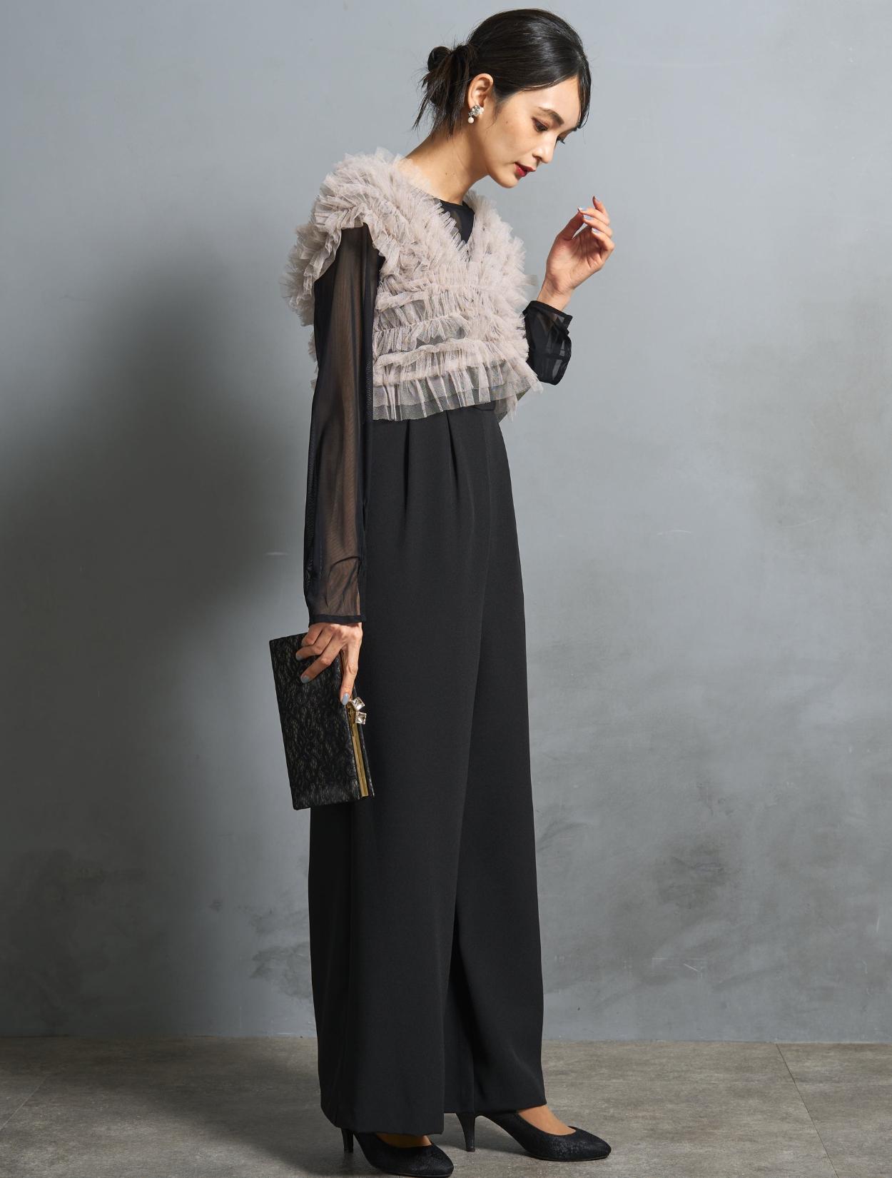 パンツは、キャミソールのオールインワンタイプ。背中部分はゴムになっていて着心地も◎。肩紐で着丈の調節が可能です。オールインワンの高い位置に切り替えが入っていて、スタイルアップ効果あり。切り替えからさりげなく入ったタックは、腰回りをカバーしつつ、たっぷりしたラインが高級感を演出。カジュアルに見えない、結婚式やパーティーにぴったりなパンツスタイルです。