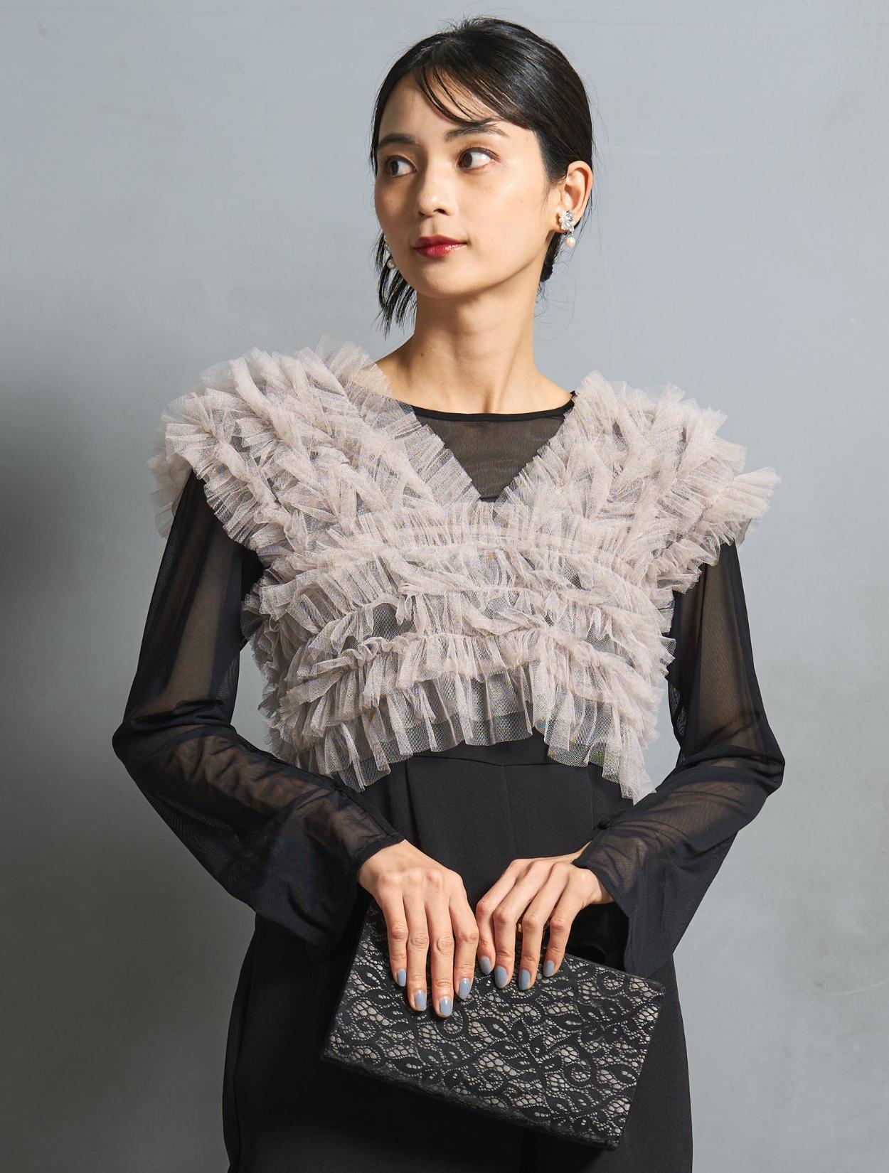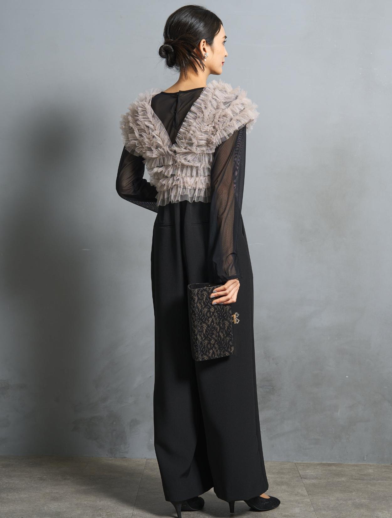 チュールトップスとオールイワンがセットになったパンツドレス。(「ドレスのみ」のご注文で、チュールトップスとオールインワンがレンタルできます。)チュールトップスは、トレンドっぽい軽さがありながらも程よいボリューム感がポイント。柔らかいチュールで、着用時の肌触りも痛くありません。3wayで着こなしを楽しめるのもおすすめポイントです。ベストの様に着たり、オフショルスタイル、前開きにしてショートジレの様な着こなしもできます。フレンチスリーブ仕様なので、オフショル以外では肩が隠れるデザインです。結婚式で一枚で着てもマナー違反ではないので安心してくださいね。腕を露出したくない方には、インナーブラウス付きのセットもあります。(インナーブラウス型番「LDP000205」)