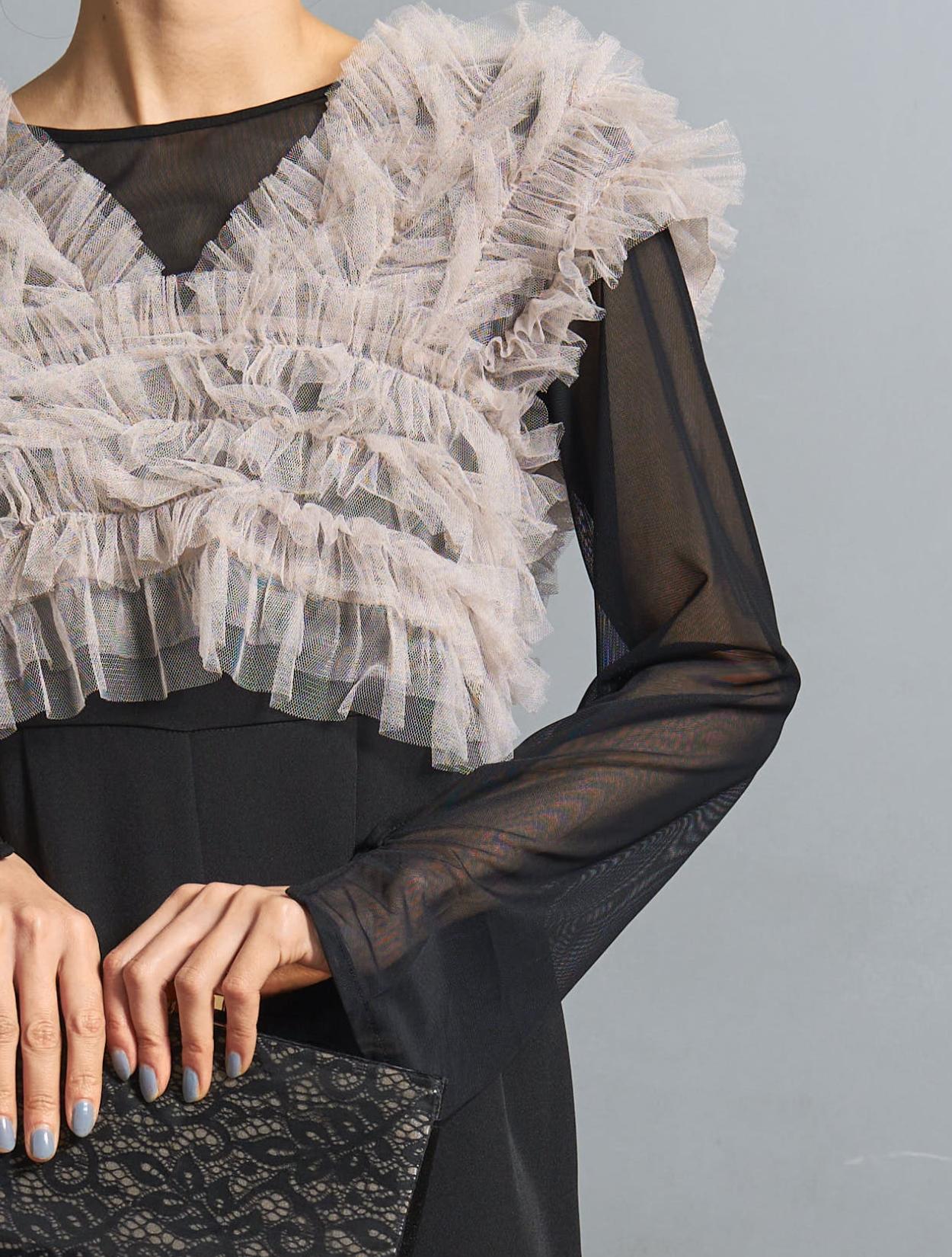 モードなブラックのオールインワンに、曇り空の様なスカイグレーのチュールトップス。ブラックのメリハリを抑えたニュアンスグレーが、頑張りすぎない抜け感のある雰囲気。黄色味を抑えてスッキリとしたカラーバランスです。