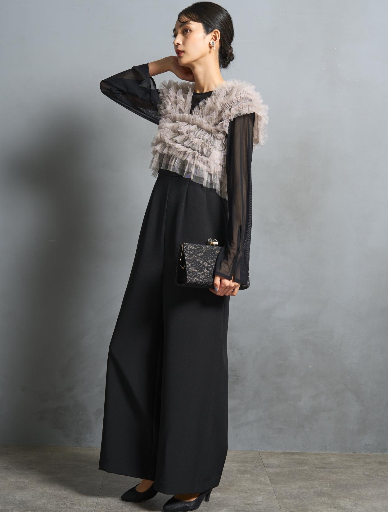 肌見せが苦手な方や腕の露出をしたくない方向けに、ブラウスを合わせて露出を抑えたコーディネート。長袖のブラウスですが、シンプルで透け感があるので、ドレスのデザインを邪魔せずに安心して着られます。オールインワンと同色のブラックバッグを合わせてシックで大人っぽい印象に。レースのバッグは、トレンド感のあるパンツスタイルをクラシカルな雰囲気にしてくれるので、結婚式お呼ばれのパンツスタイルにおすすめのアイテムです。