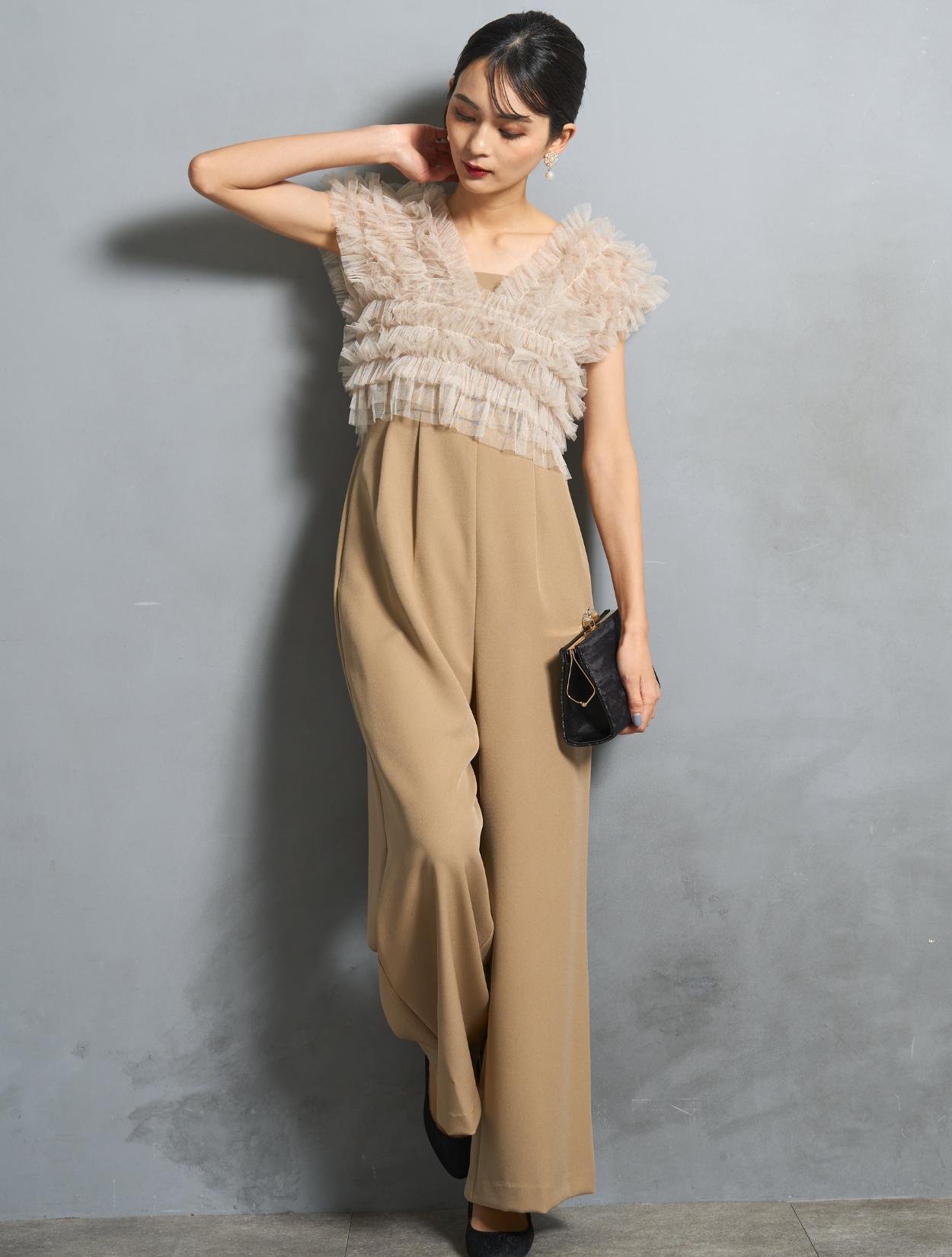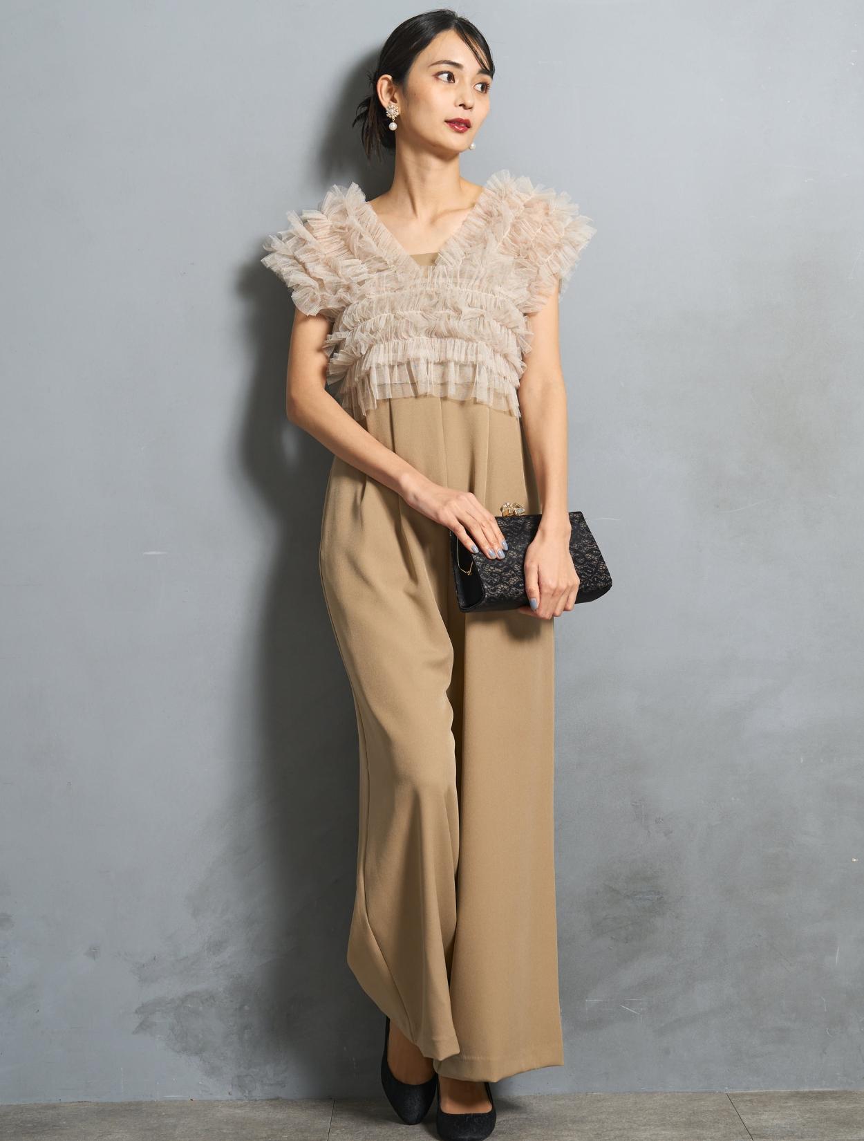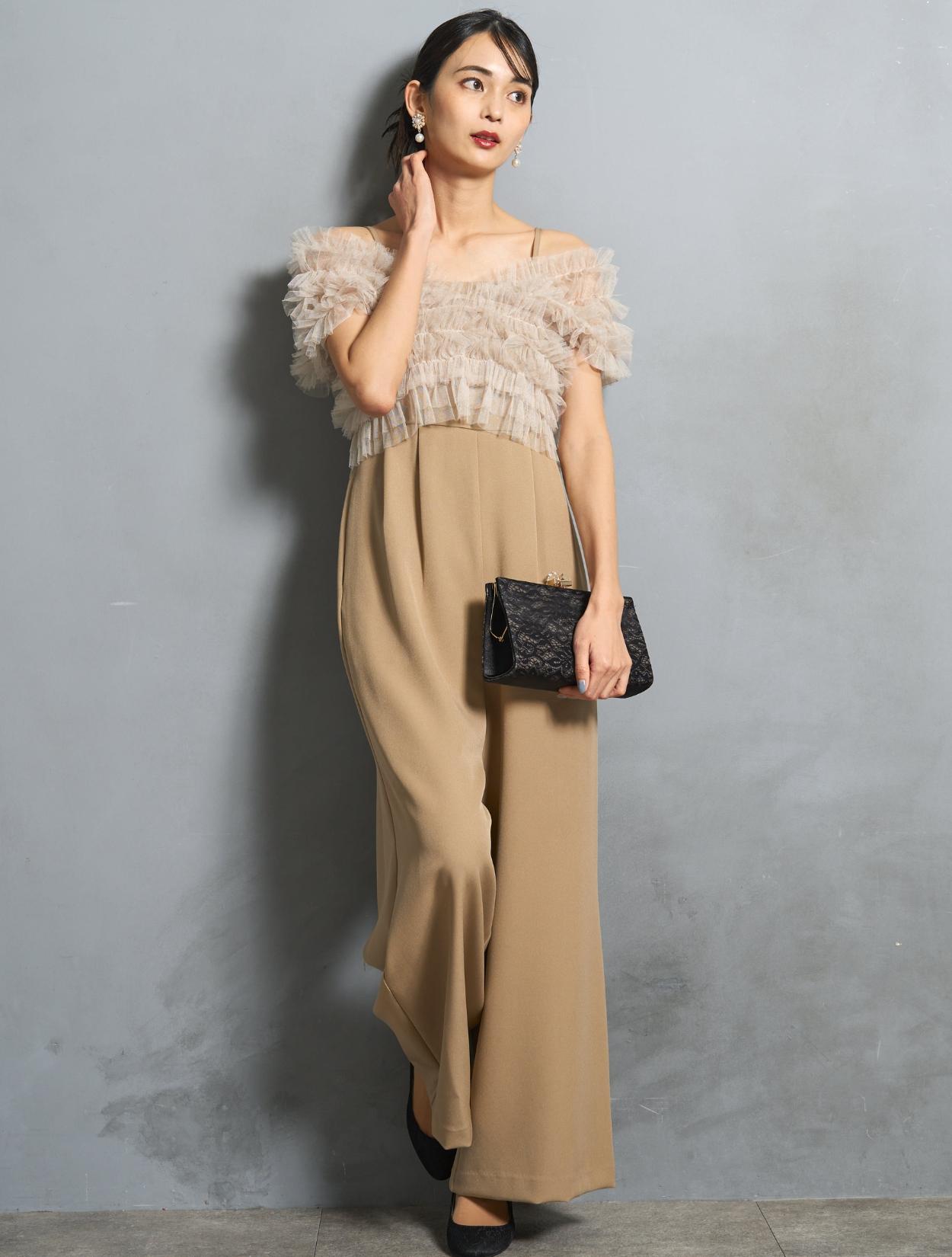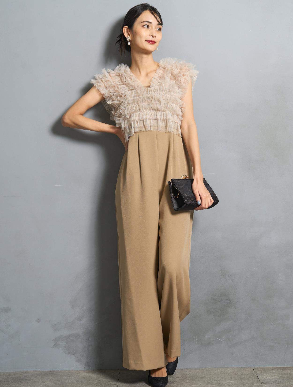ビスケットの様な暖かみのあるベージュカラーのオールインワンに、くすみのあるグレージュのチュールトップス。ベージュ系でも黄色味を抑えた色合いなので、ブルベ肌にも似合いやすい色味です。