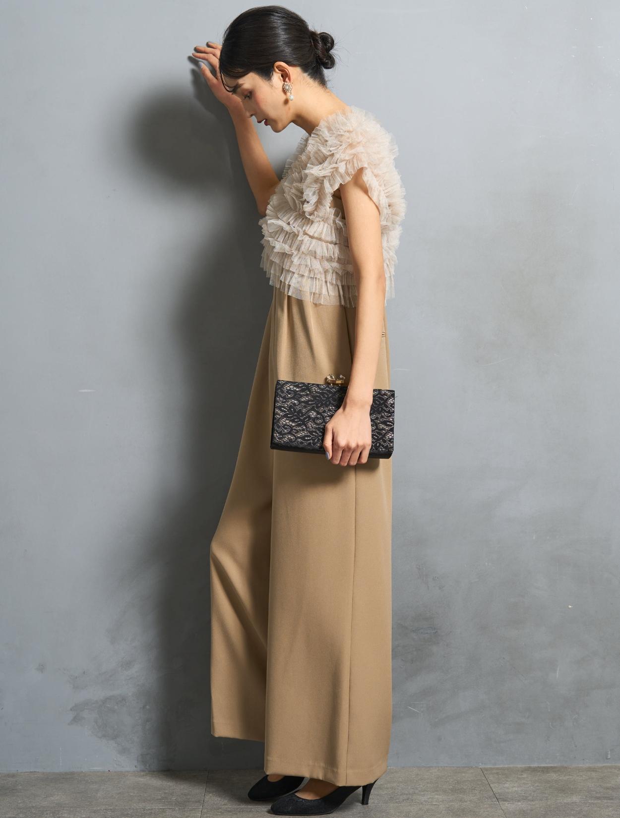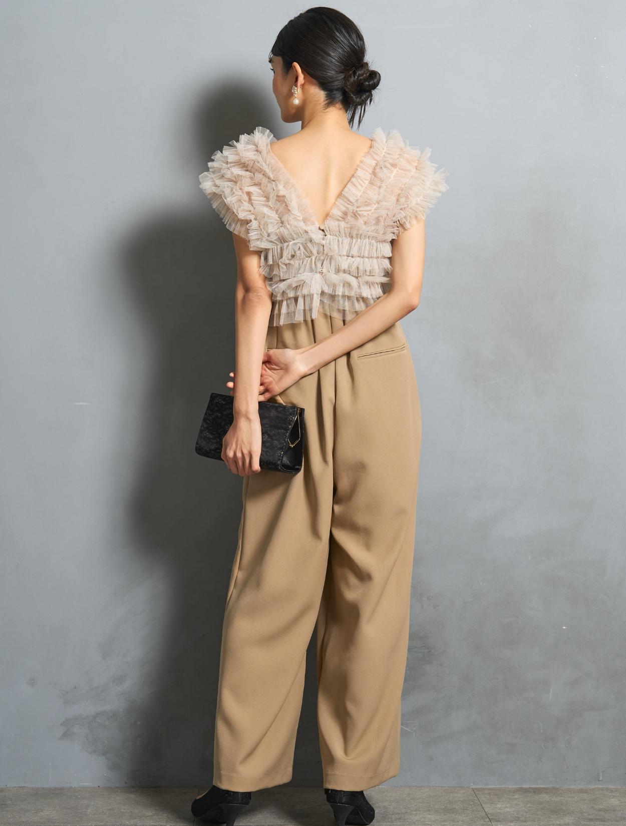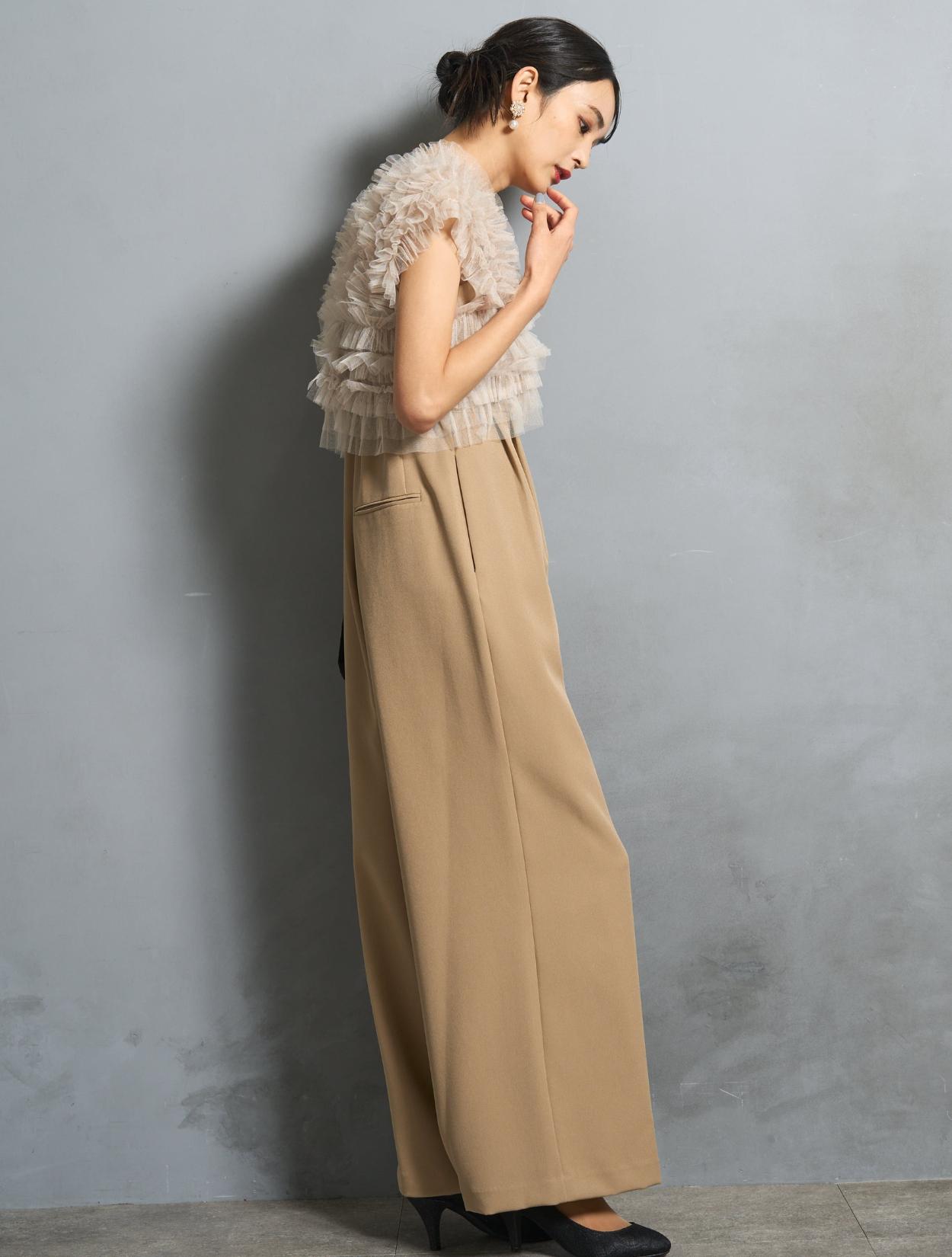 パンツは、キャミソールのオールインワンタイプ。背中部分はゴムになっていて着心地も◎。肩紐で着丈の調節が可能です。オールインワンの高い位置に切り替えが入っていて、スタイルアップ効果あり。切り替えからさりげなく入ったタックは、腰回りをカバーしつつ、たっぷりしたラインが高級感を演出。カジュアルに見えない、結婚式やパーティーにぴったりなパンツスタイルです。