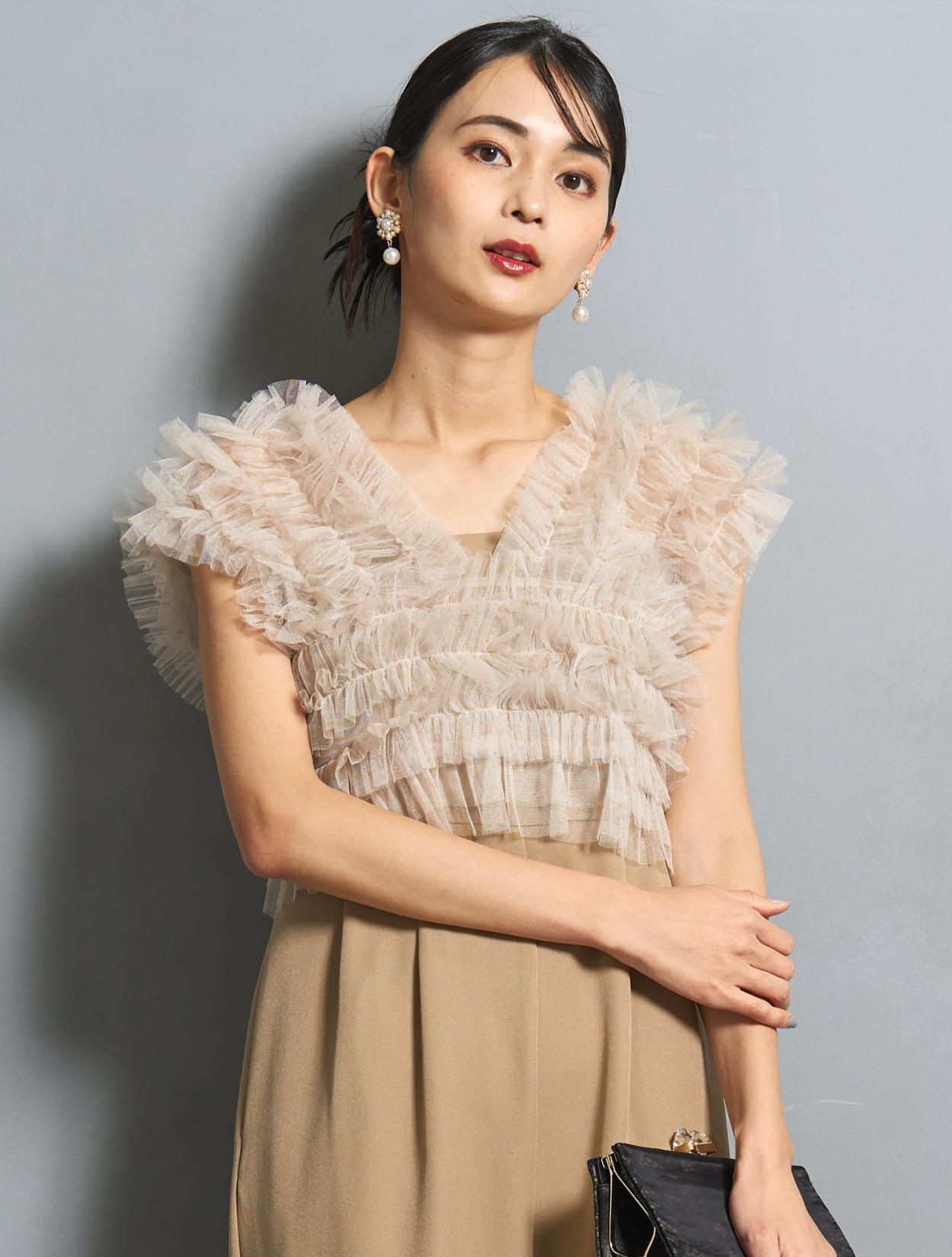 チュールトップスとオールイワンがセットになったパンツドレス。(「ドレスのみ」のご注文で、チュールトップスとオールインワンがレンタルできます。)チュールトップスは、トレンドっぽい軽さがありながらも程よいボリューム感がポイント。柔らかいチュールで、着用時の肌触りも痛くありません。3wayで着こなしを楽しめるのもおすすめポイントです。ベストの様に着たり、オフショルスタイル、前開きにしてショートジレの様な着こなしもできます。フレンチスリーブ仕様なので、オフショル以外では肩が隠れるデザインです。結婚式で一枚で着てもマナー違反ではないので安心してくださいね。腕を露出したくない方には、インナーブラウス付きのセットもあります。(インナーブラウス型番「LDP000205」)