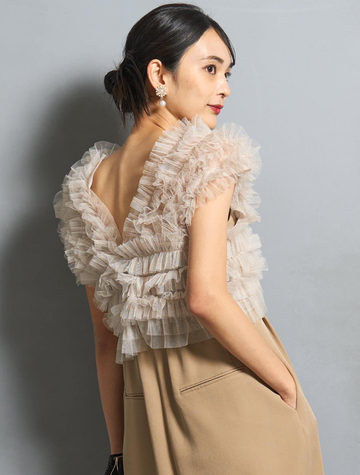 透け感が若干あるので、ストラップレスの下着の着用をおすすめします。チュールトップスの肩部分は立体感があり、中のストラップはあまり目立ちません。オフショルにしないのであれば、目立ちにくいスキンカラーの下着ならストラップ付きでも着用可能です。