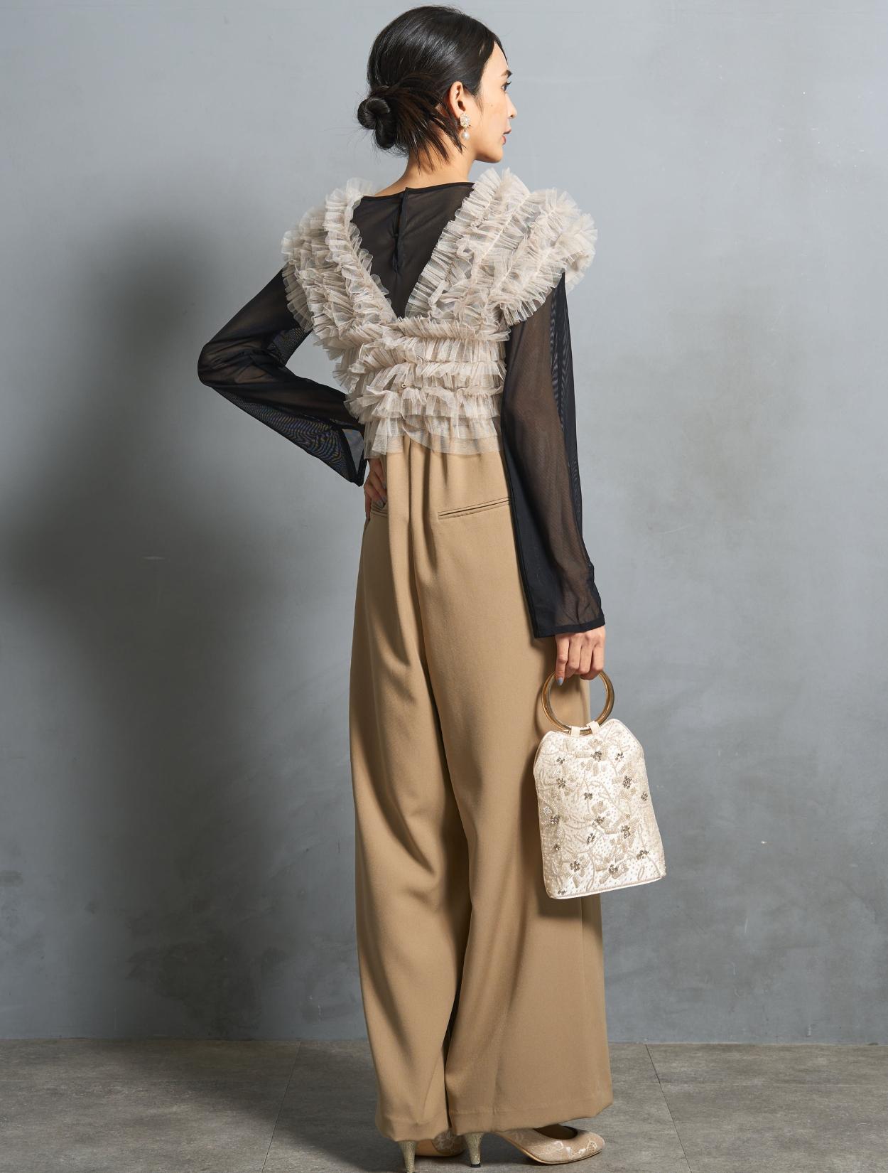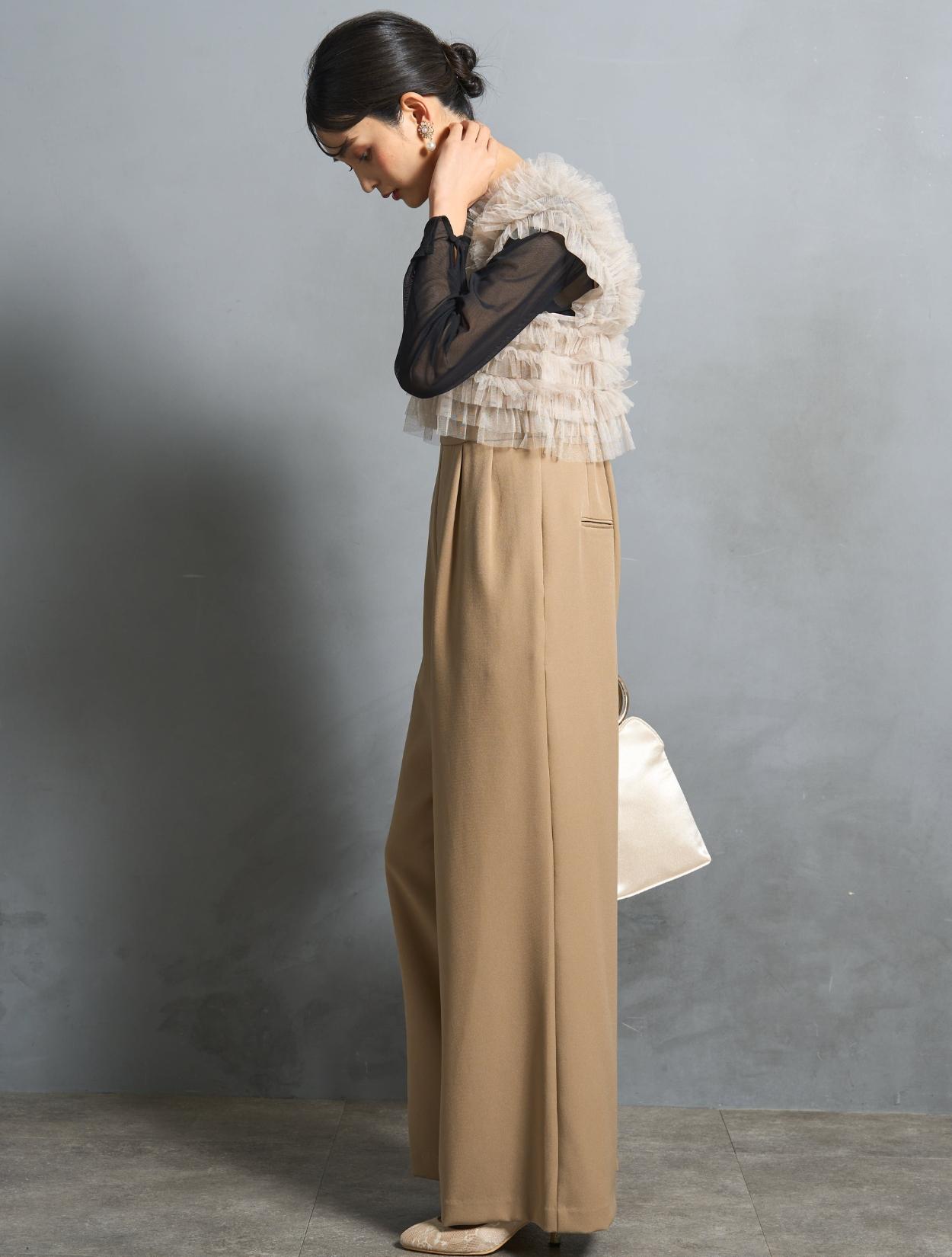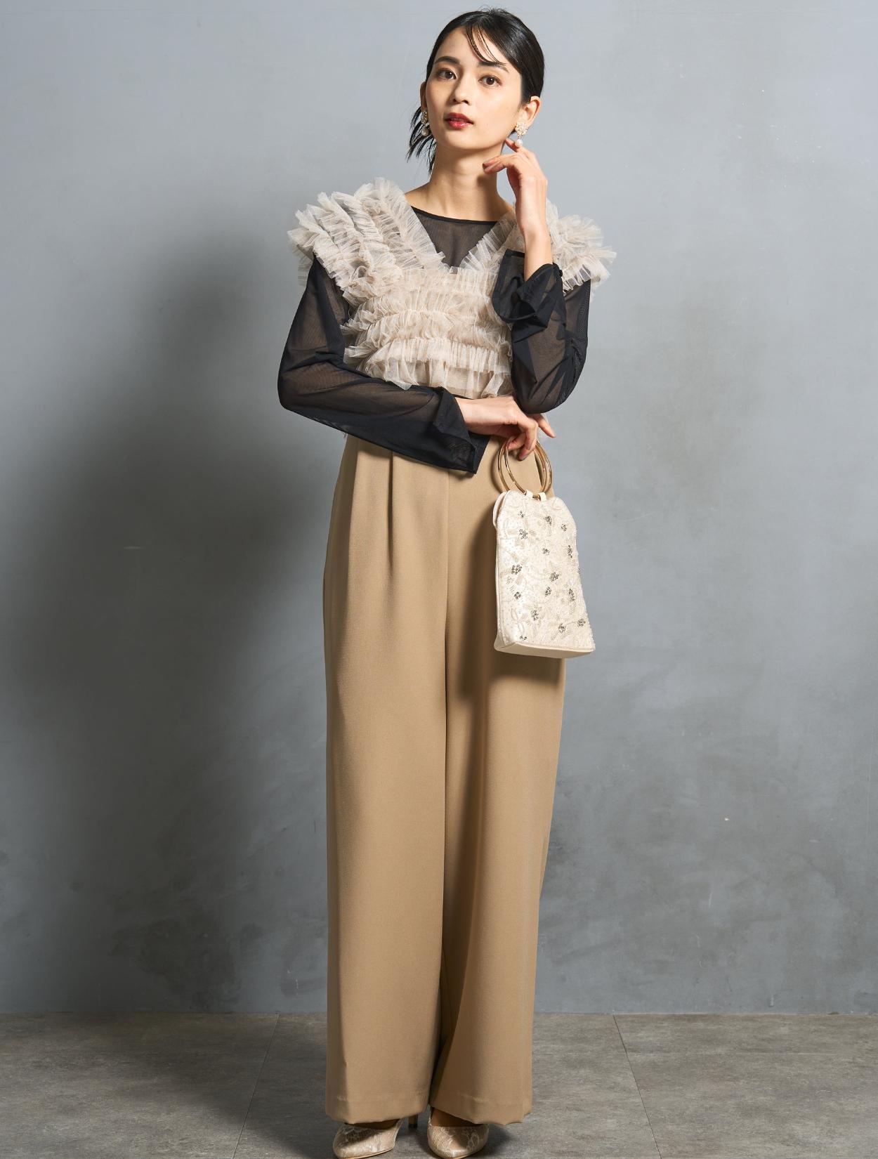 パンツは、キャミソールのオールインワンタイプ。背中部分はゴムになっていて着心地も◎。肩紐で着丈の調節が可能です。オールインワンの高い位置に切り替えが入っていて、スタイルアップ効果あり。切り替えからさりげなく入ったタックは、腰回りをカバーしつつ、たっぷりしたラインが高級感を演出。カジュアルに見えない、結婚式やパーティーにぴったりなパンツスタイルです。