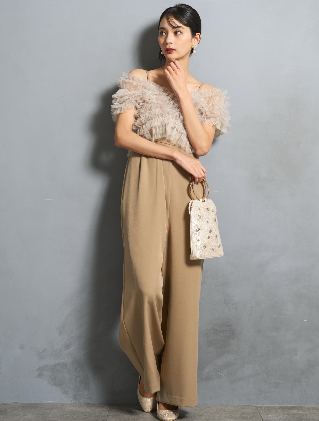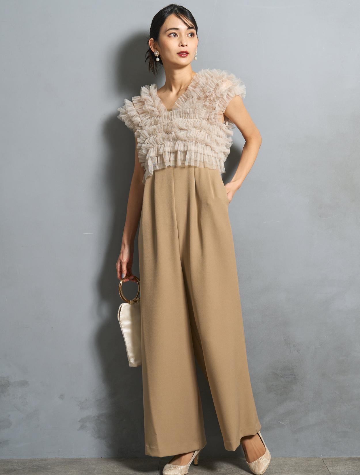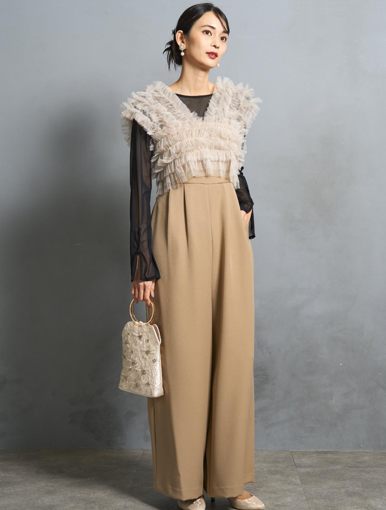ビスケットの様な暖かみのあるベージュカラーのオールインワンに、くすみのあるグレージュのチュールトップス。ベージュ系でも黄色味を抑えた色合いなので、ブルベ肌にも似合いやすい色味です。