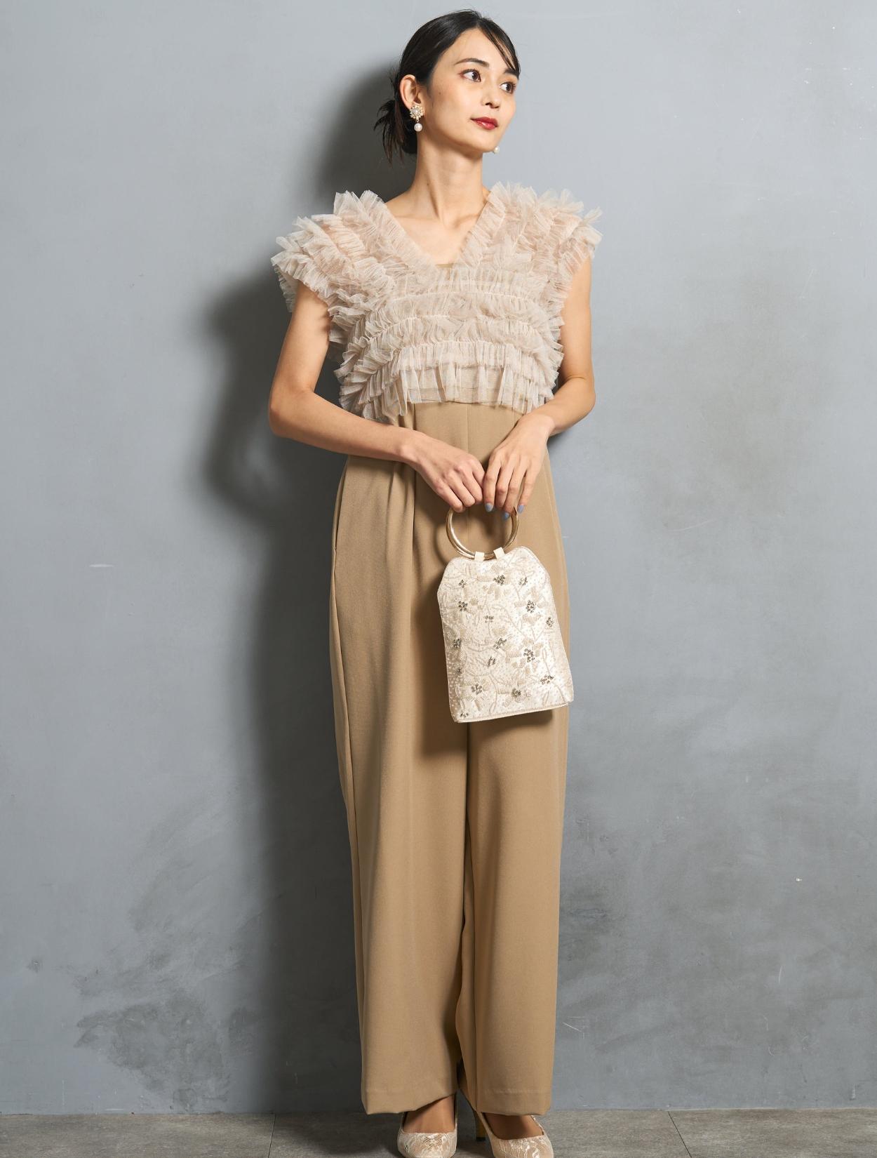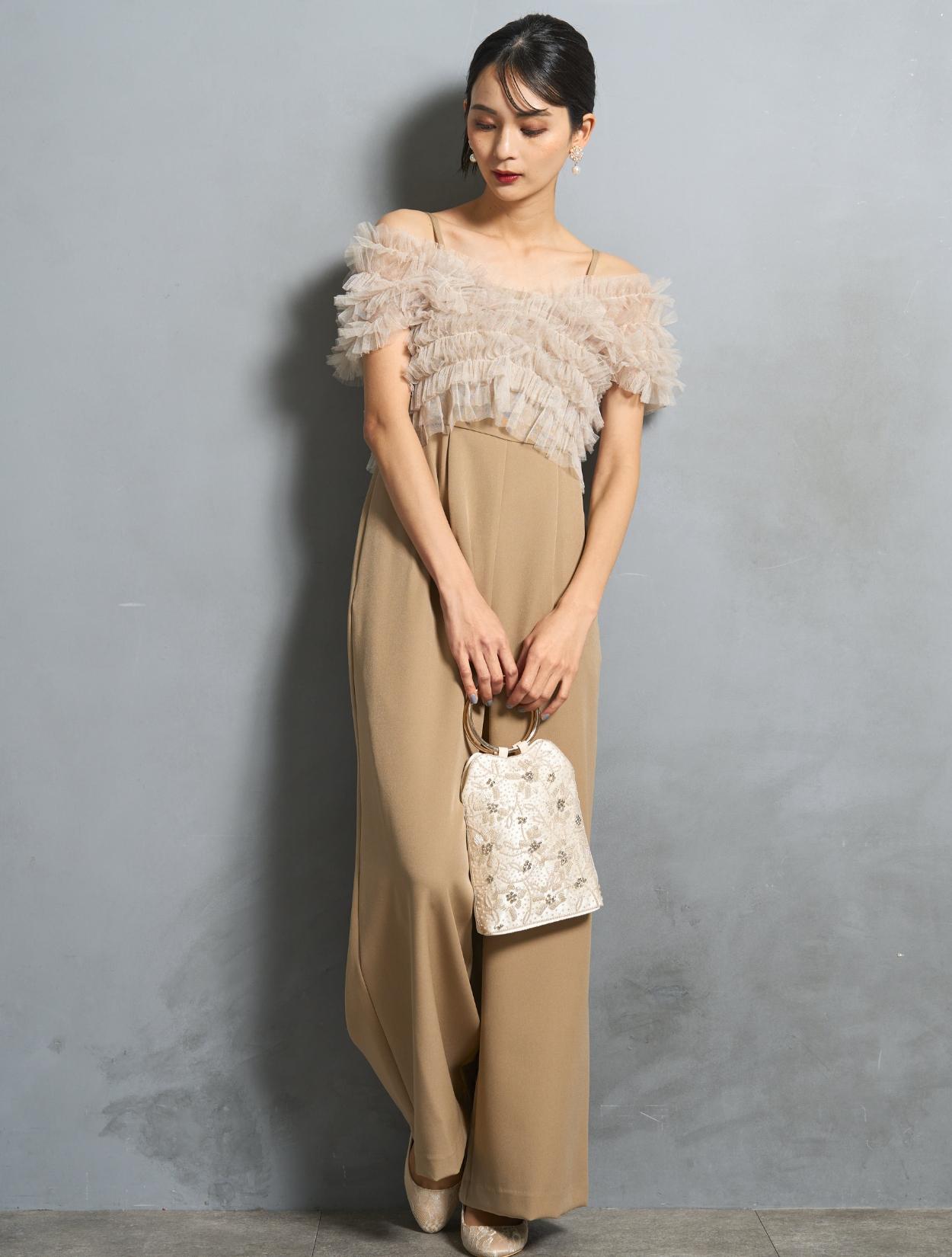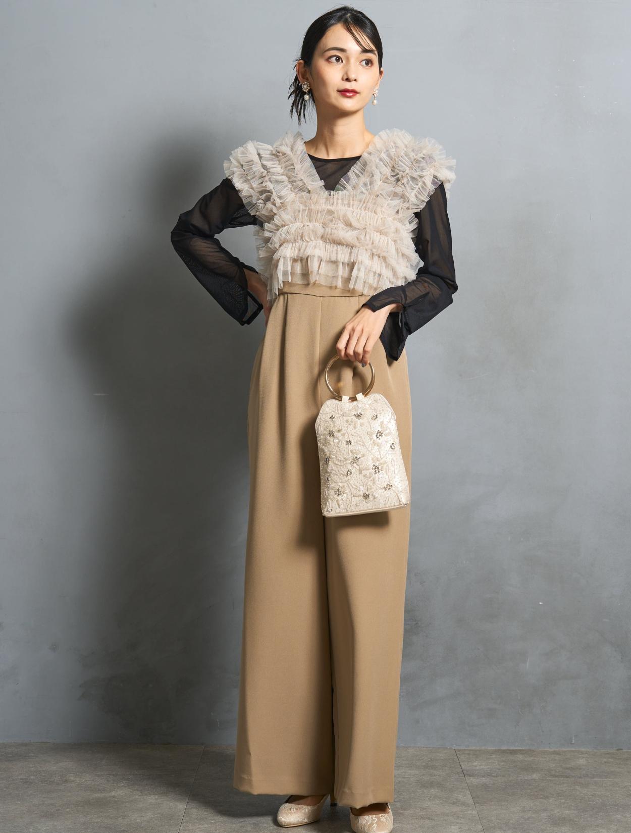 ビスケットの様な暖かみのあるベージュカラーのオールインワンに、くすみのあるグレージュのチュールトップス。ベージュ系でも黄色味を抑えた色合いなので、ブルベ肌にも似合いやすい色味です。