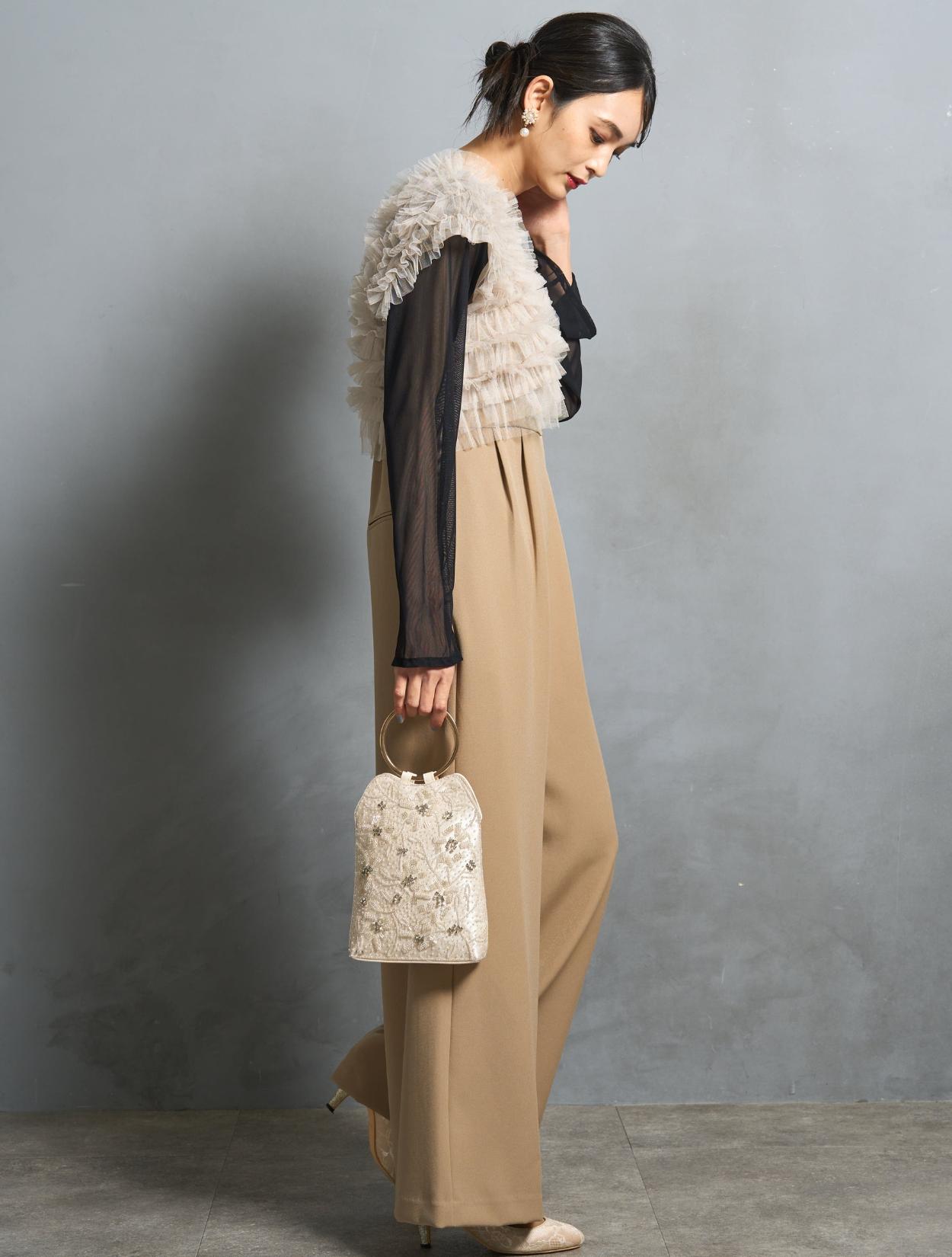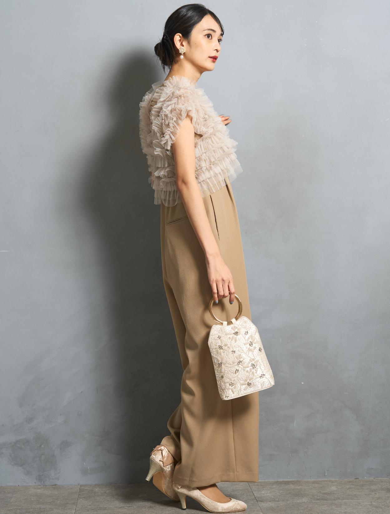 肌見せが苦手な方や腕の露出をしたくない方向けに、ブラウスを合わせて露出を抑えたコーディネート。長袖のブラウスですが、シンプルで透け感があるので、ドレスのデザインを邪魔せずに安心して着られます。また、ベージュカラーにメリハリが出るので、着やせ効果もあります。セットのバッグは、上品でフォーマルな印象のある刺繍バッグ。優しい色合いのコーディネートは、ハイセンスなドレスを少し抑えた控えめな着こなしができるのでぜひ挑戦してみて下さい。
