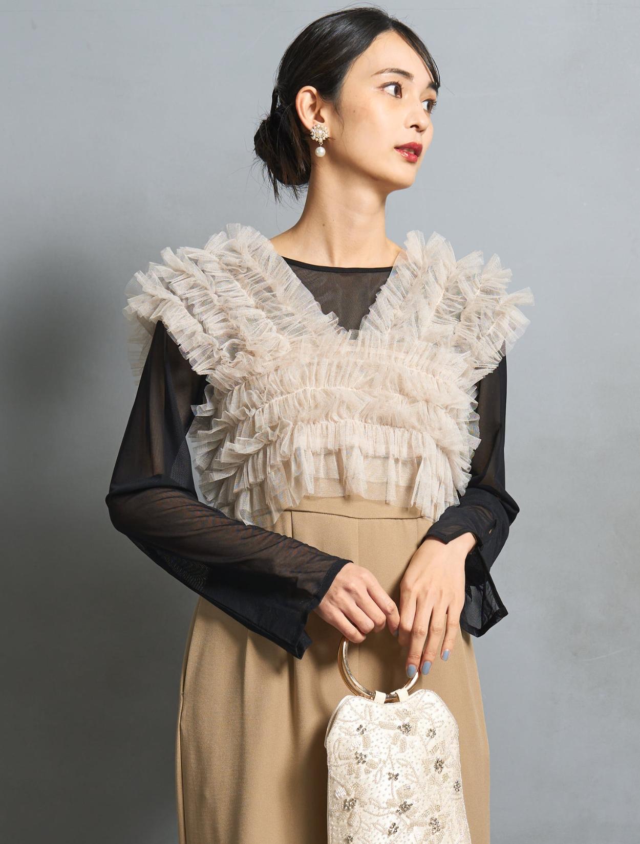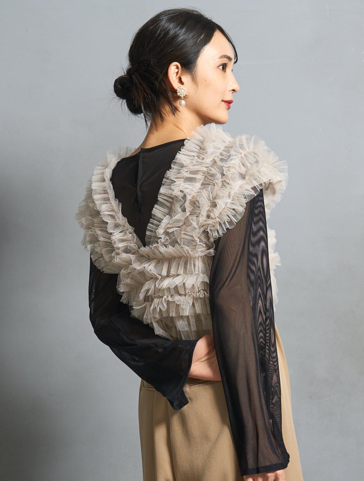 透け感が若干あるので、ストラップレスの下着の着用をおすすめします。チュールトップスの肩部分は立体感があり、中のストラップはあまり目立ちません。オフショルにしないのであれば、目立ちにくいスキンカラーの下着ならストラップ付きでも着用可能です。