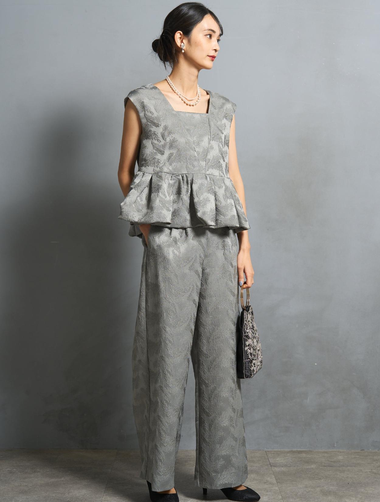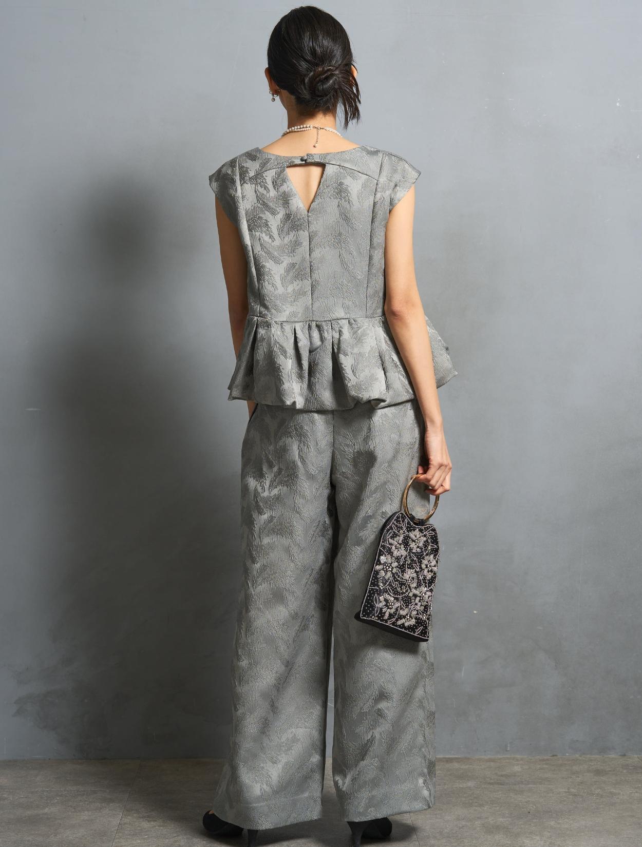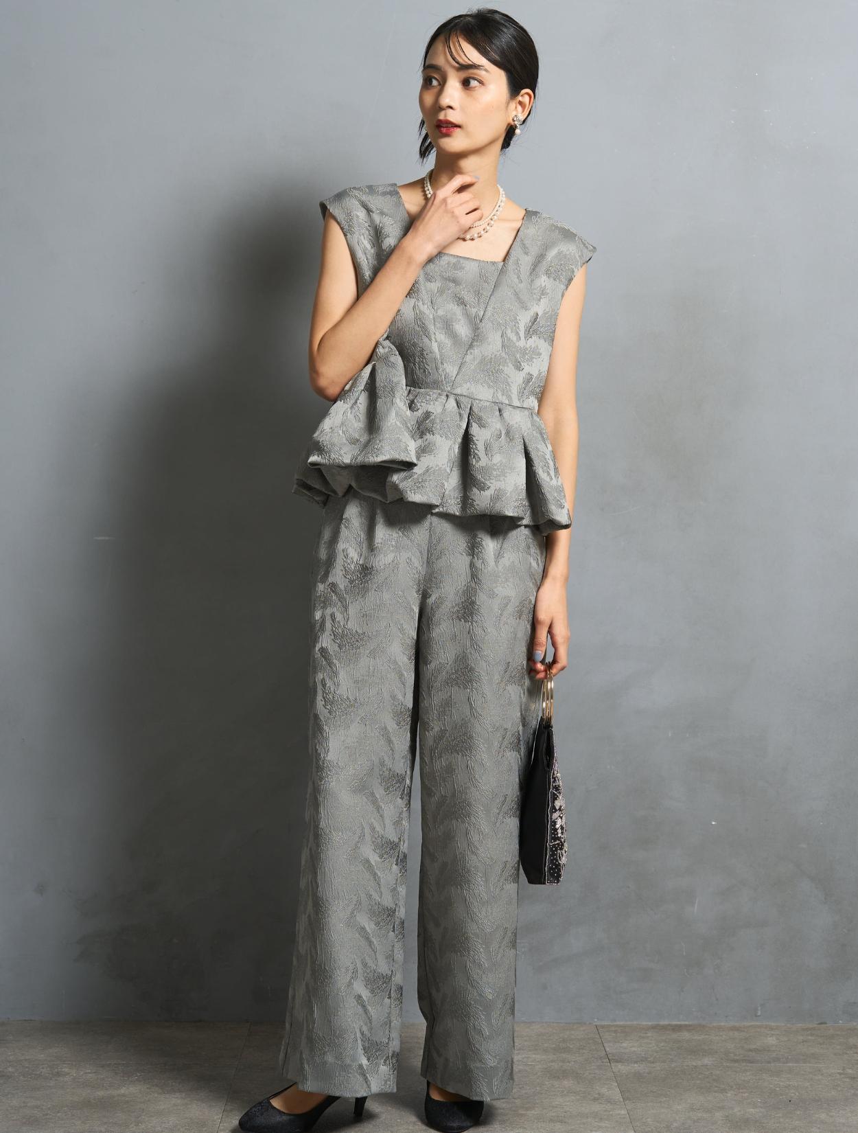 程よくボリュームのあるペルラムが大人かわいいパンツスタイルドレス。この絶妙なボリュームのペプラムデザインが、スタイルアップして見えるポイントでもあります。トップスのペプラムの切り替え位置は、ウエストを高く見せて脚長効果あり。微光沢のジャガード生地は、高級感もあり結婚式やパーティーのフォーマルシーンにもぴったりです。照明などの光の当たり方によって、フェザーの柄が映えておしゃれ。トレンドのパンツドレスですが、周りと被りにくく一目置かれる着こなしができます。気になるお袖ですが、フレンチスリーブで肩が隠れるデザイン。結婚式でも羽織りなしで着られます。露出が気になる方には、インナーブラウス(型番LDP000205)や、ショール(型番SDP0050)を合わせると◎。程よく開いたネックラインは、ネックレスが映えるデザイン。また、ネックからVに入ったラインは、首周りや上半身をスッキリ見せてくれます。短い首がお悩みの方でもきれいに着こなしやすいのも嬉しいですね♪パンツは便利なポケット付き。ただ、シルエットが崩れてしまうので、物を入れ過ぎるのは要注意です。