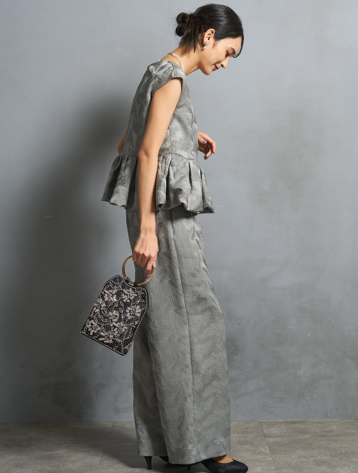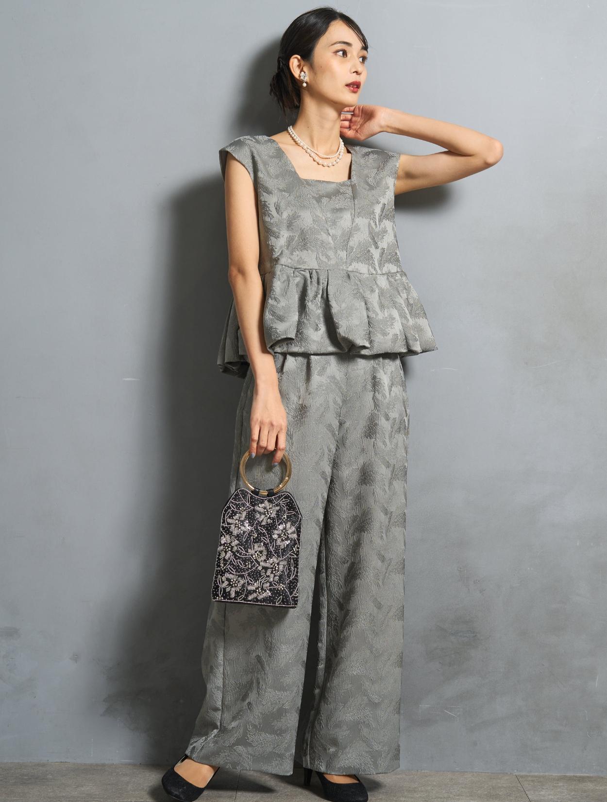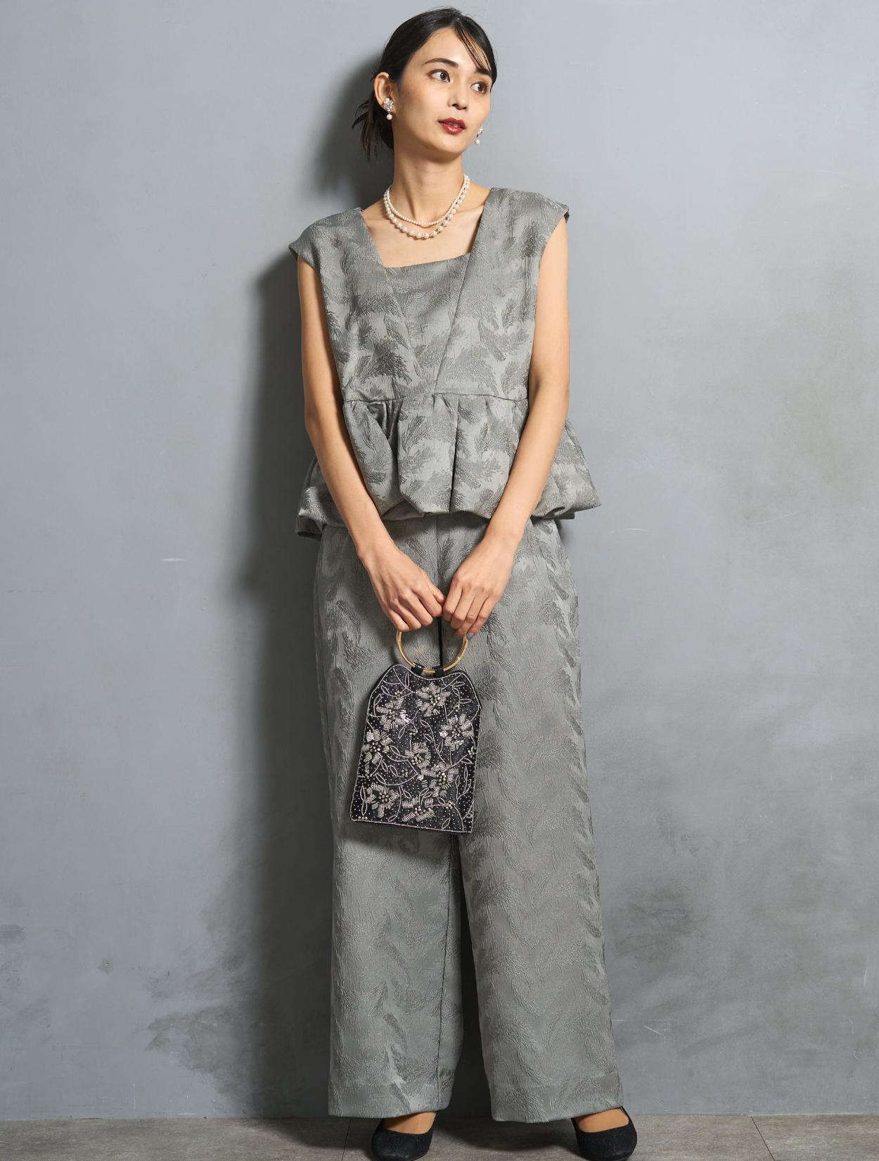 程よくボリュームのあるペルラムが大人かわいいパンツスタイルドレス。この絶妙なボリュームのペプラムデザインが、スタイルアップして見えるポイントでもあります。トップスのペプラムの切り替え位置は、ウエストを高く見せて脚長効果あり。微光沢のジャガード生地は、高級感もあり結婚式やパーティーのフォーマルシーンにもぴったりです。照明などの光の当たり方によって、フェザーの柄が映えておしゃれ。トレンドのパンツドレスですが、周りと被りにくく一目置かれる着こなしができます。気になるお袖ですが、フレンチスリーブで肩が隠れるデザイン。結婚式でも羽織りなしで着られます。露出が気になる方には、インナーブラウス(型番LDP000205)や、ショール(型番SDP0050)を合わせると◎。程よく開いたネックラインは、ネックレスが映えるデザイン。また、ネックからVに入ったラインは、首周りや上半身をスッキリ見せてくれます。短い首がお悩みの方でもきれいに着こなしやすいのも嬉しいですね♪パンツは便利なポケット付き。ただ、シルエットが崩れてしまうので、物を入れ過ぎるのは要注意です。