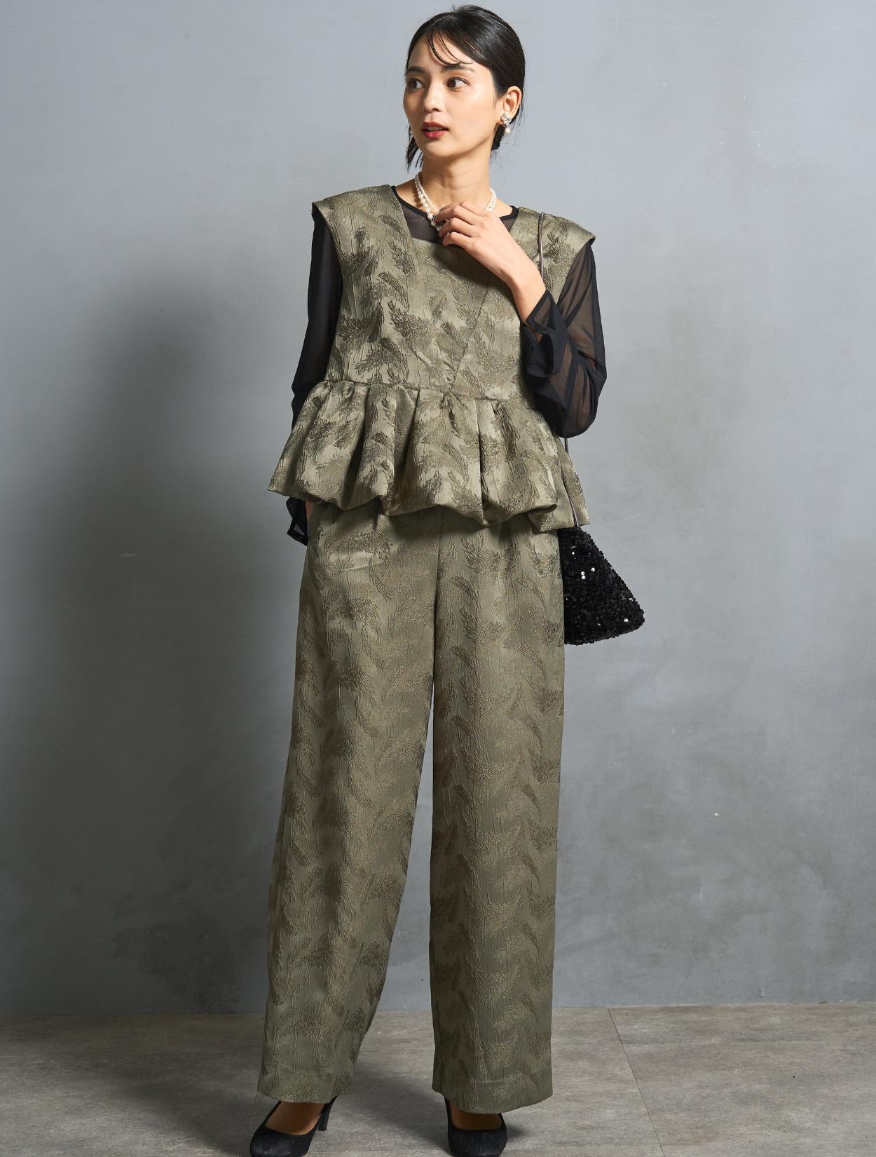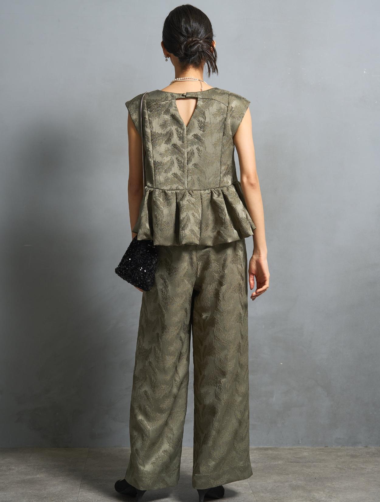程よくボリュームのあるペルラムが大人かわいいパンツスタイルドレス。この絶妙なボリュームのペプラムデザインが、スタイルアップして見えるポイントでもあります。トップスのペプラムの切り替え位置は、ウエストを高く見せて脚長効果あり。微光沢のジャガード生地は、高級感もあり結婚式やパーティーのフォーマルシーンにもぴったりです。照明などの光の当たり方によって、フェザーの柄が映えておしゃれ。トレンドのパンツドレスですが、周りと被りにくく一目置かれる着こなしができます。気になるお袖ですが、フレンチスリーブで肩が隠れるデザイン。結婚式でも羽織りなしで着られます。露出が気になる方には、インナーブラウス(型番LDP000205)や、ショール(型番SDP0050)を合わせると◎。程よく開いたネックラインは、ネックレスが映えるデザイン。また、ネックからVに入ったラインは、首周りや上半身をスッキリ見せてくれます。短い首がお悩みの方でもきれいに着こなしやすいのも嬉しいですね♪パンツは便利なポケット付き。ただ、シルエットが崩れてしまうので、物を入れ過ぎるのは要注意です。