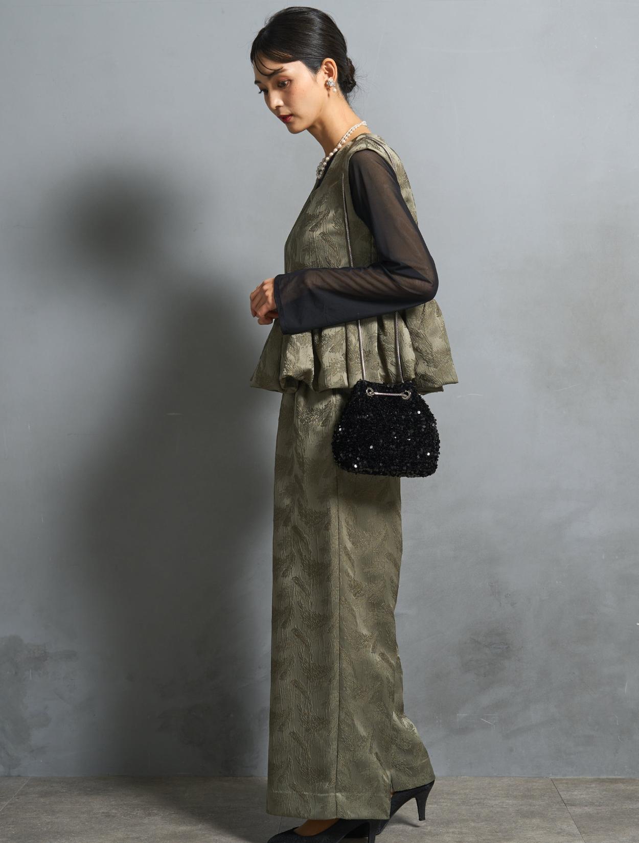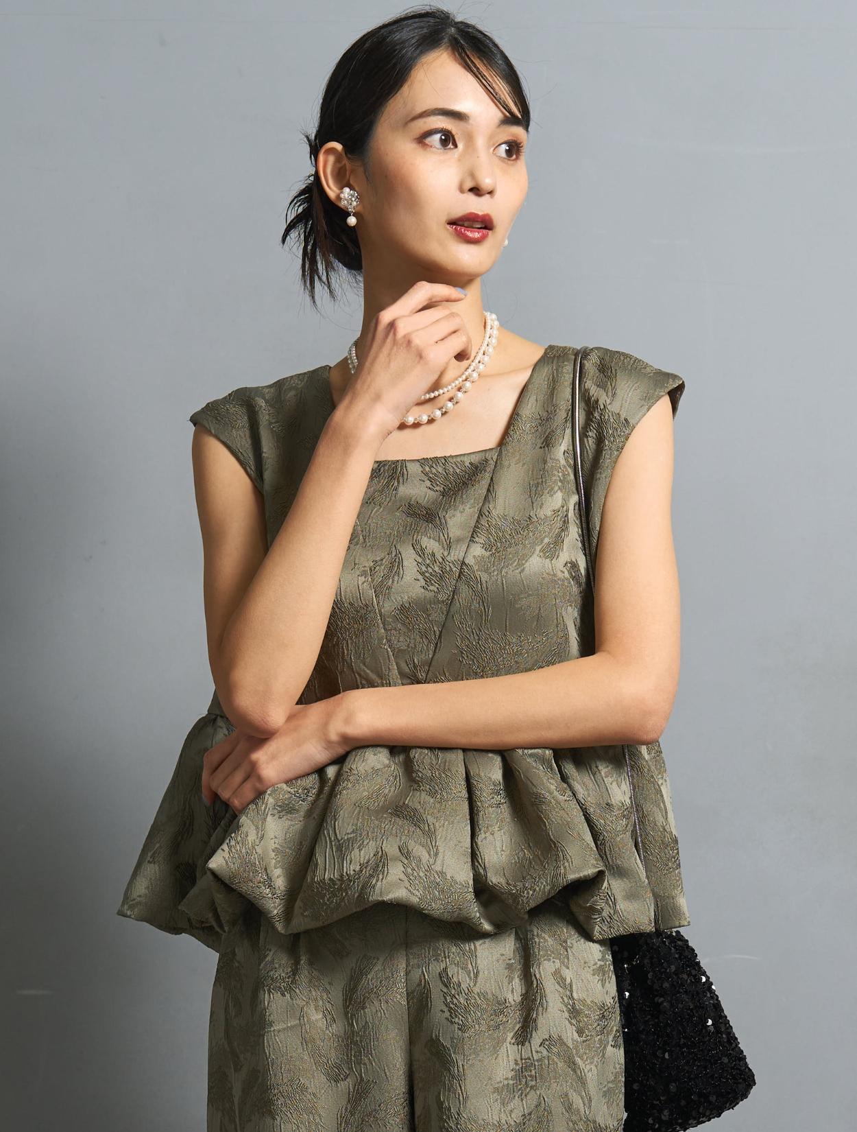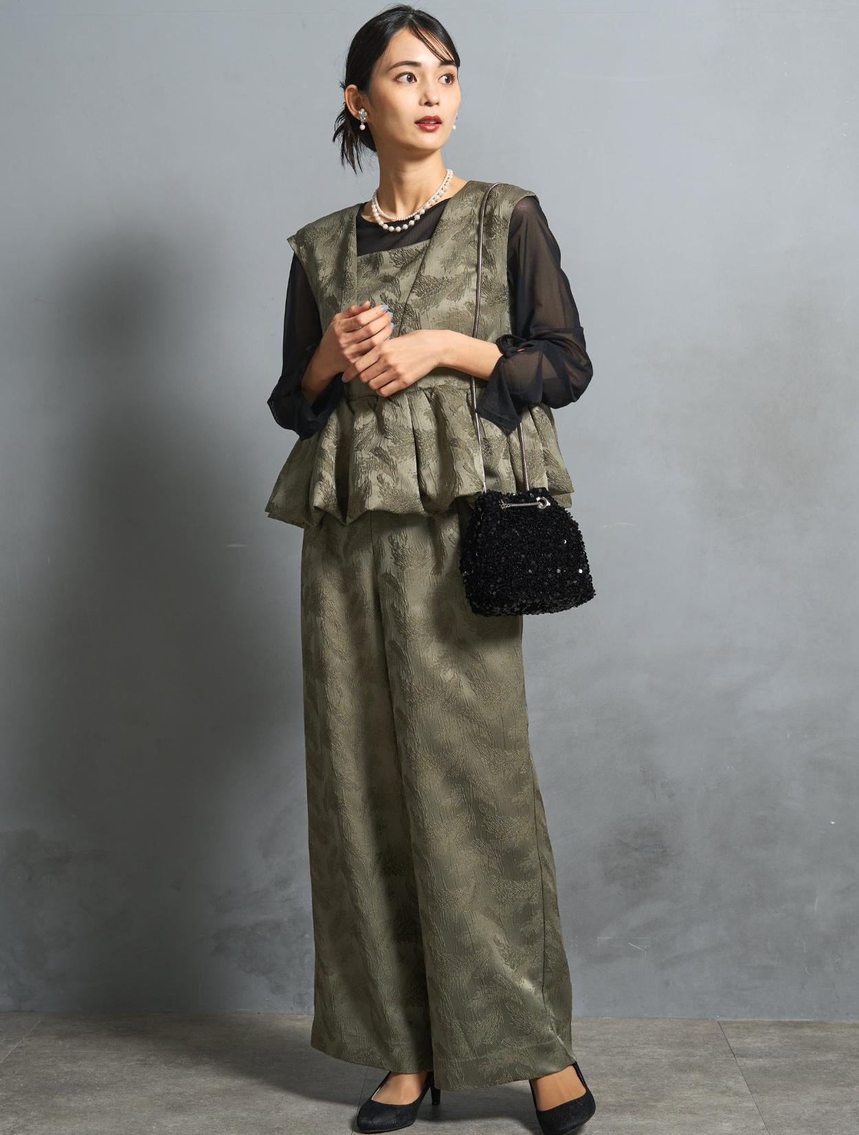 肌見せが苦手な方や腕の露出をしたくない方向けに、ブラウスを合わせて露出を抑えたコーディネート。長袖のブラウスですが、シンプルで透け感があるので、ドレスのデザインを邪魔せずに安心して着られます。20代30代はもちろん、40代50代のお呼ばれドレスとしてもおすすめです。遊び心のあるカーキのパンツドレスに、フォーマル感が控えめなスパンコールバッグを合わせて今っぽい着こなしに。2連のパールネックレスは、結婚式や様々なフォーマルシーンで間違いない着こなしができるおすすめのアイテム。カジュアルに見え過ぎないようにバランスを整えてくれます。結婚式はもちろん、特別な日のお食事や女子会にもおすすめです。