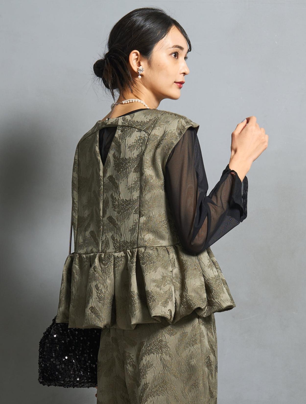 透け感のないしっかりしたジャガード生地ですが、フレンチスリーブのデザインからも「春夏秋冬」と年中ご着用いただけます。秋冬は、長袖のインナーブラスを中に着ると季節感が出まて◎。