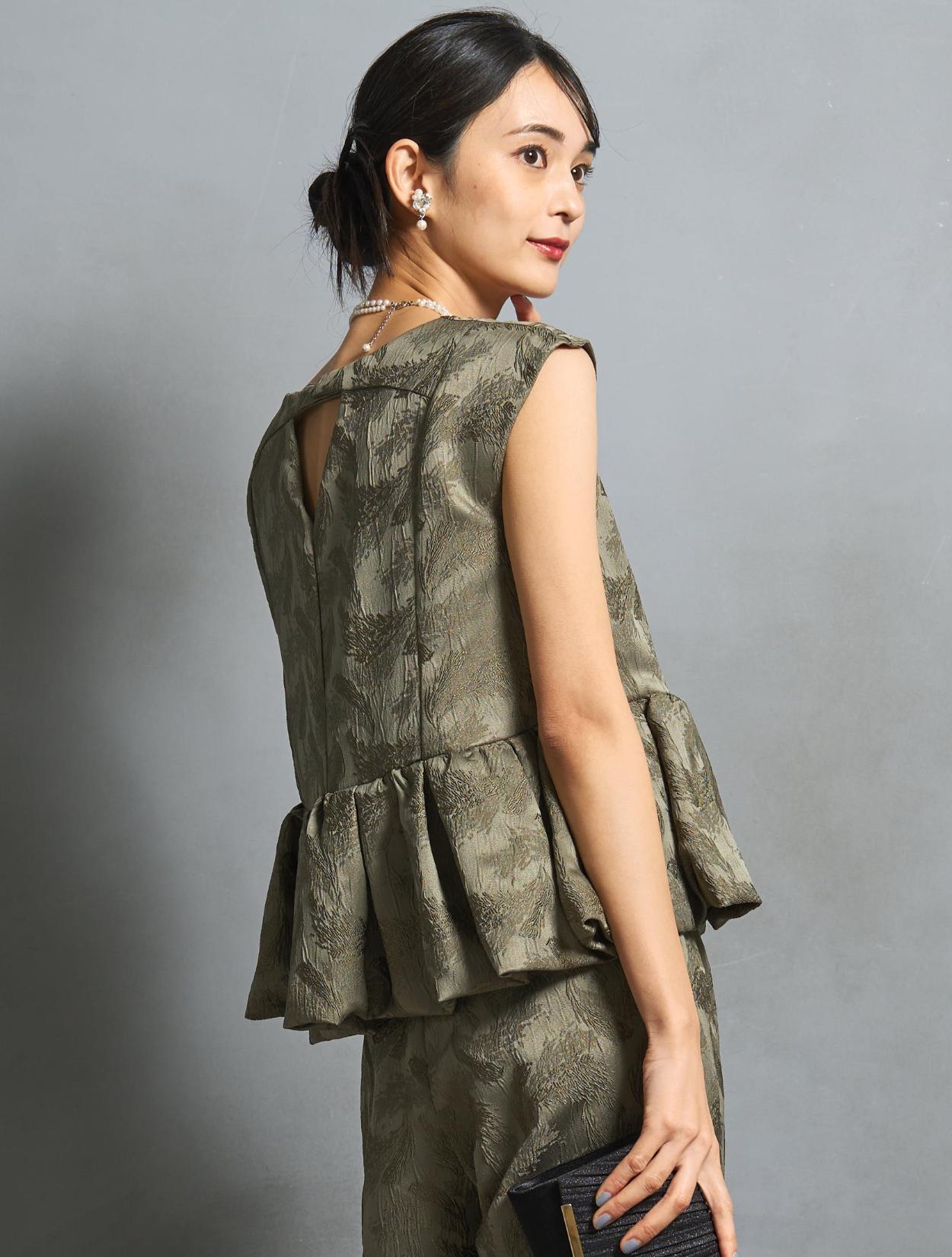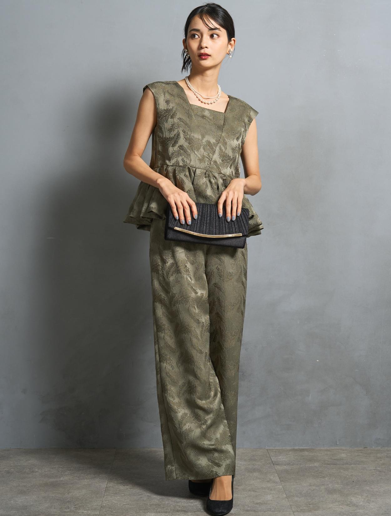 程よくボリュームのあるペルラムが大人かわいいパンツスタイルドレス。この絶妙なボリュームのペプラムデザインが、スタイルアップして見えるポイントでもあります。トップスのペプラムの切り替え位置は、ウエストを高く見せて脚長効果あり。微光沢のジャガード生地は、高級感もあり結婚式やパーティーのフォーマルシーンにもぴったりです。照明などの光の当たり方によって、フェザーの柄が映えておしゃれ。トレンドのパンツドレスですが、周りと被りにくく一目置かれる着こなしができます。気になるお袖ですが、フレンチスリーブで肩が隠れるデザイン。結婚式でも羽織りなしで着られます。露出が気になる方には、インナーブラウス(型番LDP000205)や、ショール(型番SDP0050)を合わせると◎。程よく開いたネックラインは、ネックレスが映えるデザイン。また、ネックからVに入ったラインは、首周りや上半身をスッキリ見せてくれます。短い首がお悩みの方でもきれいに着こなしやすいのも嬉しいですね♪パンツは便利なポケット付き。ただ、シルエットが崩れてしまうので、物を入れ過ぎるのは要注意です。