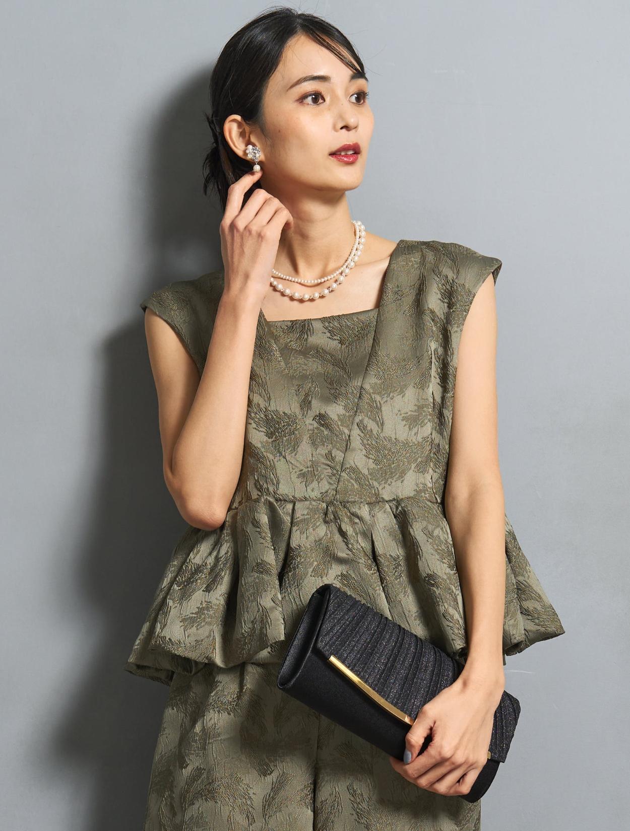 バッグはパーティー感のあるラメが入ったブラックバッグで、パンツドレスにフォーマル感をプラス。パールのネックレスも、結婚式や様々なフォーマルなシーンにおすすめのアイテムです。結婚式はもちろん、特別な日のお食事会や女子会などにもおすすめです。