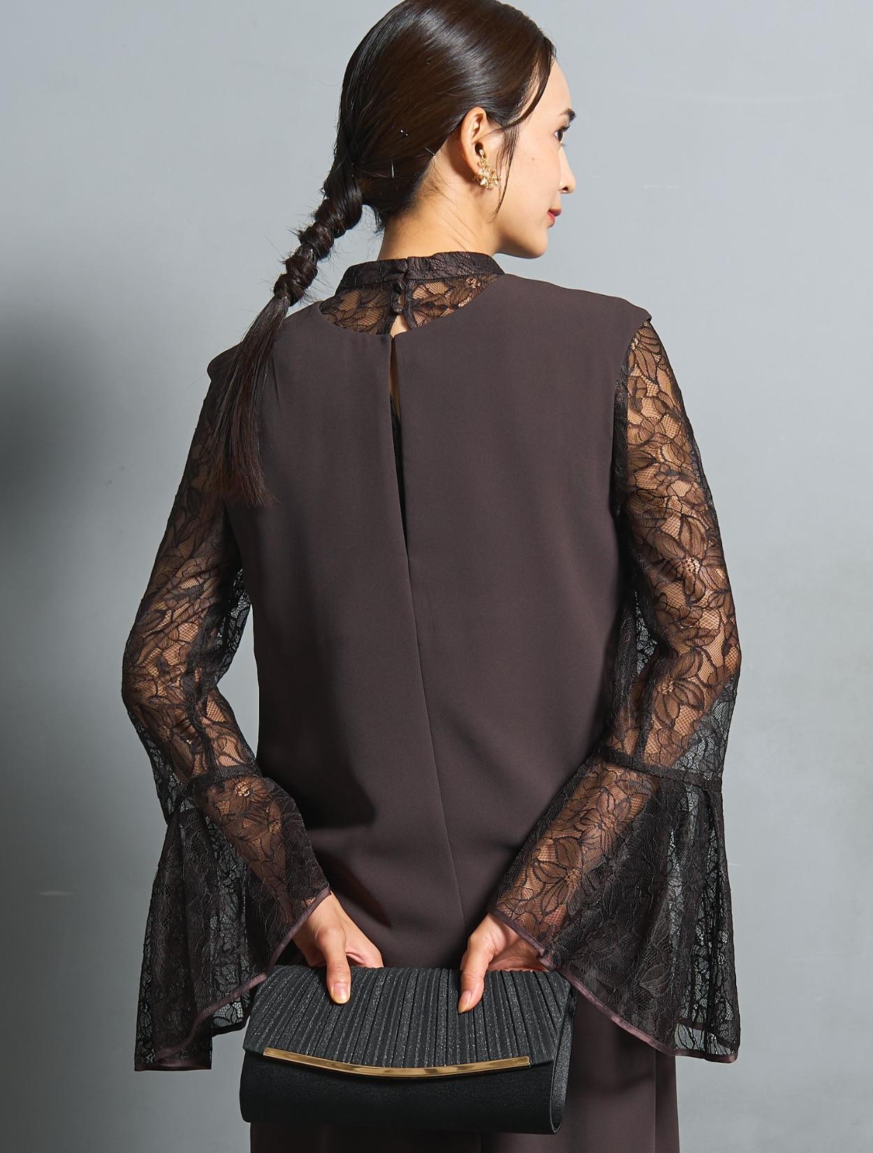 一番目を引くデザインは、何と言っても存在感のあるレースのお袖。どの角度から見ても華やかに広がるベルスリーブが、シンプルなワンピースをドレッシーに見せてくれます。程よく大柄のレースも華やかに見えるポイントです。サテンのパイピングが施された袖口は、細かいディテールで高見えします。
