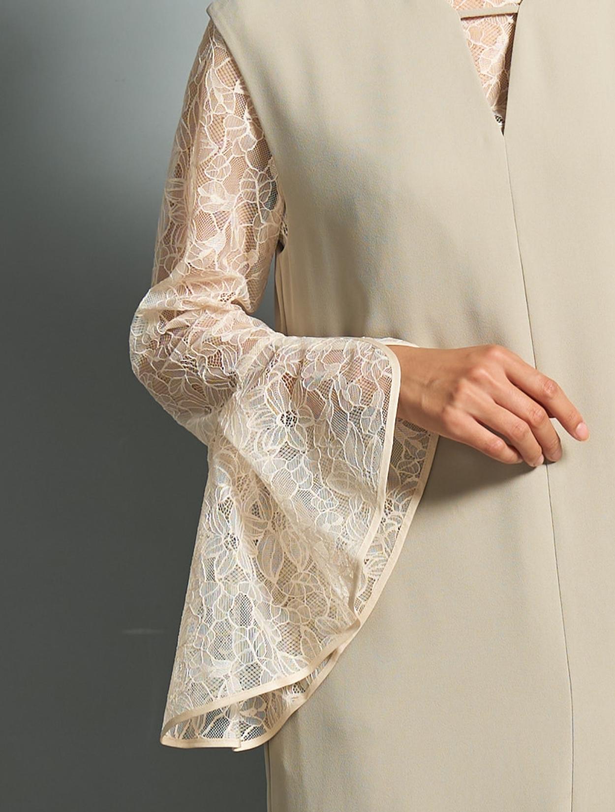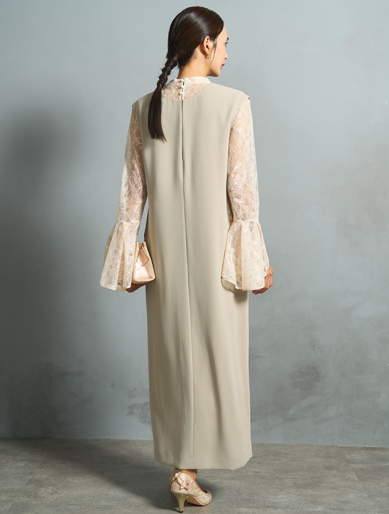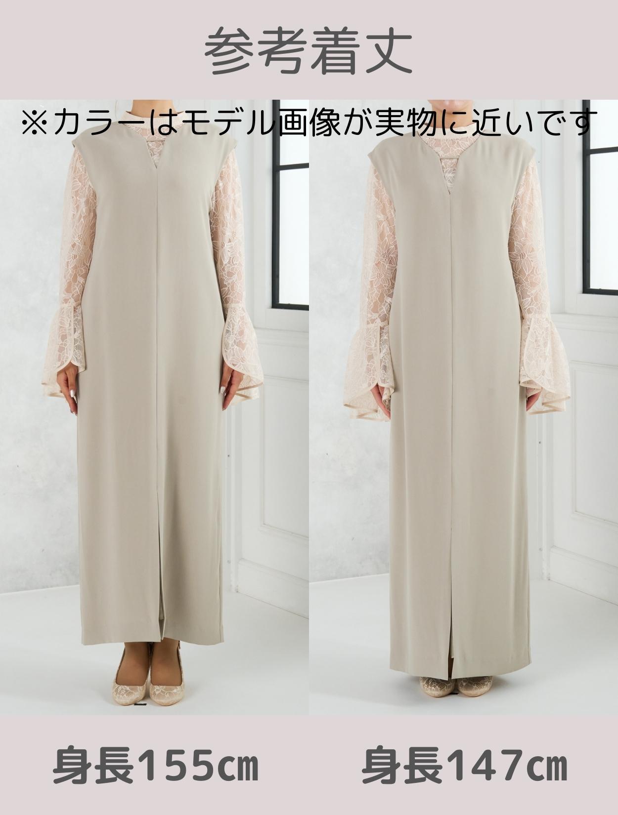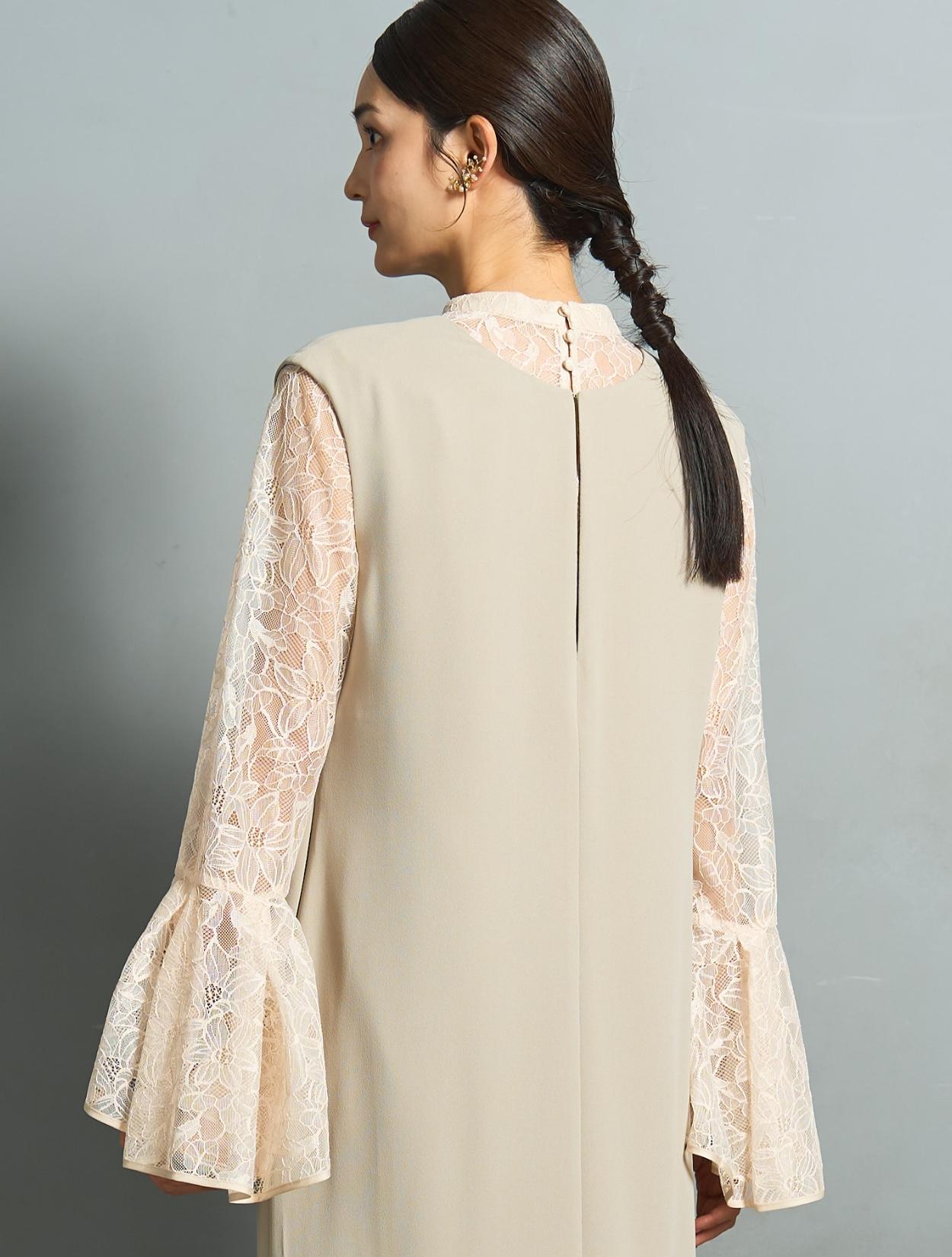 一番目を引くデザインは、何と言っても存在感のあるレースのお袖。どの角度から見ても華やかに広がるベルスリーブが、シンプルなワンピースをドレッシーに見せてくれます。程よく大柄のレースも華やかに見えるポイントです。サテンのパイピングが施された袖口は、細かいディテールで高見えします。