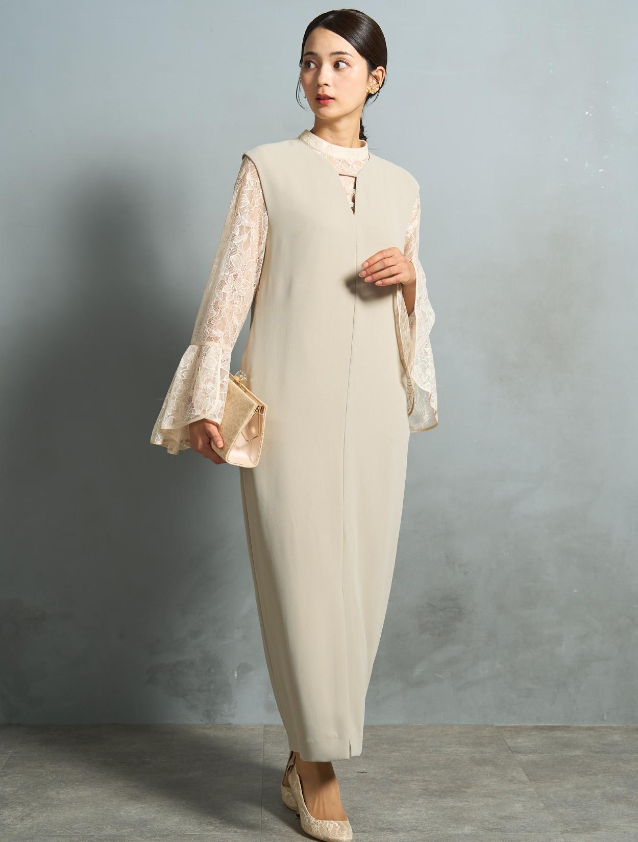 ワンピースは、黄色味の少ないミントベージュのカラーがおしゃれな印象。フェミニンになり過ぎない大人な色です。トレンドのニュアンスカラーで、色被りしにくいのも嬉しいポイント。インナーブラウスは優しい明るさのベージュ。肌なじみが良く上品さが出ます。様々な肌色の方に馴染みやすい配色。