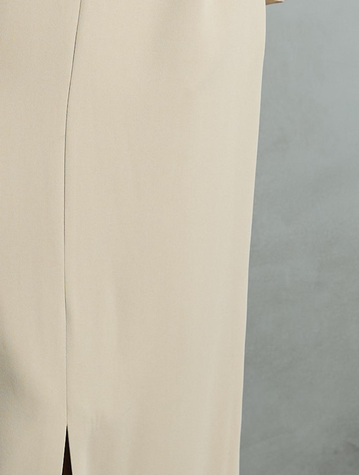 シンプルなストレートラインのワンピースは、ボディラインをカバーしつつもどこかモードでおしゃれな印象。フレンチスリーブに近い肩のラインは、肩幅広めな方や骨格ナチュラルさんでも着こなしやすいデザインです。Vネックのデザインは、肩がずり落ちにくい仕様になっているので、肩幅が狭い方やなで肩さんにもおすすめ。ワンピースは前後どちらを前にしても着用可能な2wayデザイン。Vカットのバーデザインをフロントにすると今っぽいトレンドの着こなしに。逆にしてクルーネックで着ても◎。ホックを外すと、正面が深いスリットになり抜け感のある着こなしも出来ます。