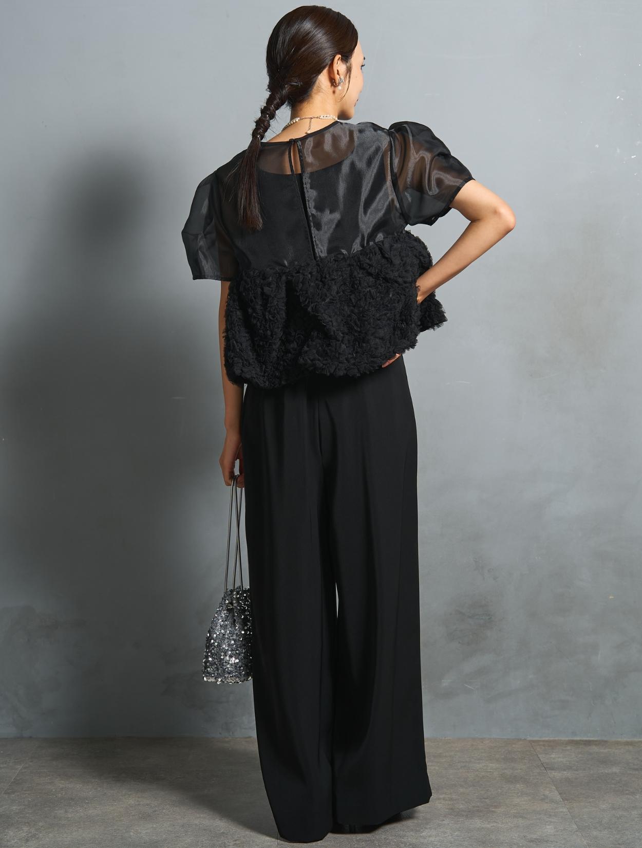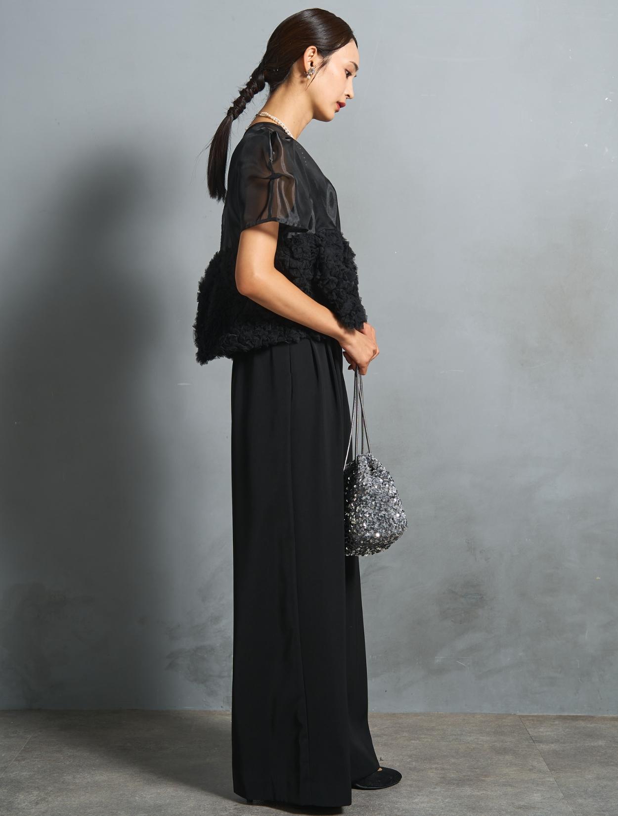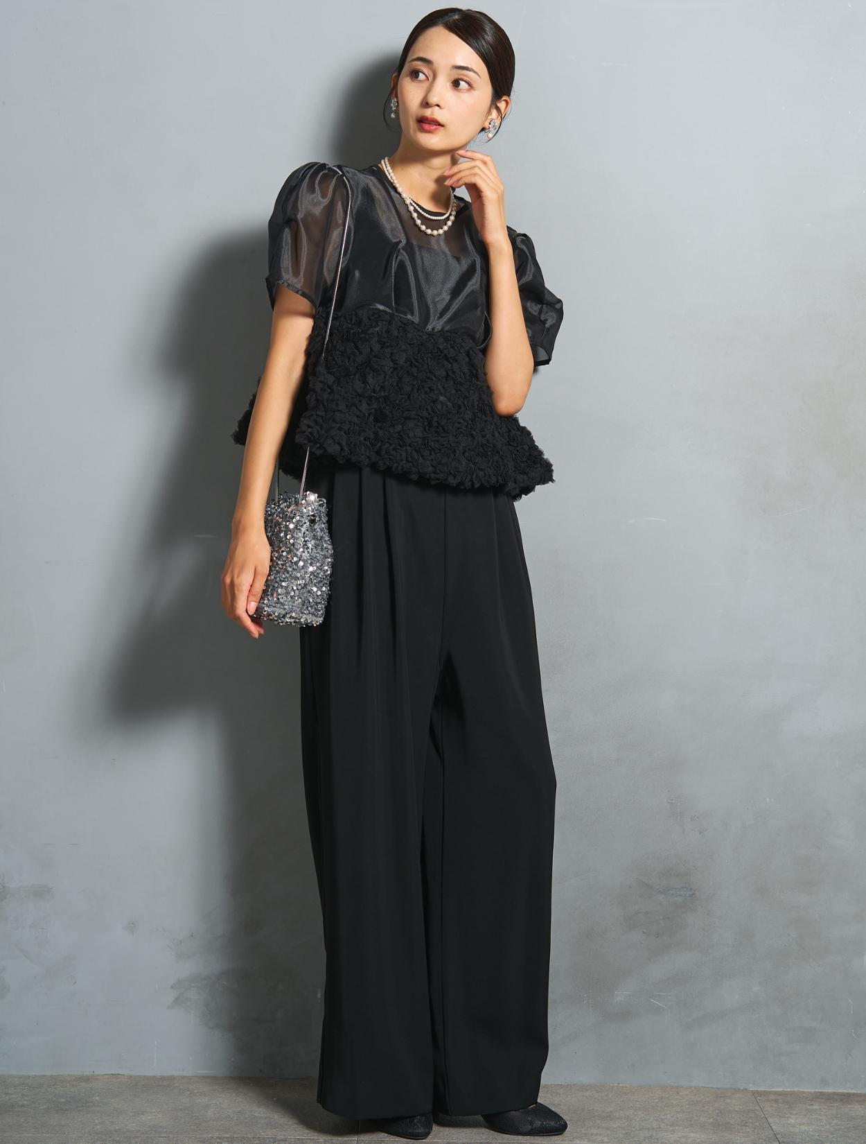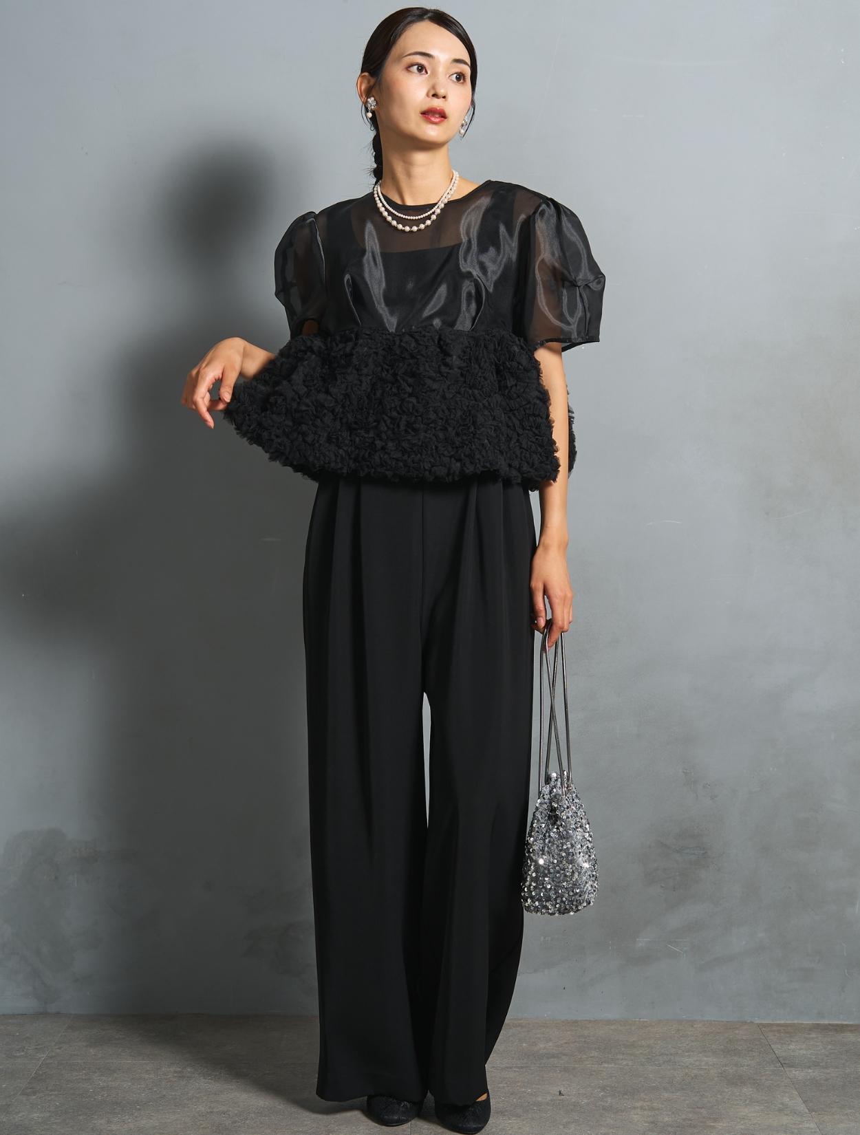 程よい光沢とハリのあるオーガンジーのブラウスが印象的なパンツドレス。バスト下は、チュールのフリル刺繍が凝ったディテール。タックを入れたペプラムは絶妙なボリュームで、むしろ華奢見えするデザインです。オーガンジーの透け感で、ボリュームが重たく見えないのもポイント。パフスリーブも透け感があり、ドロップショルダーが肩幅をカバーしてくれます。