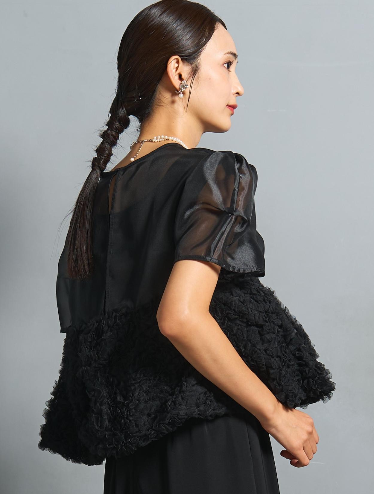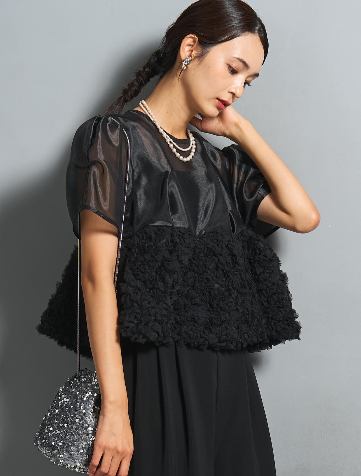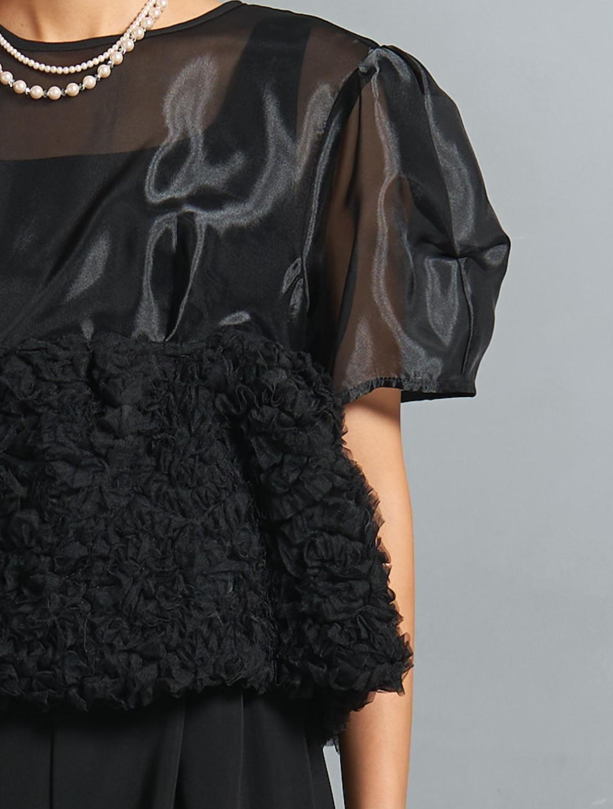 シックなブラックカラーですが、3種類の異なる素材感で立体的な表情が楽しめます。オーガンジーブラウスには光沢があり、ブラックでも地味に見えないおしゃれさがポイントです。