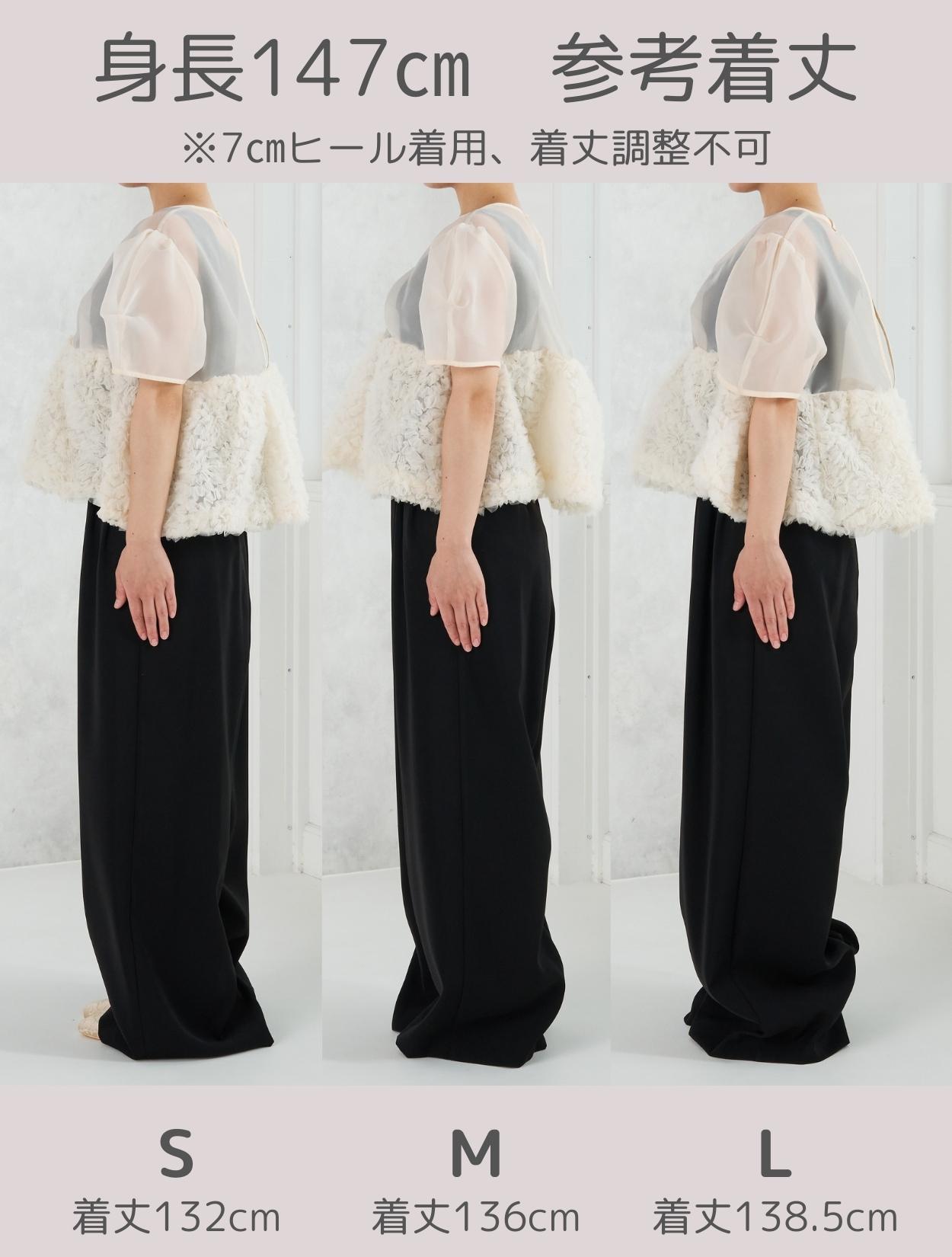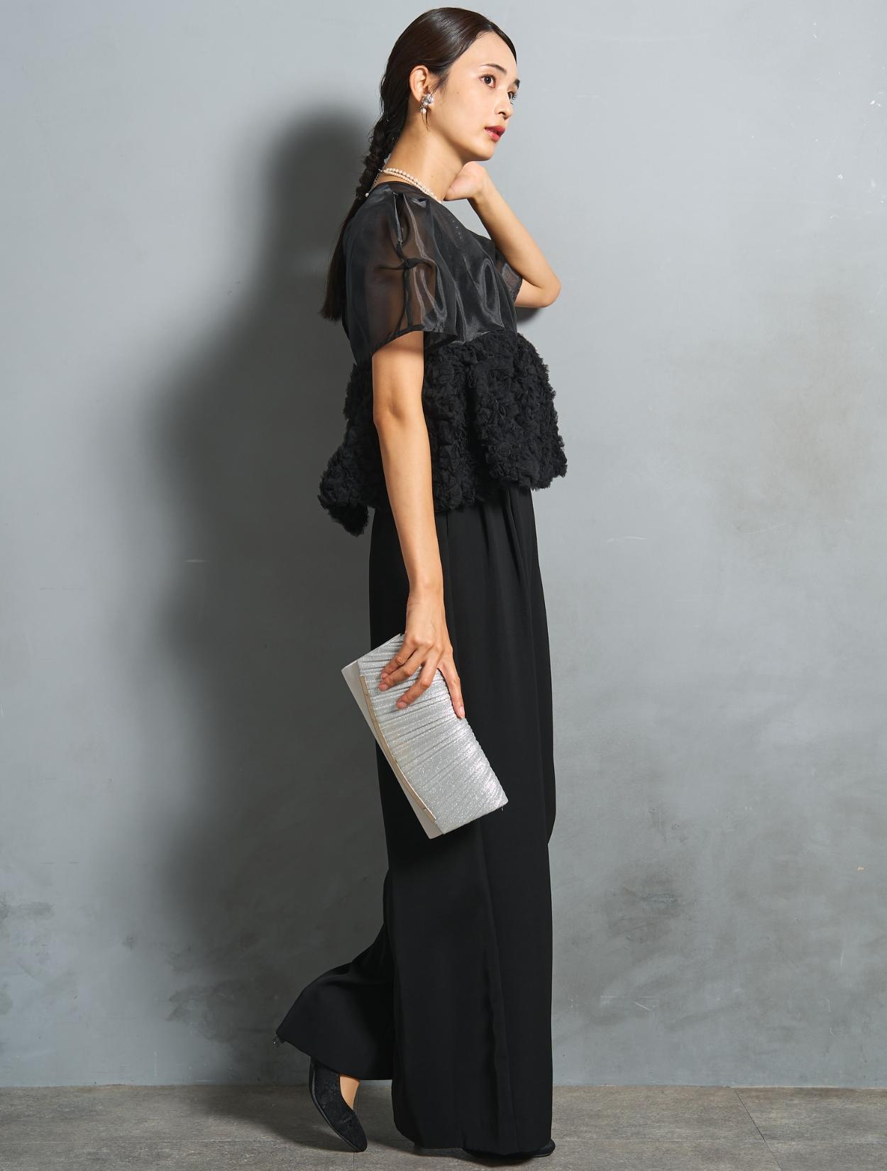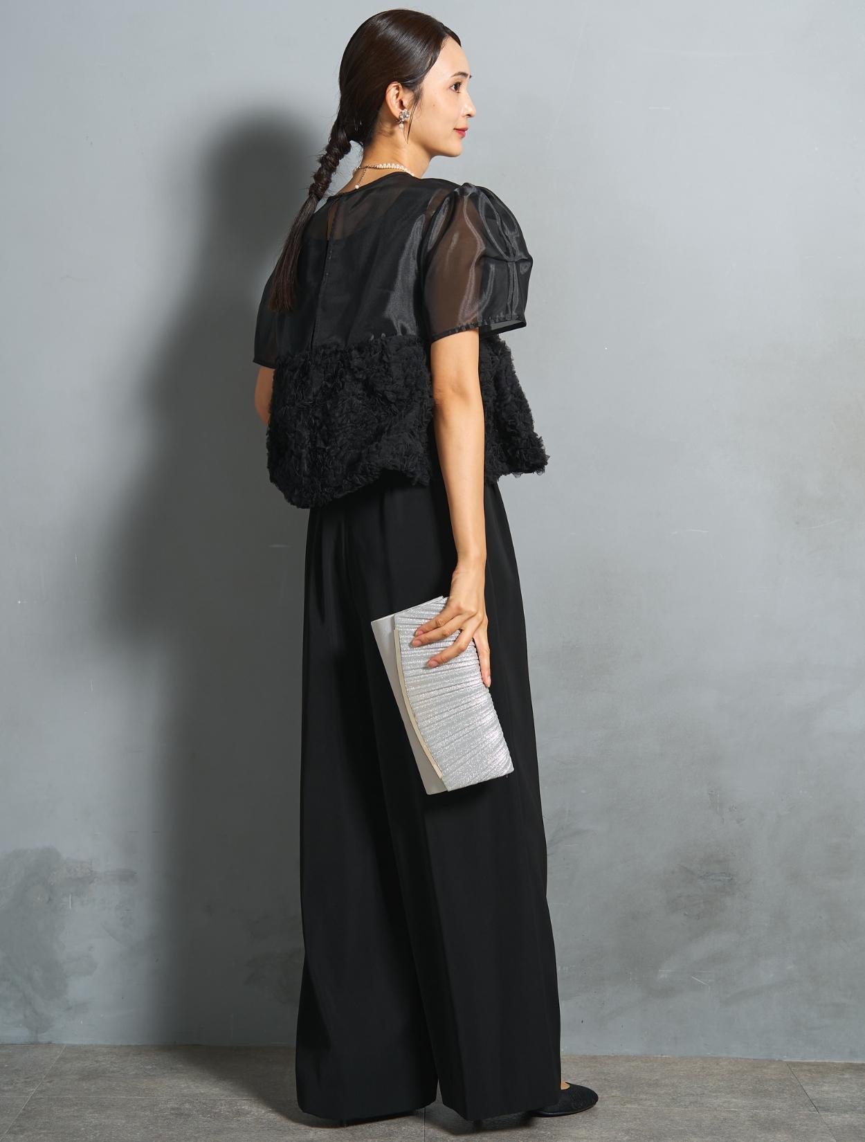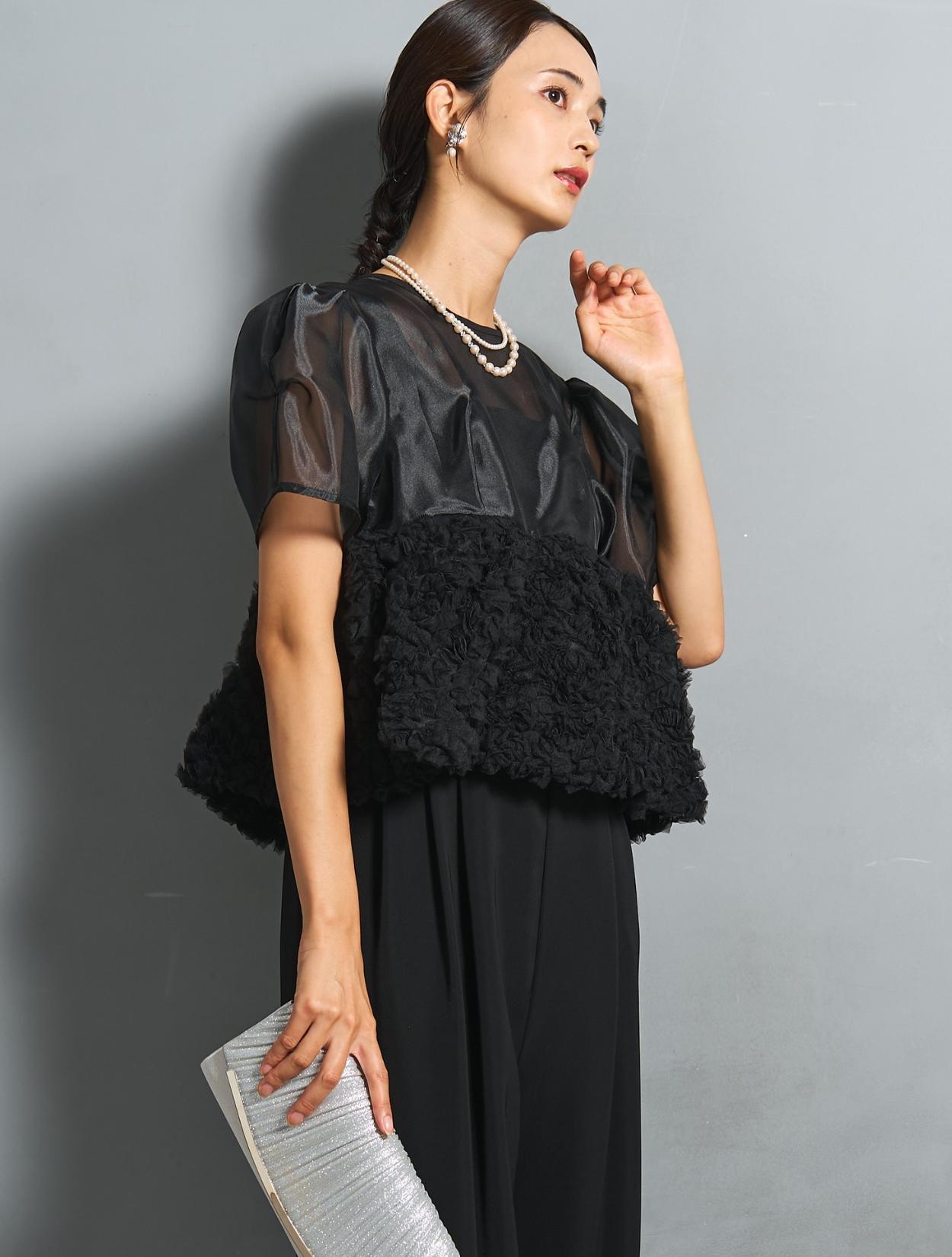 程よい光沢とハリのあるオーガンジーのブラウスが印象的なパンツドレス。バスト下は、チュールのフリル刺繍が凝ったディテール。タックを入れたペプラムは絶妙なボリュームで、むしろ華奢見えするデザインです。オーガンジーの透け感で、ボリュームが重たく見えないのもポイント。パフスリーブも透け感があり、ドロップショルダーが肩幅をカバーしてくれます。