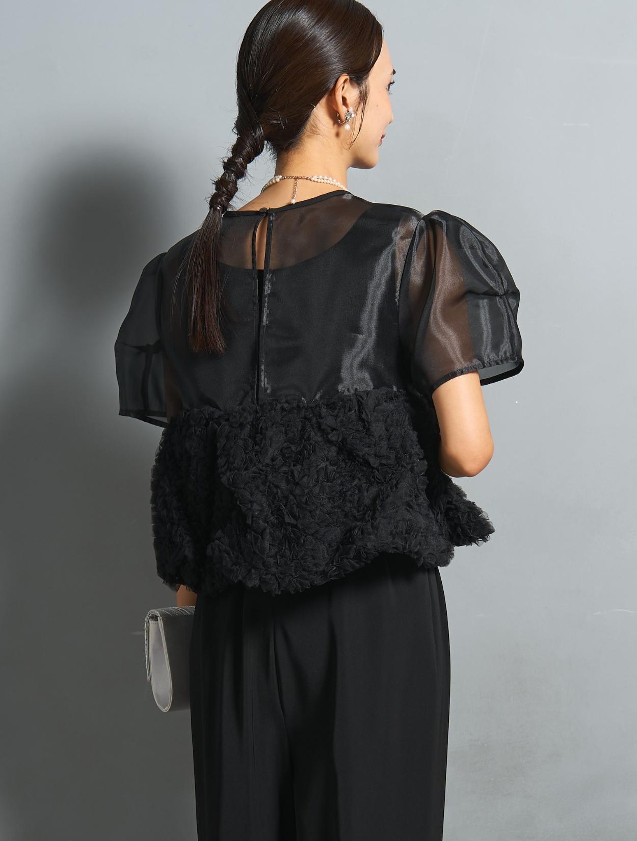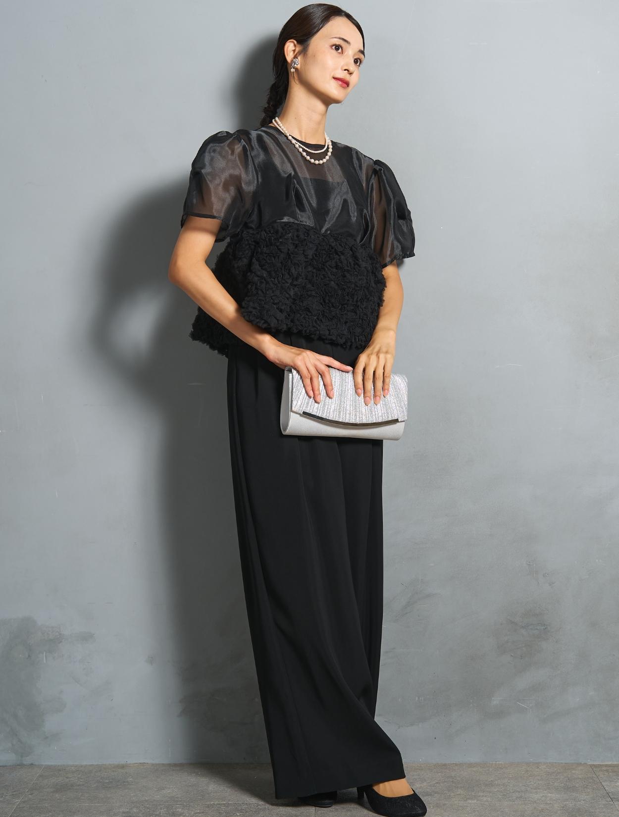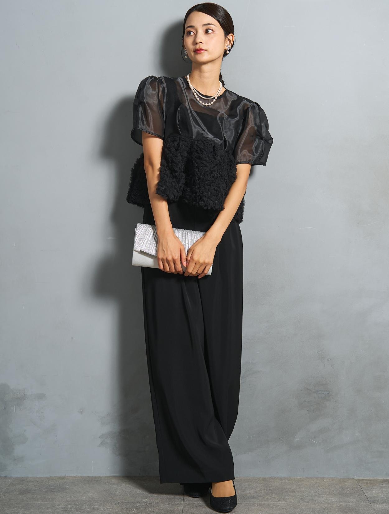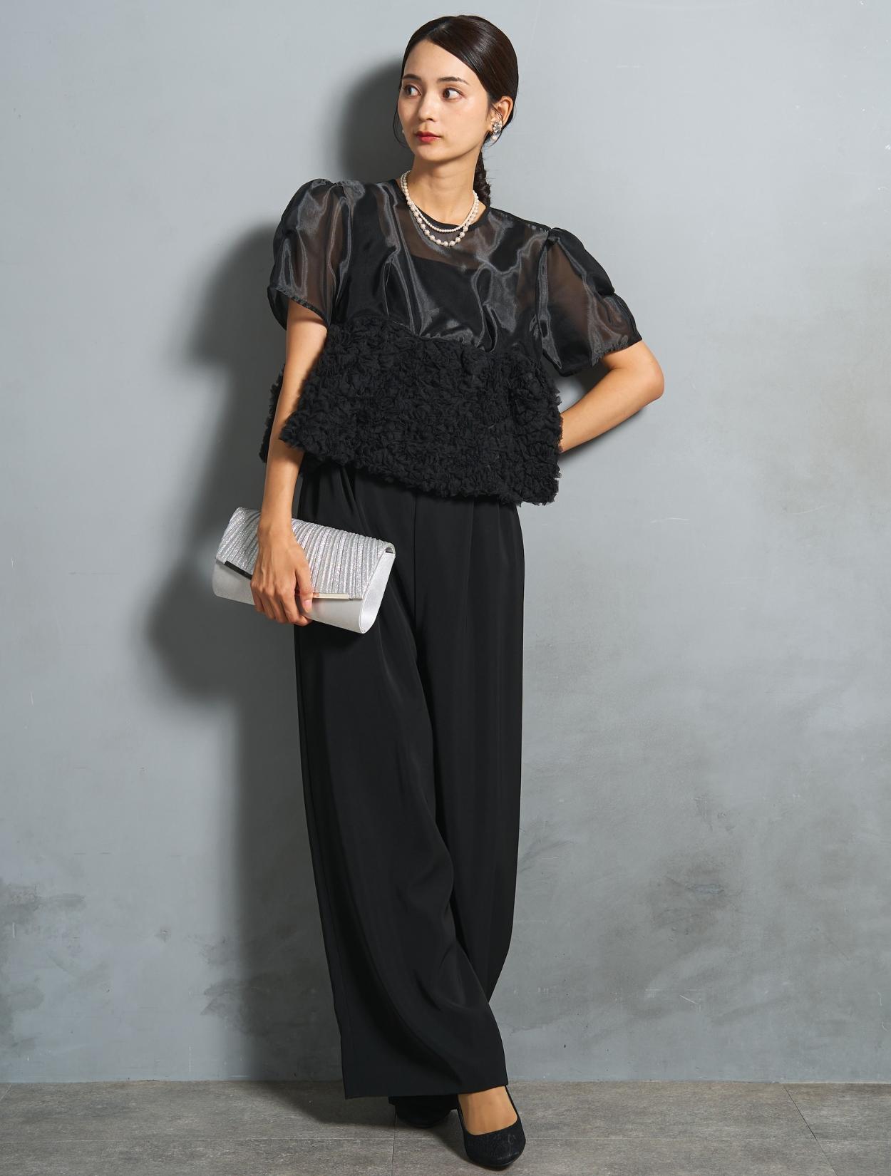 シックなブラックカラーですが、3種類の異なる素材感で立体的な表情が楽しめます。オーガンジーブラウスには光沢があり、ブラックでも地味に見えないおしゃれさがポイントです。