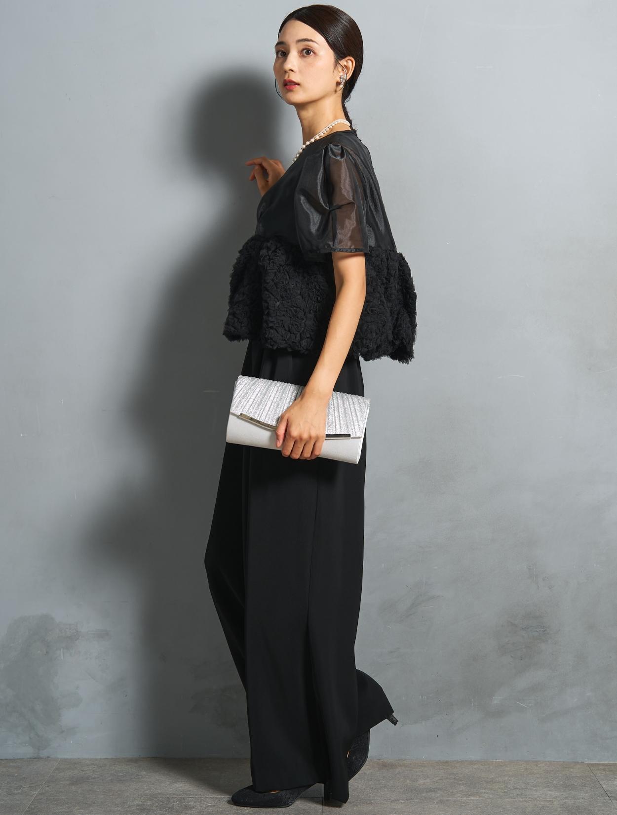 トレンドのパンツドレスに、フォーマル度の高いパーティーバッグを合わせたコーディネート。華やかなシルバーラメのバッグは、ブラックのパンツドレスを華やかなパーティースタイルに見せてくれます。フォーマルなシーンにおすすめのパールのネックレスを合わせることで、パンツドレスをきちんと感のある雰囲気で着こなしたい方に最適なコーディネートです。
