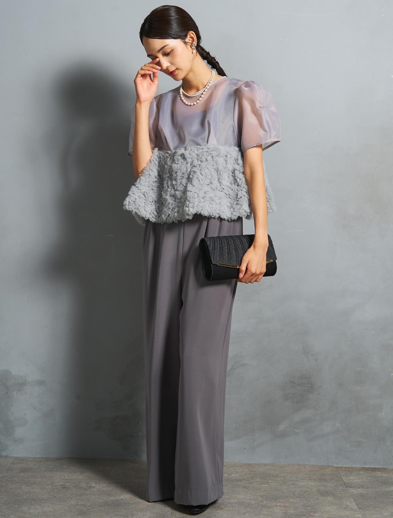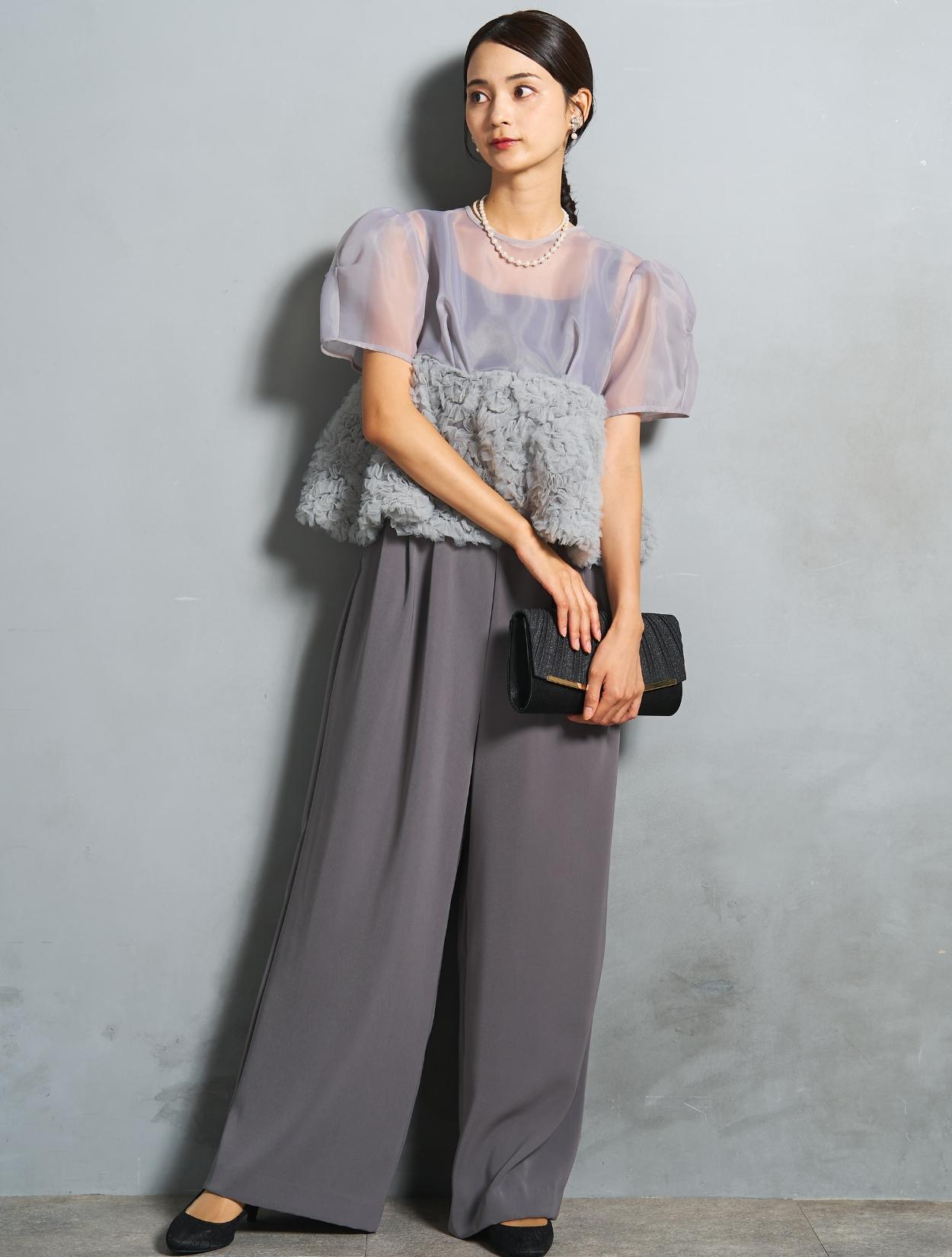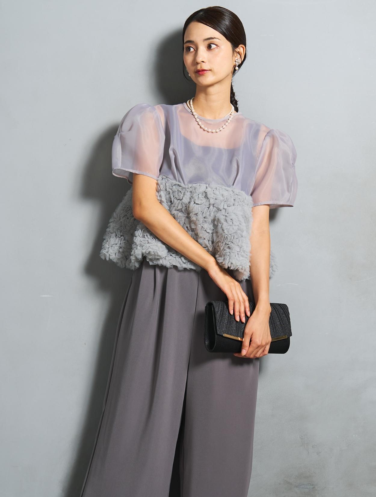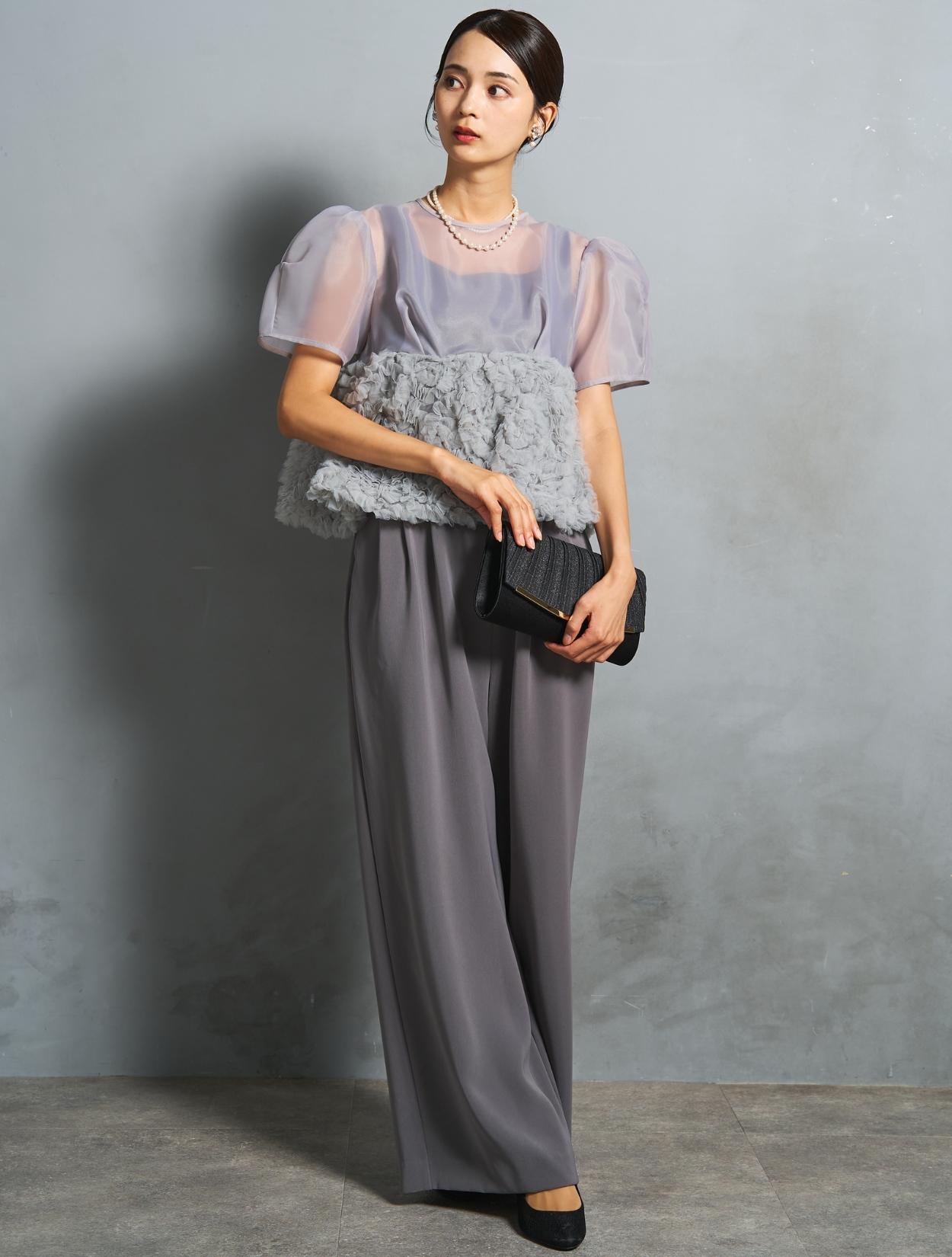 程よい光沢とハリのあるオーガンジーのブラウスが印象的なパンツドレス。バスト下は、チュールのフリル刺繍が凝ったディテール。タックを入れたペプラムは絶妙なボリュームで、むしろ華奢見えするデザインです。オーガンジーの透け感で、ボリュームが重たく見えないのもポイント。パフスリーブも透け感があり、ドロップショルダーが肩幅をカバーしてくれます。