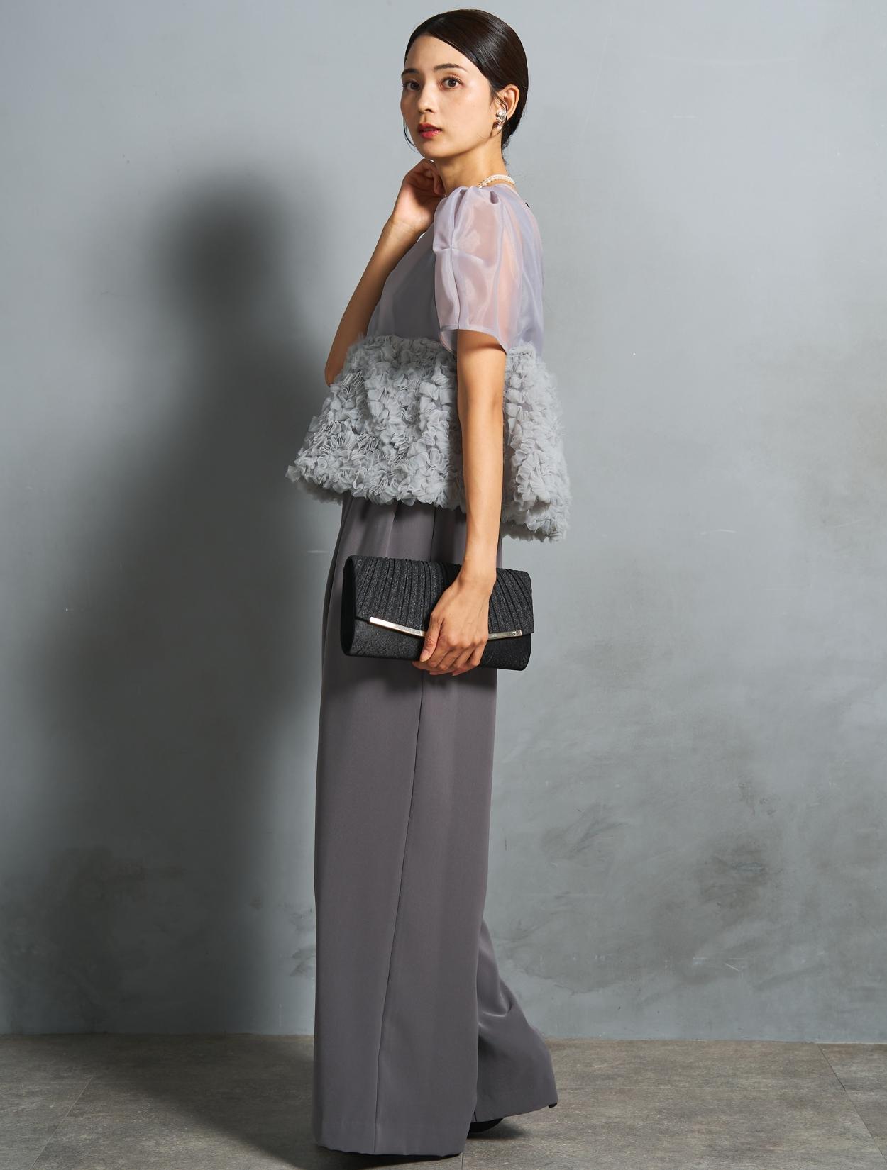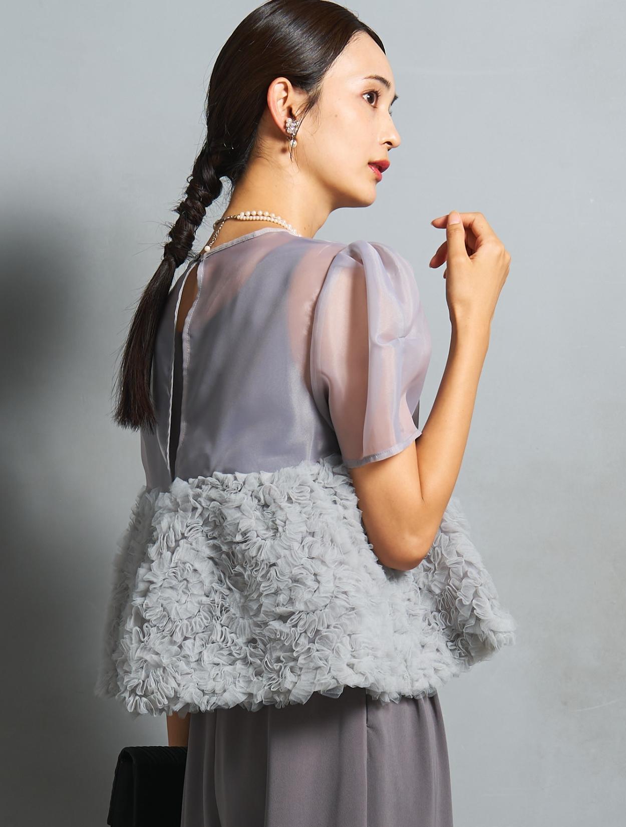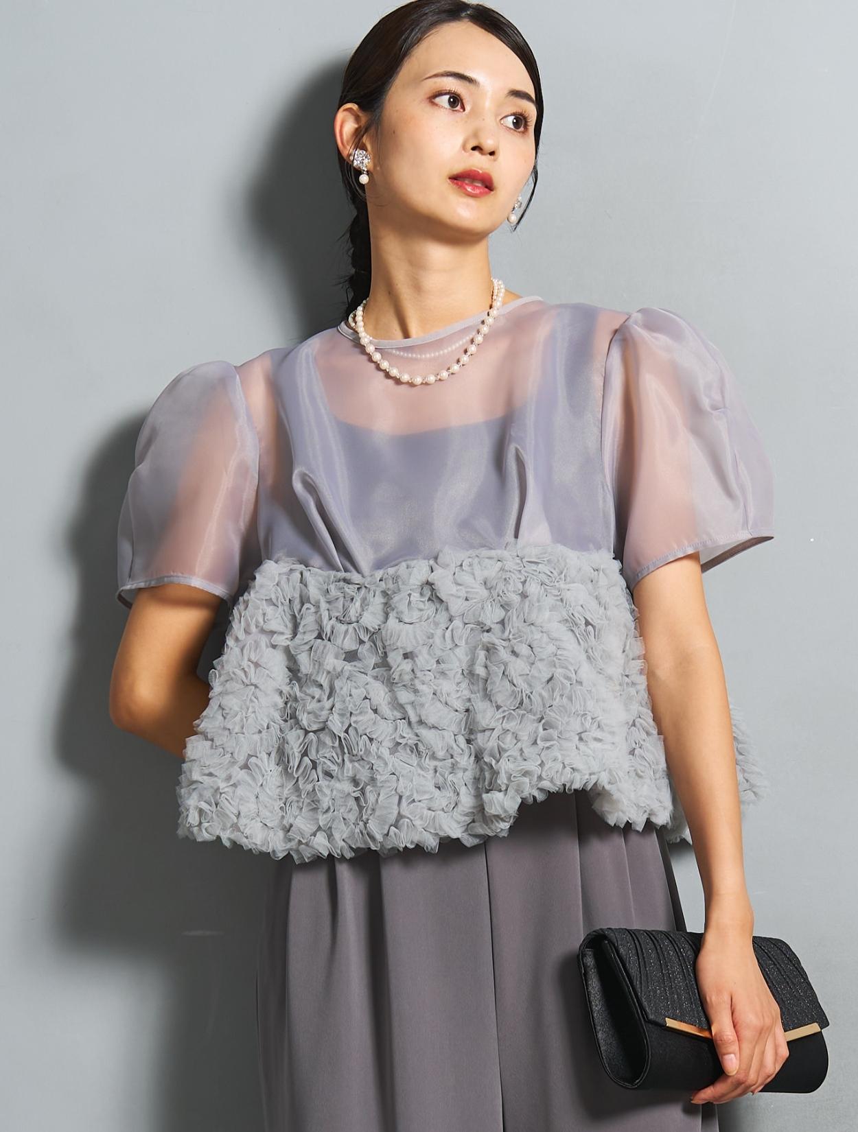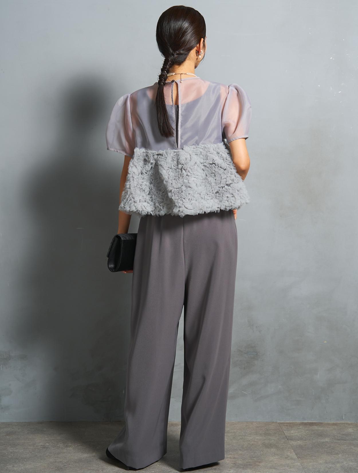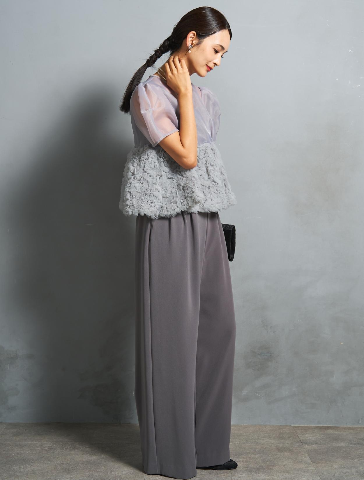 程よい光沢とハリのあるオーガンジーのブラウスが印象的なパンツドレス。バスト下は、チュールのフリル刺繍が凝ったディテール。タックを入れたペプラムは絶妙なボリュームで、むしろ華奢見えするデザインです。オーガンジーの透け感で、ボリュームが重たく見えないのもポイント。パフスリーブも透け感があり、ドロップショルダーが肩幅をカバーしてくれます。