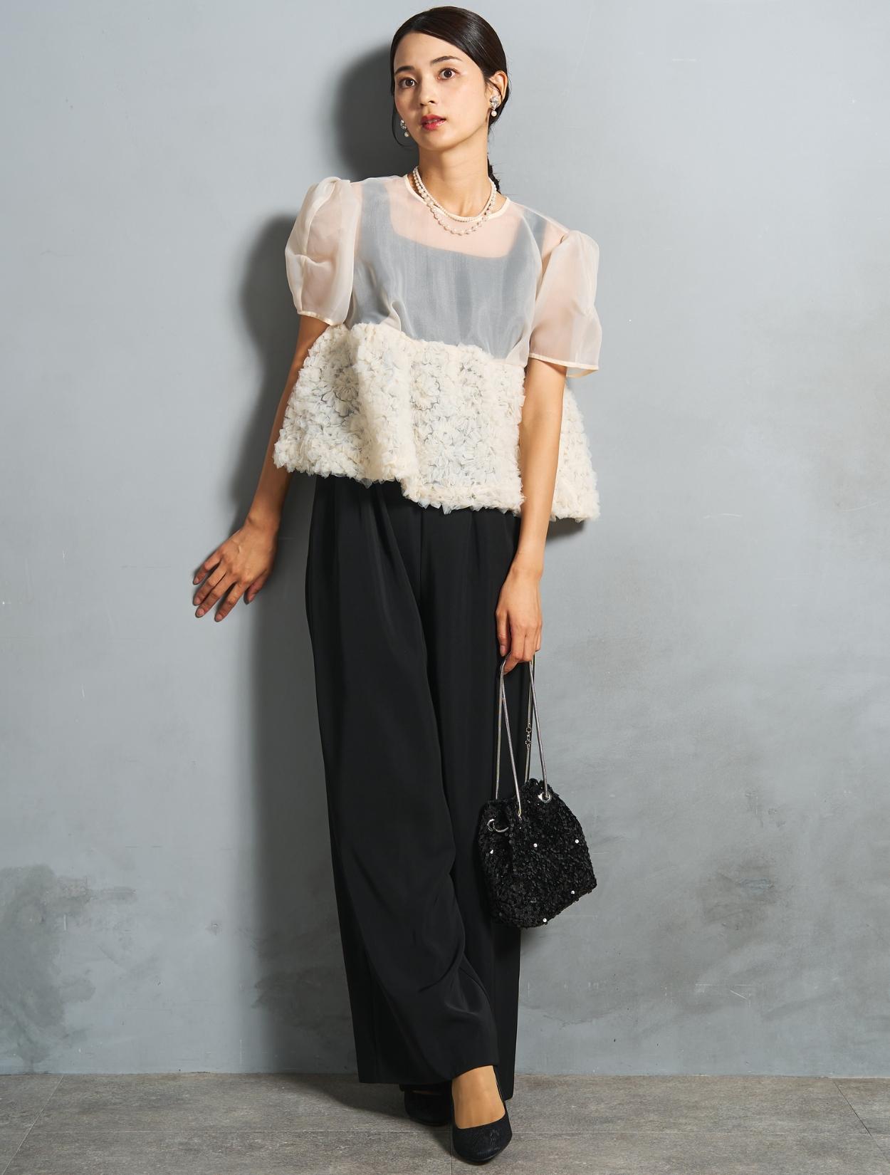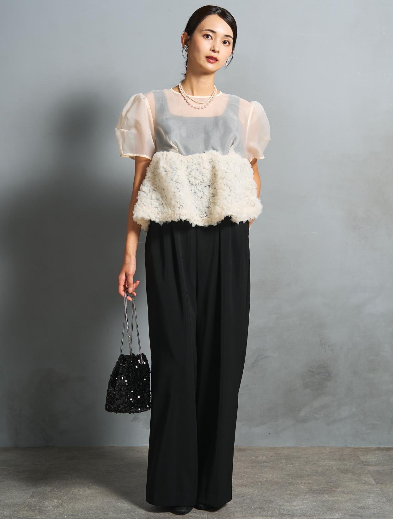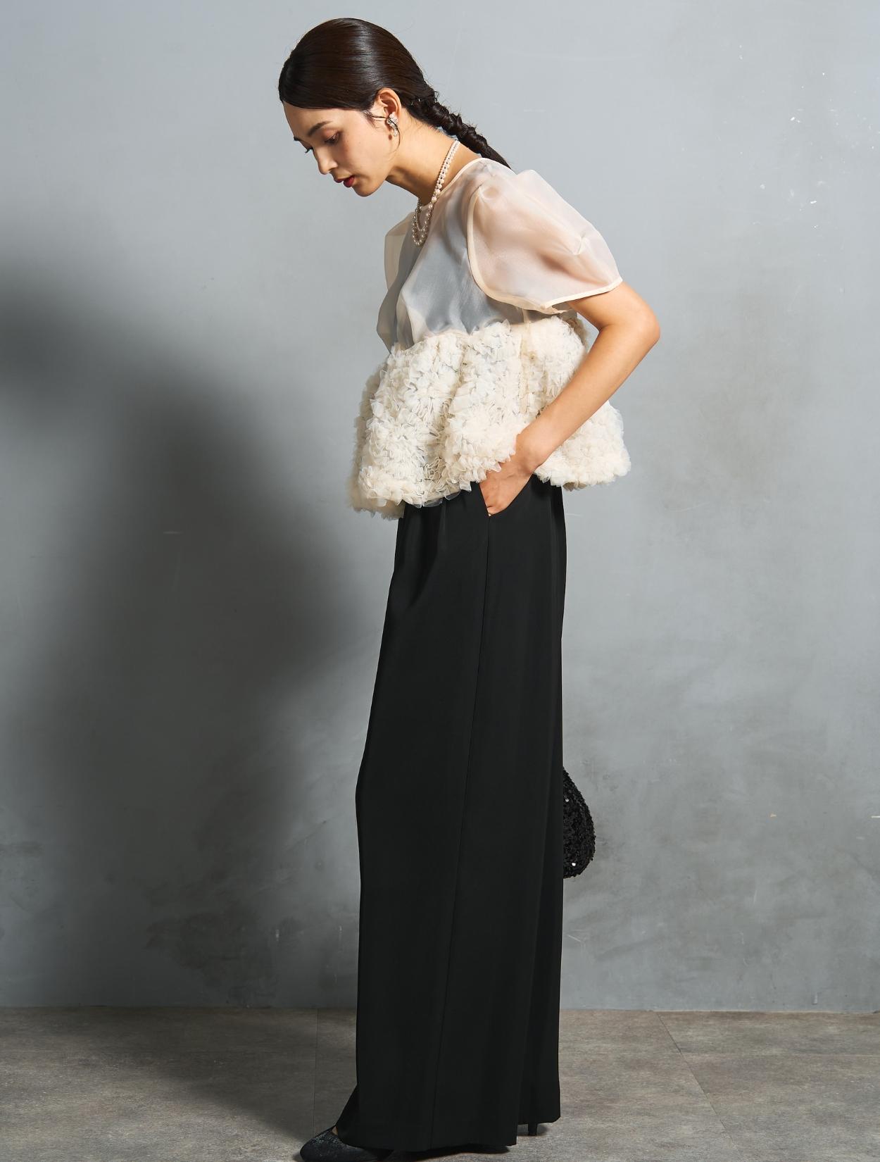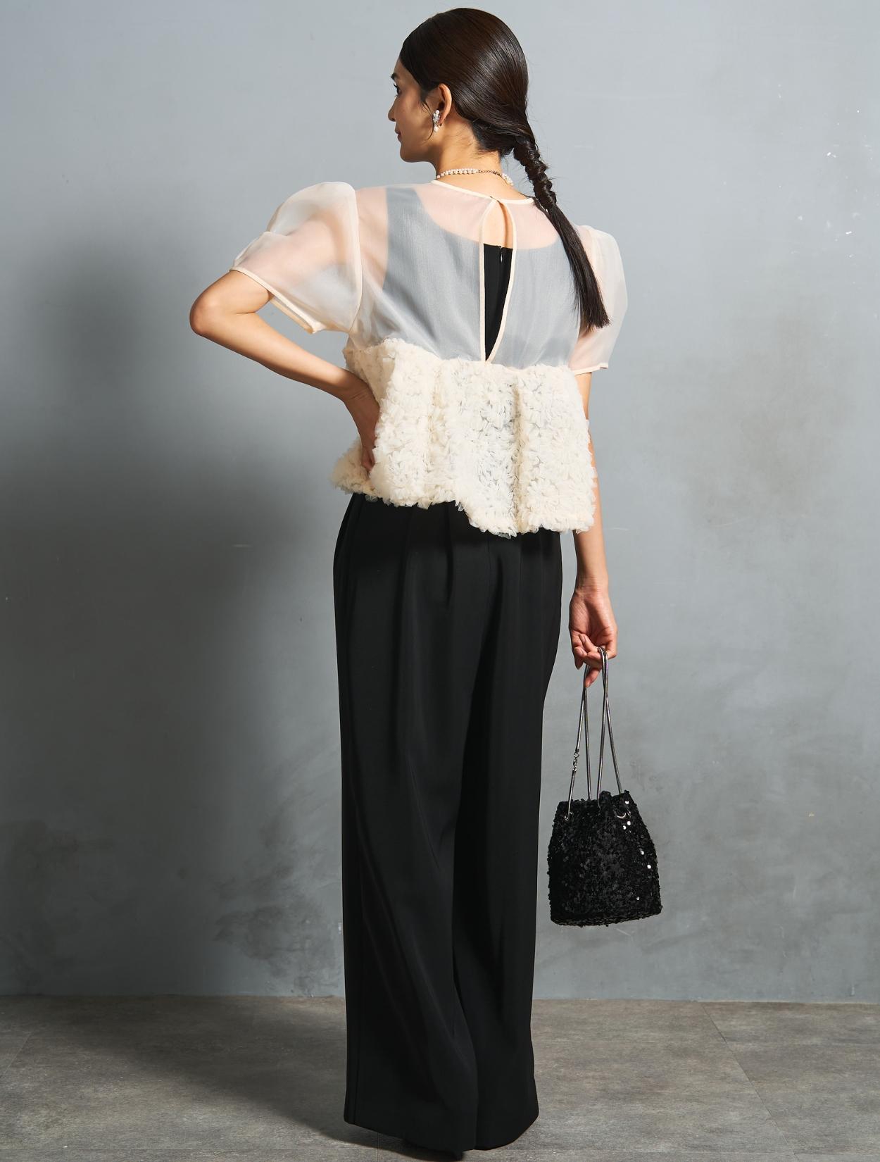 程よい光沢とハリのあるオーガンジーのブラウスが印象的なパンツドレス。バスト下は、チュールのフリル刺繍が凝ったディテール。タックを入れたペプラムは絶妙なボリュームで、むしろ華奢見えするデザインです。オーガンジーの透け感で、ボリュームが重たく見えないのもポイント。パフスリーブも透け感があり、ドロップショルダーが肩幅をカバーしてくれます。