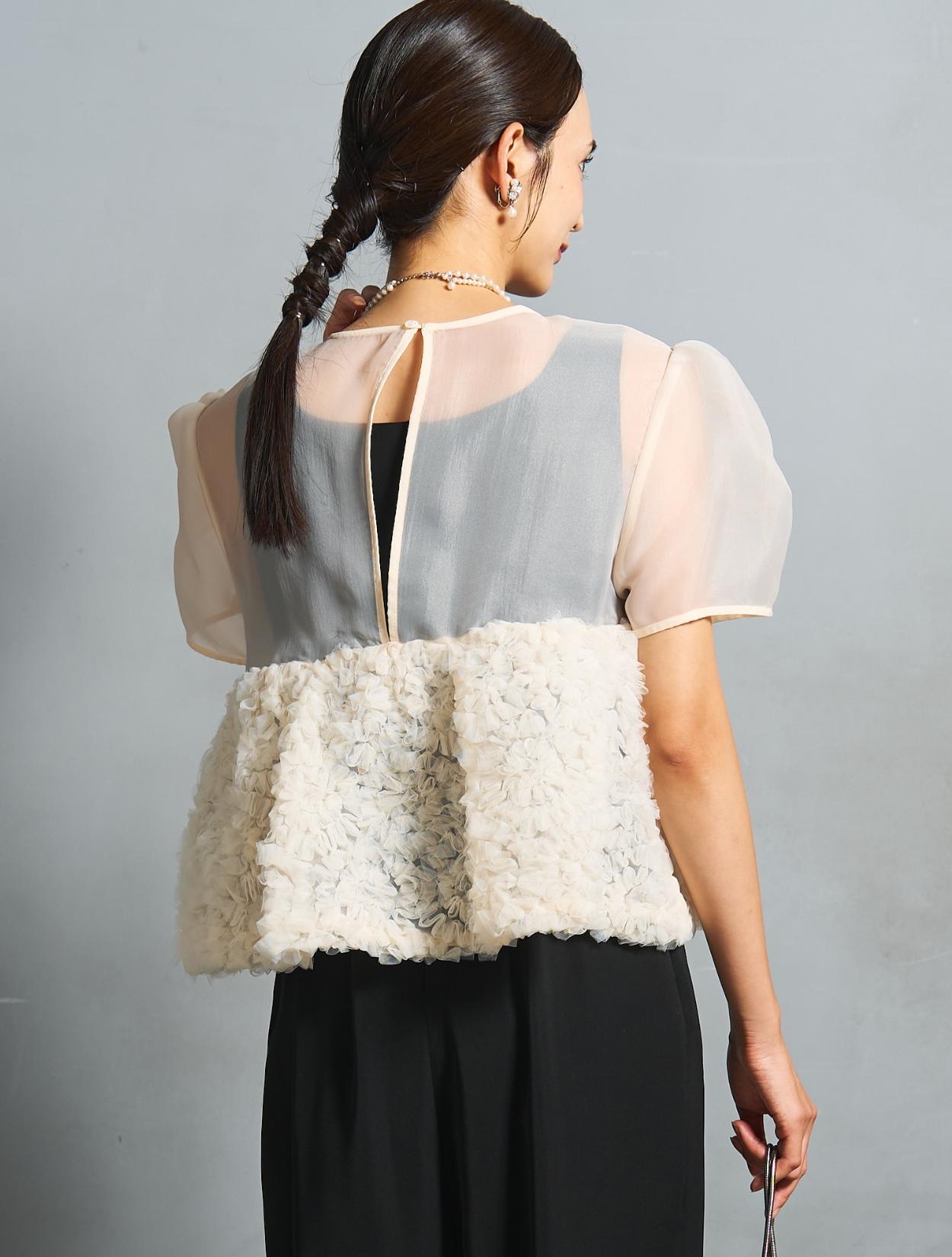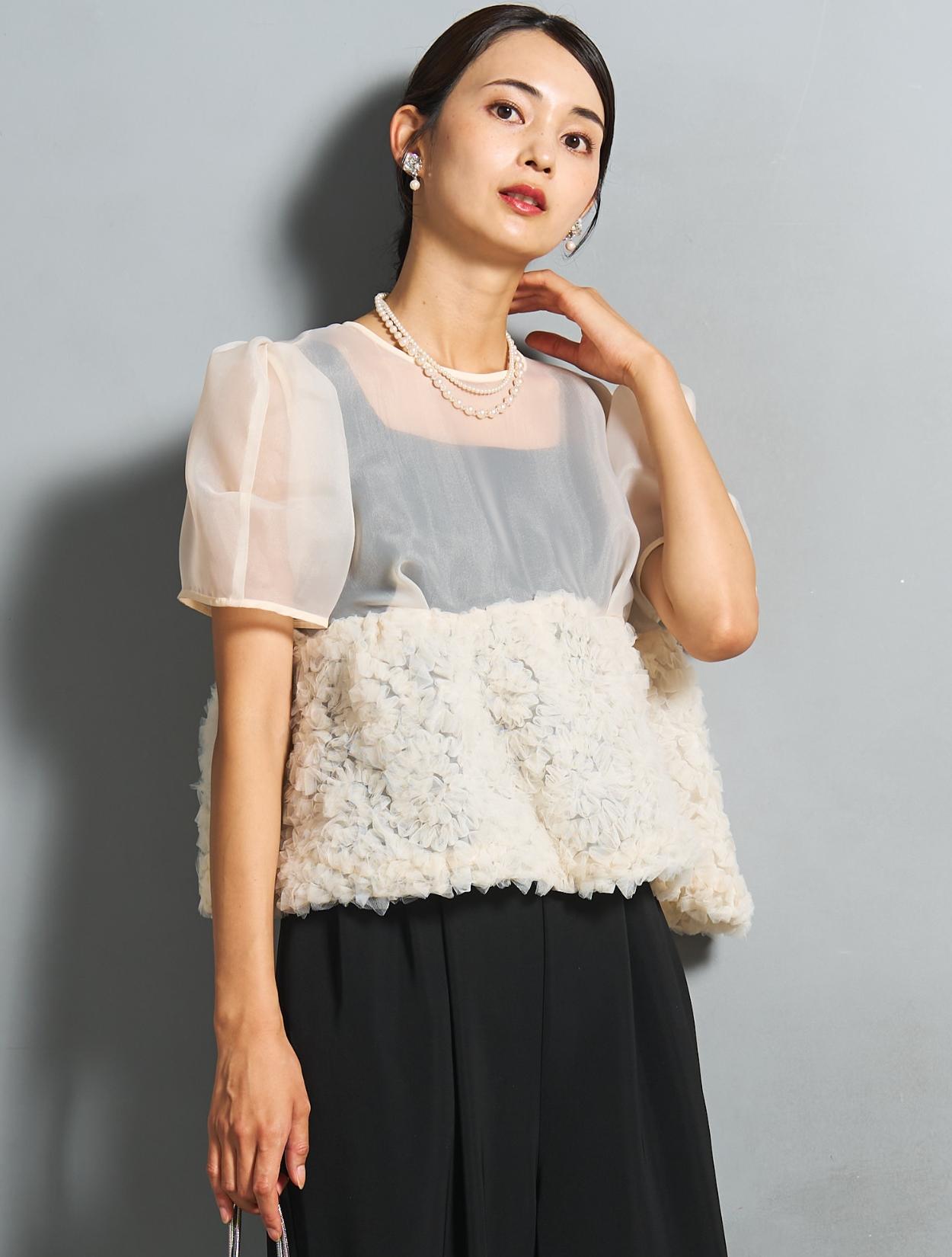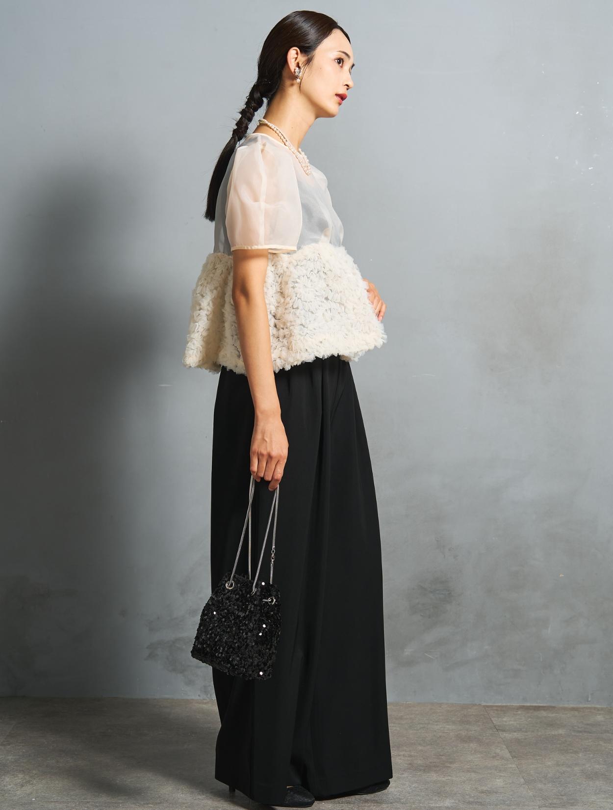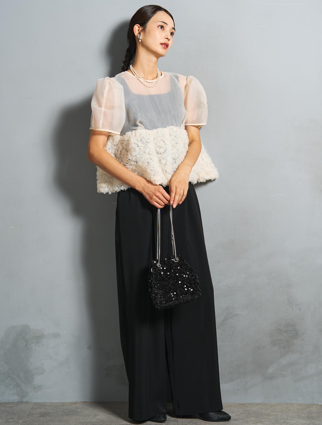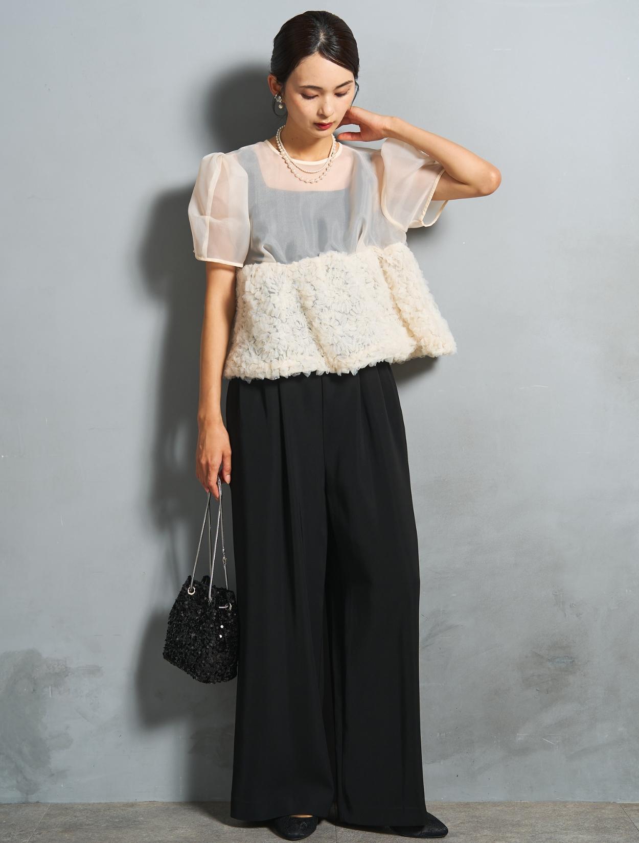 程よい光沢とハリのあるオーガンジーのブラウスが印象的なパンツドレス。バスト下は、チュールのフリル刺繍が凝ったディテール。タックを入れたペプラムは絶妙なボリュームで、むしろ華奢見えするデザインです。オーガンジーの透け感で、ボリュームが重たく見えないのもポイント。パフスリーブも透け感があり、ドロップショルダーが肩幅をカバーしてくれます。