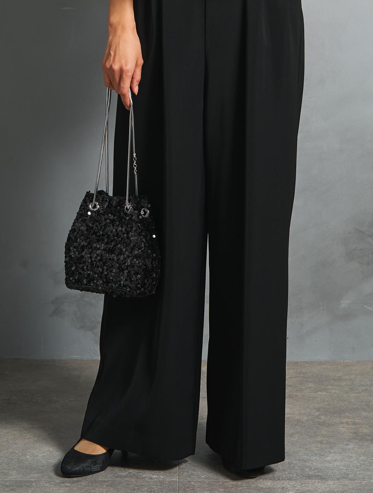 スパンコールの巾着バッグが大人可愛い今っぽいトレンドコーデ。肩掛けで使うと、いい意味でのラフさもあり人気のアイテムです。スパンコールが程よくキラキラするのでパーティー感もあり地味見えしません。2連のパールネックレスにもフォーマルな雰囲気がしっかりあるので安心感もあります。粒違いのパールは、お顔回りを上品に明るくしてくれる人気のアイテム。