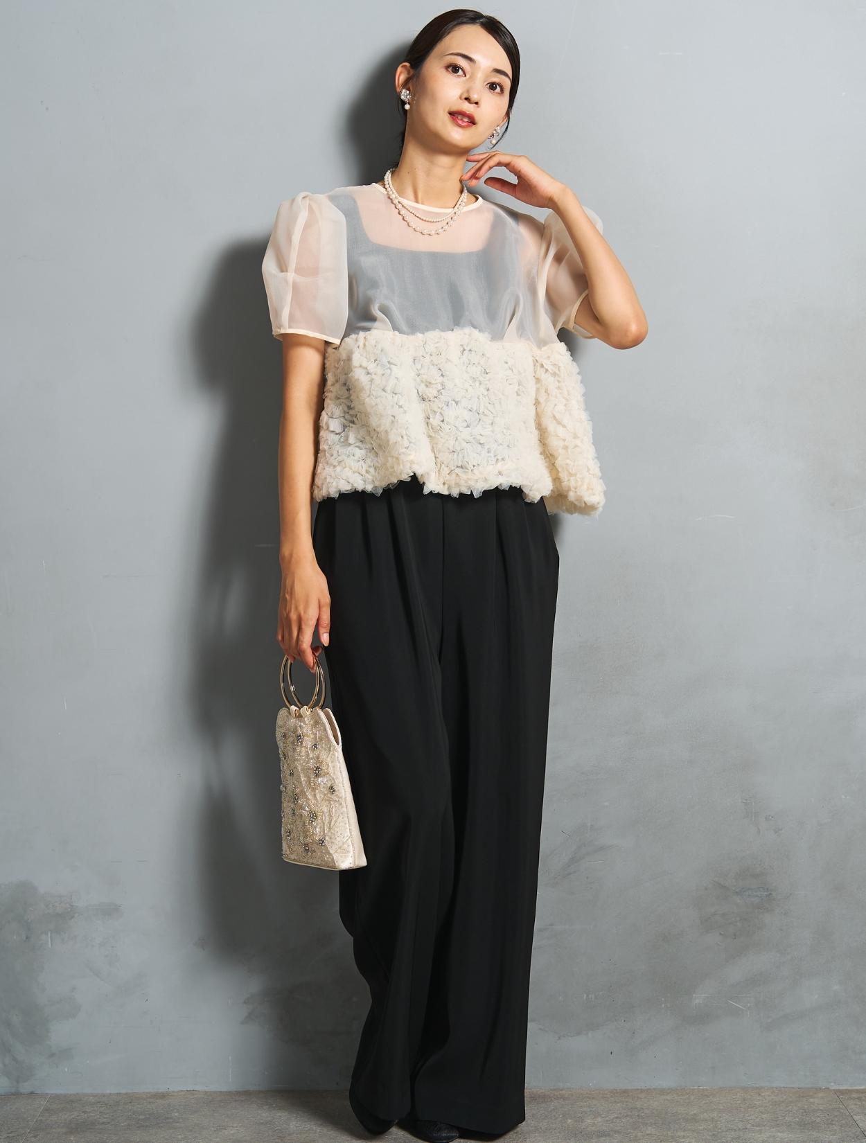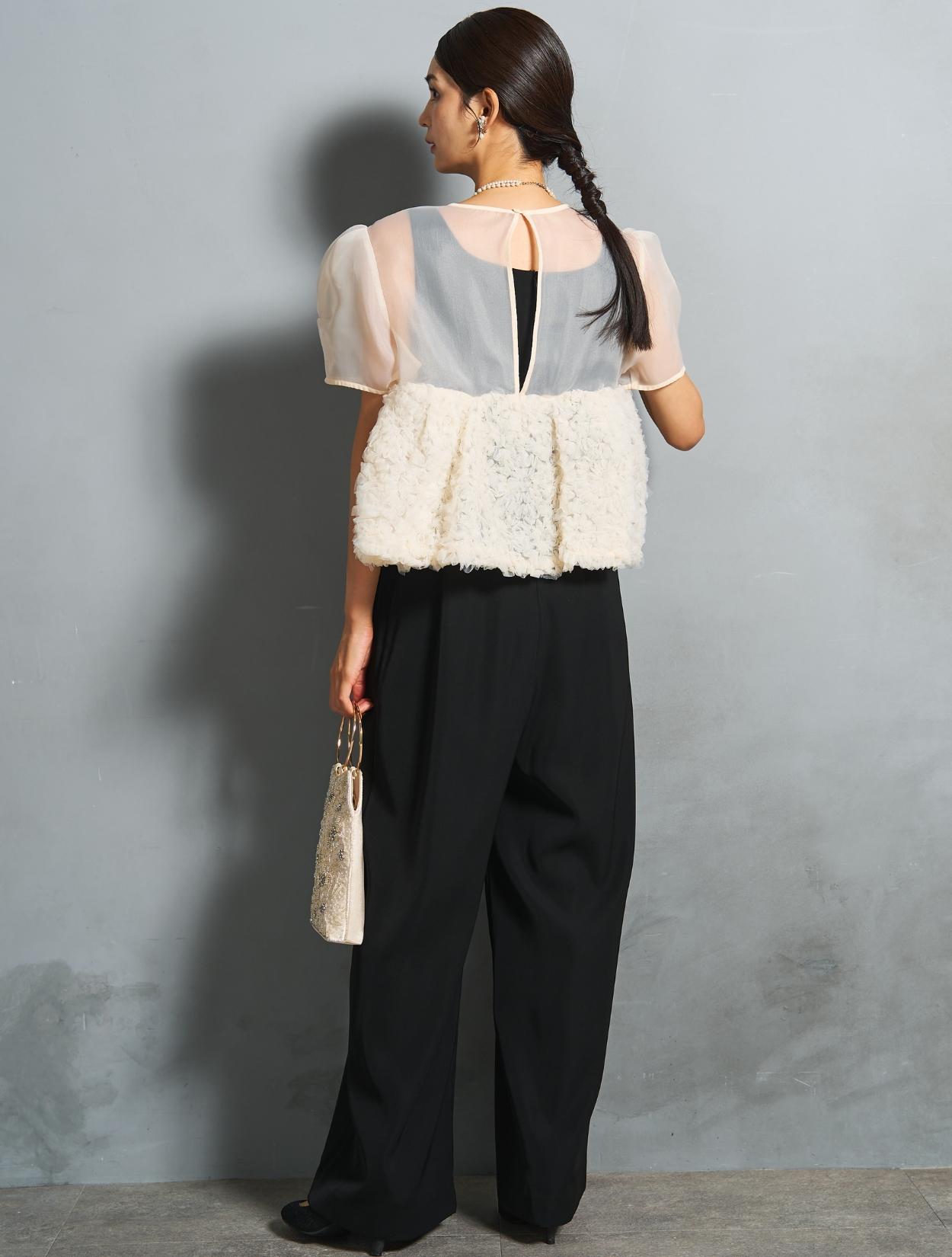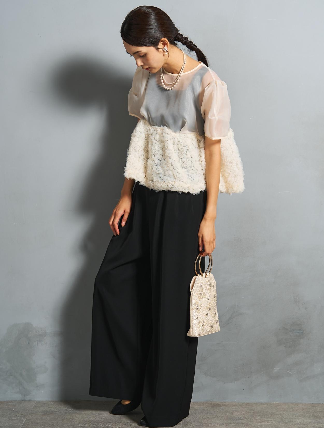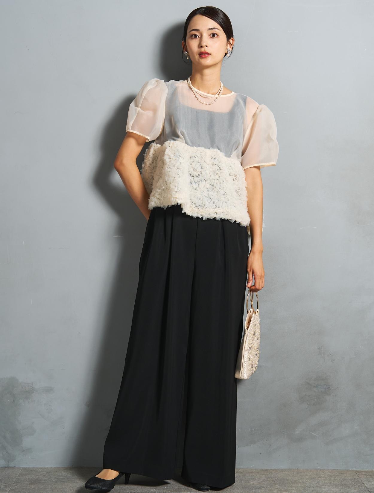 程よい光沢とハリのあるオーガンジーのブラウスが印象的なパンツドレス。バスト下は、チュールのフリル刺繍が凝ったディテール。タックを入れたペプラムは絶妙なボリュームで、むしろ華奢見えするデザインです。オーガンジーの透け感で、ボリュームが重たく見えないのもポイント。パフスリーブも透け感があり、ドロップショルダーが肩幅をカバーしてくれます。