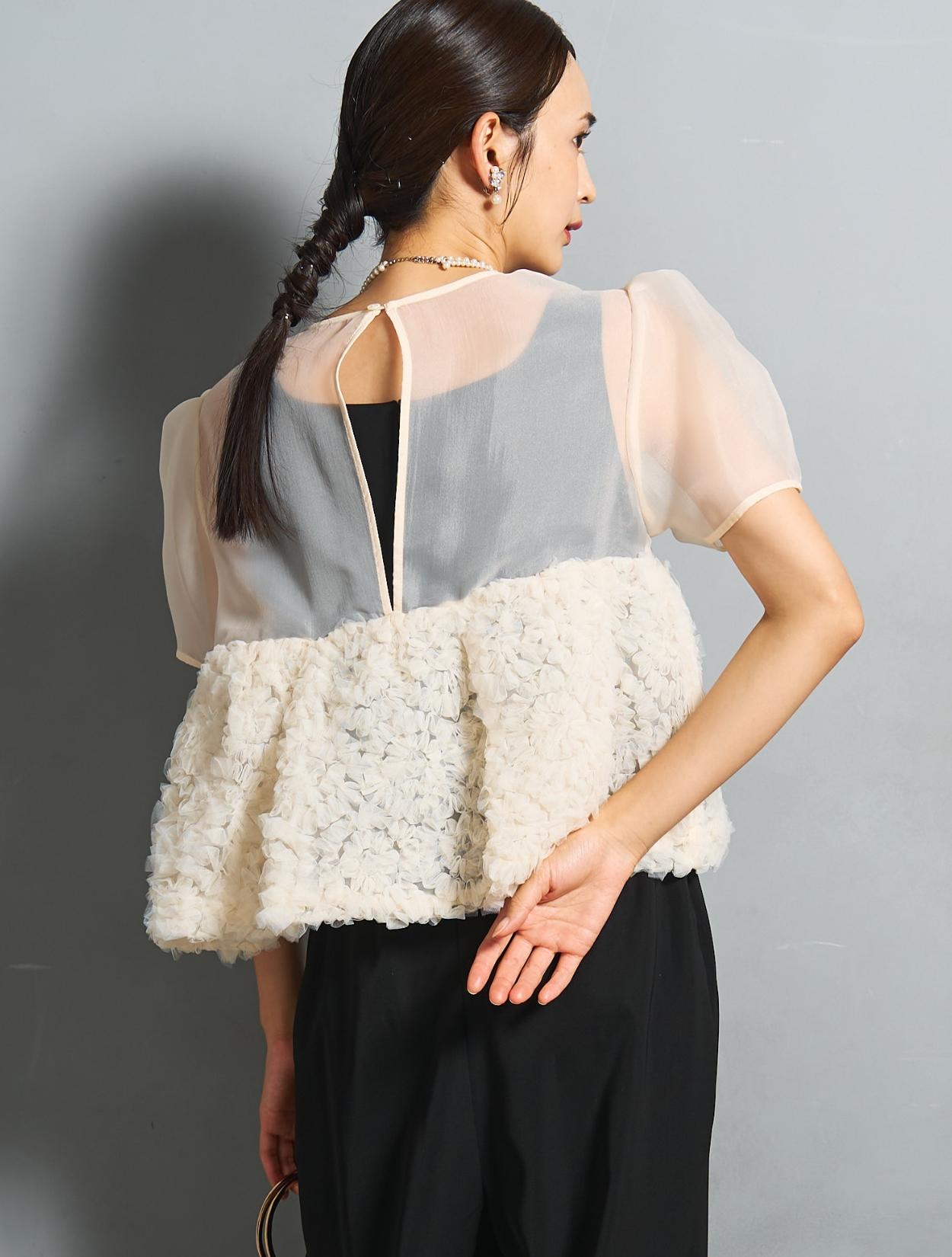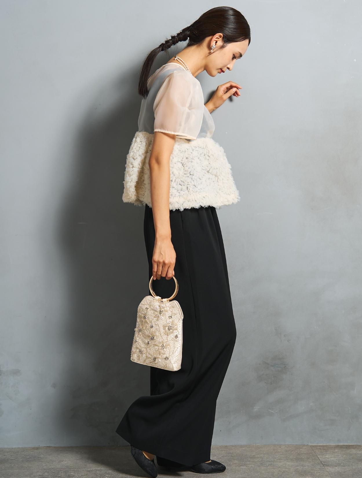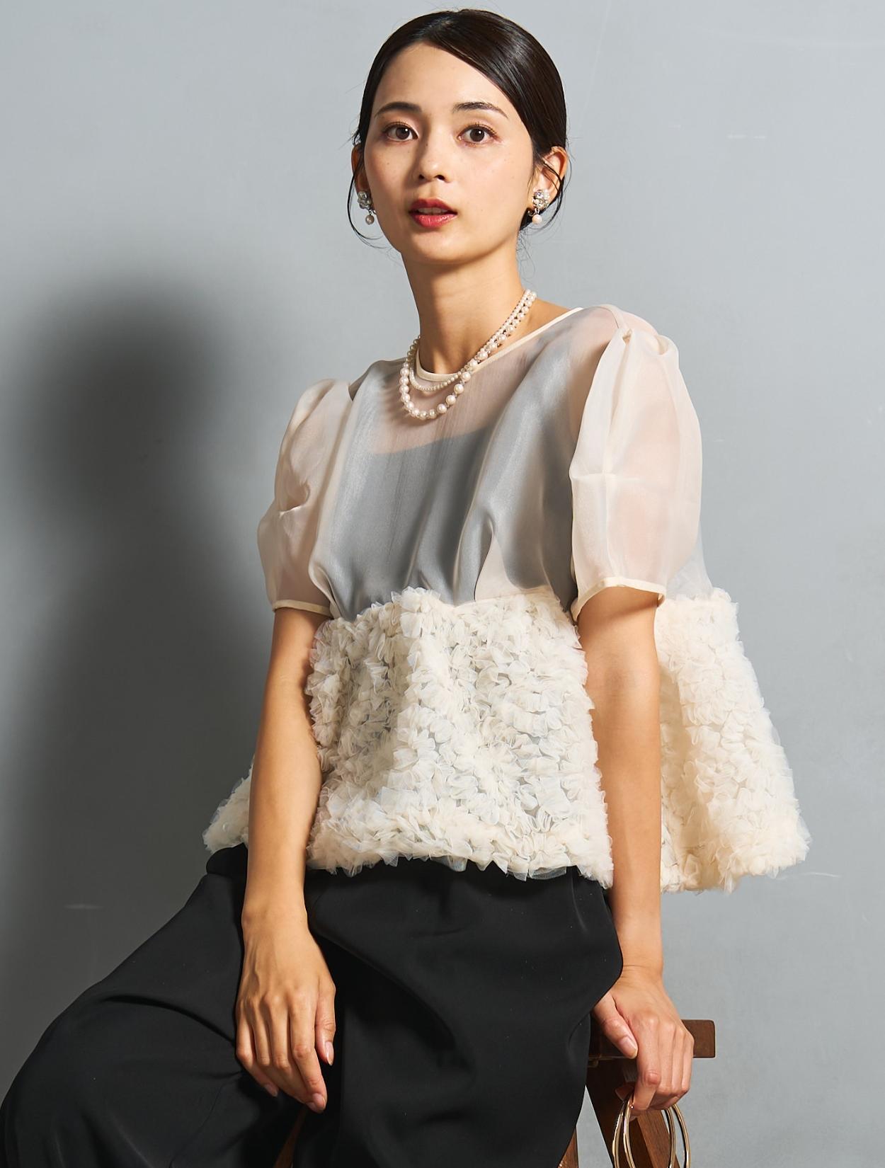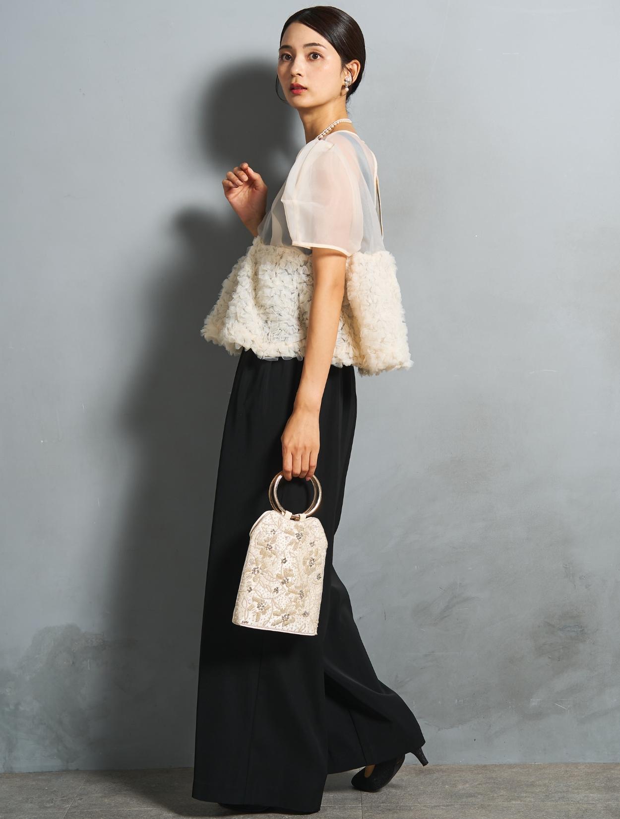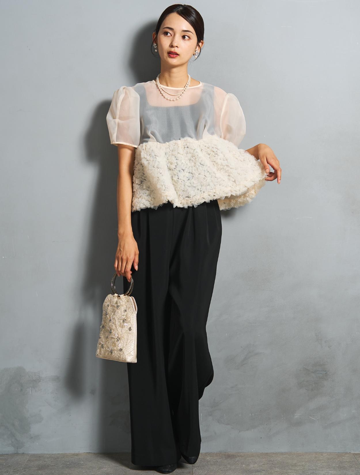 程よい光沢とハリのあるオーガンジーのブラウスが印象的なパンツドレス。バスト下は、チュールのフリル刺繍が凝ったディテール。タックを入れたペプラムは絶妙なボリュームで、むしろ華奢見えするデザインです。オーガンジーの透け感で、ボリュームが重たく見えないのもポイント。パフスリーブも透け感があり、ドロップショルダーが肩幅をカバーしてくれます。